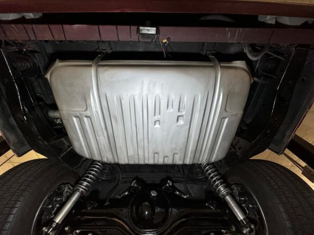 Fantastically clean underneath that starts with a new 21 gallon gas tank and includes adjustable coil overs all around with accompanying a 4 link in back. The dual exhaust have cut outs, and the long route encounters a pair of stainless steel mufflers before exiting in front of the rear wheels. There are no catalytic converters. There\'s no dirt, grease, or oil underneath and the knuckles and wheel components are spotless.