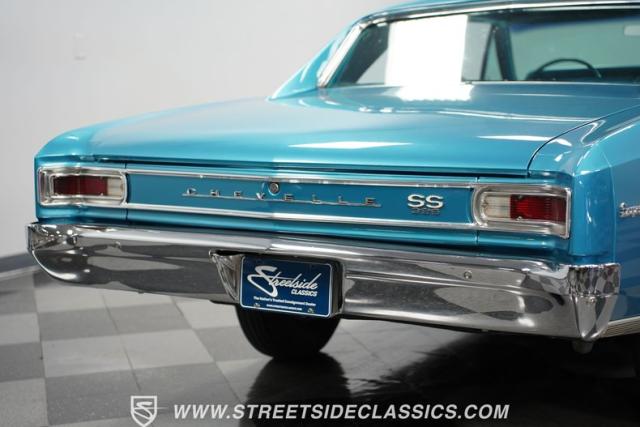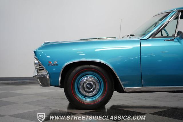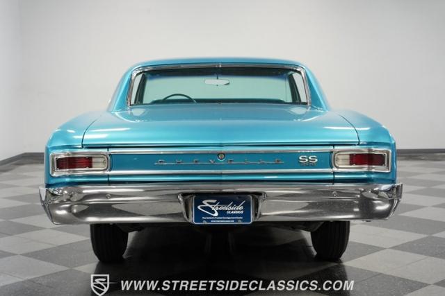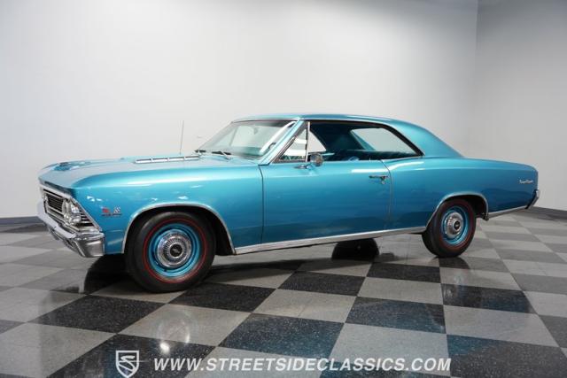 The 1966 Chevrolet Chevelle SS 396 in Marina Blue example showcases the iconic muscular lines that defined a generation of high-performance cars. The aggressive front end features dual headlights and a subtle hood bulge, hinting at the power within. Chrome accents highlight the clean body lines, flowing seamlessly from the grille to the sculpted rear quarters. SS badging proudly declares this Chevelle\'s performance pedigree. The stance is pure muscle, with 14-inch wheels wrapped in period-correct 7.75x14 tires. This Chevelle SS 396 represents the pinnacle of mid-60s American performance, combining raw power with timeless style.