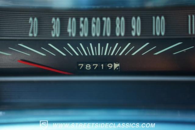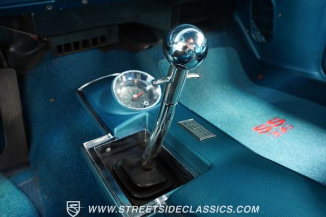 Blue vinyl bucket seats greet you upon entry, mirroring the exterior\'s bold hue. The cockpit is a driver-focused environment, with a floor-mounted shifter for the 4-speed Muncie transmission rising from the center console. An AM radio provides the soundtrack, while the knee-knocker tachometer informs you of the engine\'s revs. The dash pad fits snugly, complementing the well-executed interior paint. The original-style steering wheel and door panels maintain the factory feel, enhanced by nice carpets and a taut headliner.