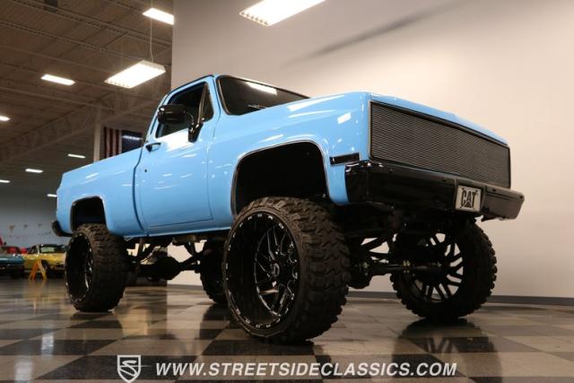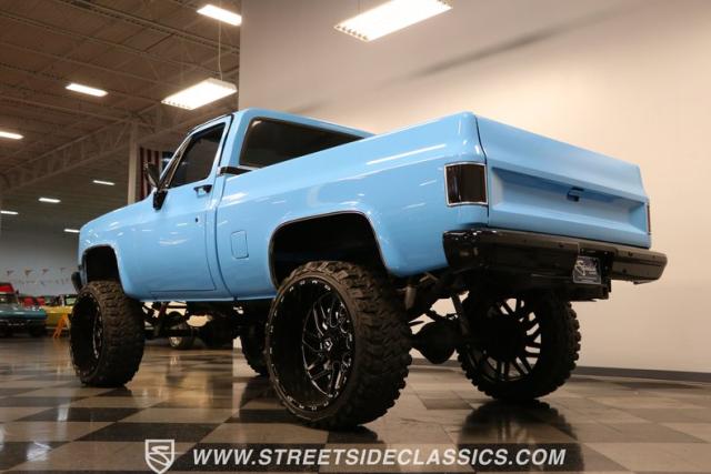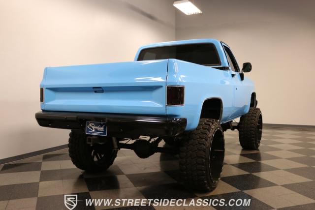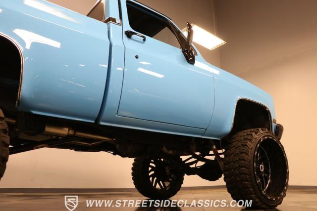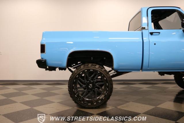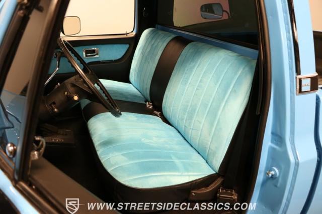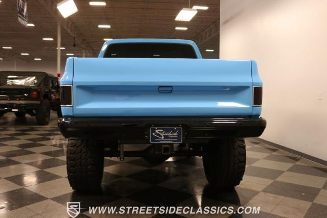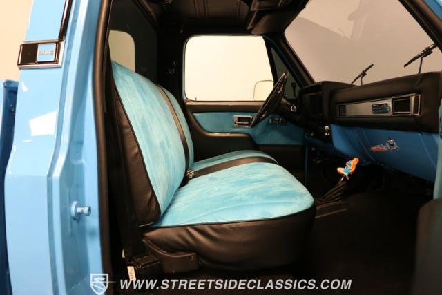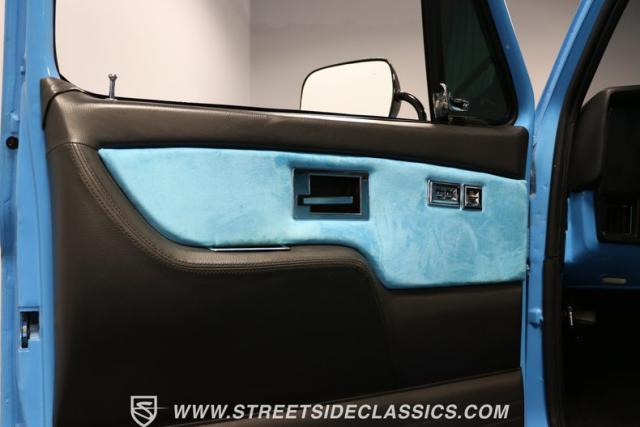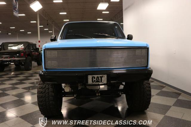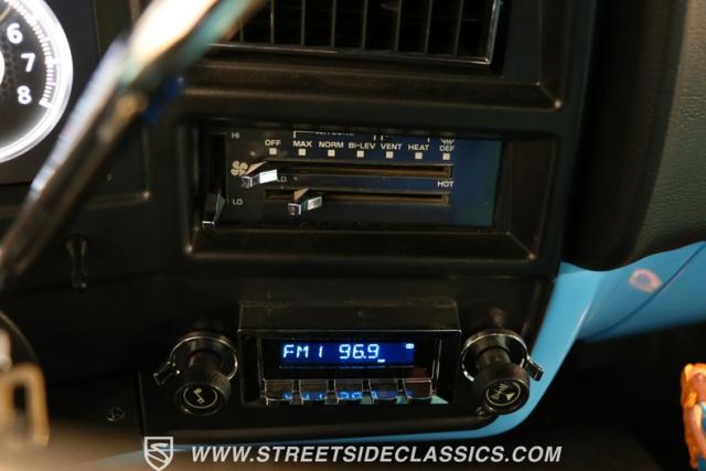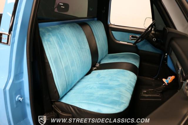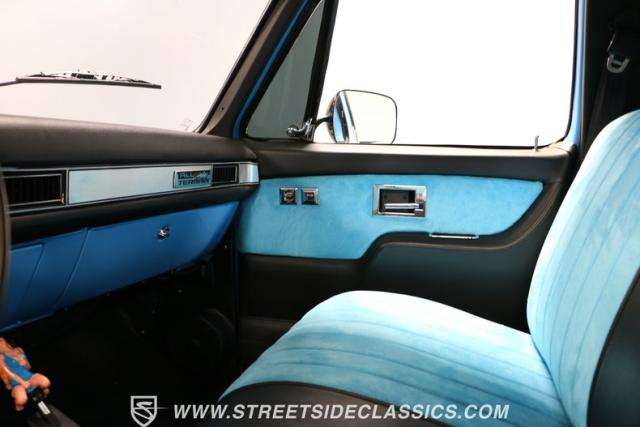 The color theme even continues in the engine bay, where the bright blue intake seems to be radiating from around all the dark black components. This has proper GM small block power, and this V8 inhales deeper with a Pro-Form four-barrel carburetor. It also exhales with added power and rumble as long tube headers feed the dual exhaust and Thrush mufflers. You\'ll also appreciate nice driving details, like the aluminum radiator with electric fans, power steering, power brakes, front discs, and an upgraded 700R4 four-speed automatic transmission. And of course, this custom is a true go-anywhere machine with a two-speed 4x4 transfer case, Rough Country shocks, a lift kit, and Gladiator X Comp M/T tires.