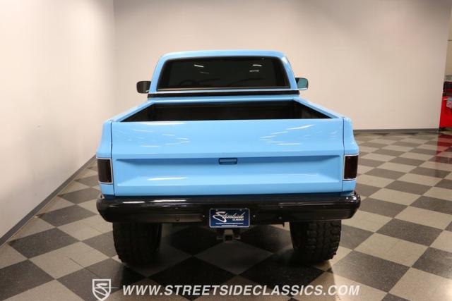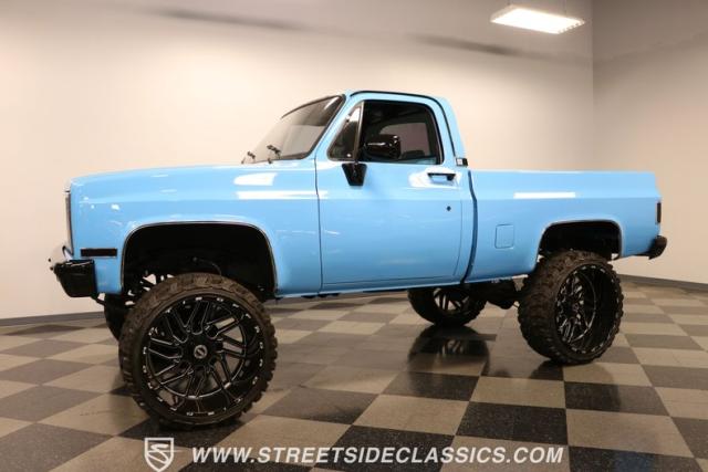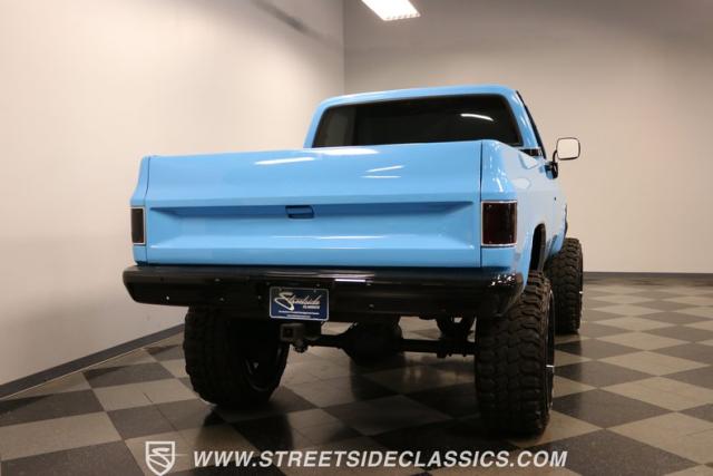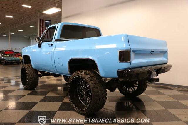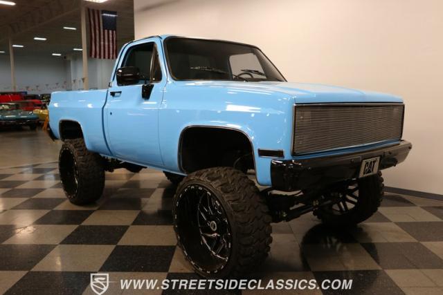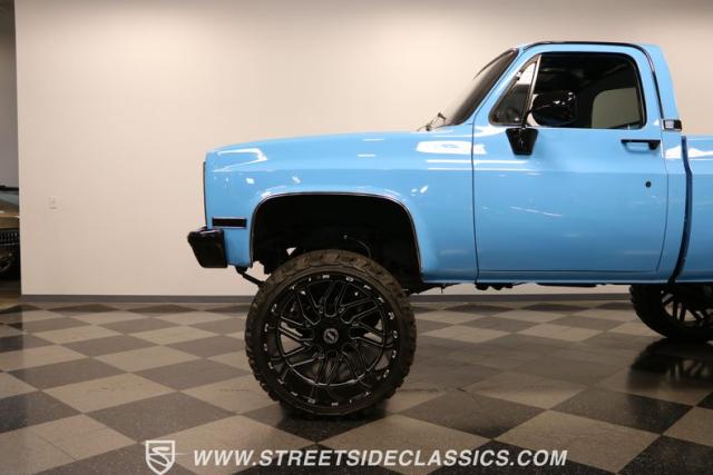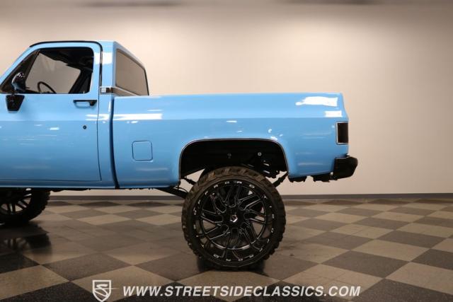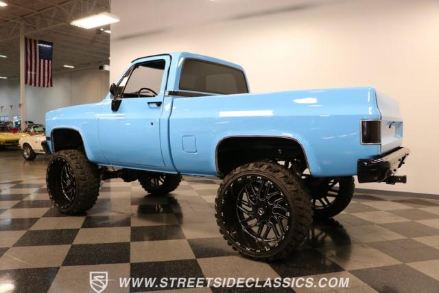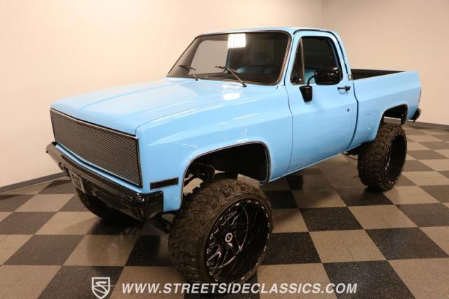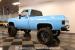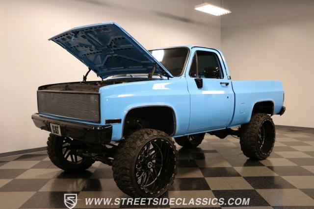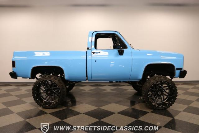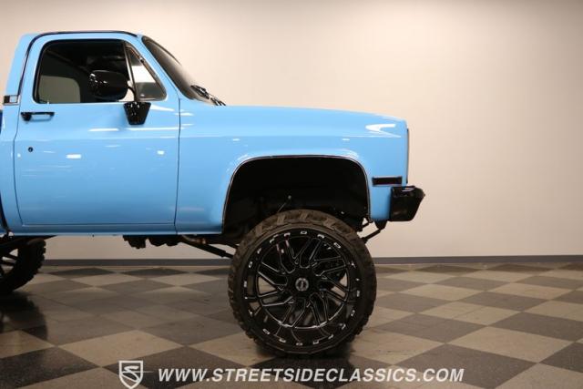 The color theme even continues in the engine bay, where the bright blue intake seems to be radiating from around all the dark black components. This has proper GM small block power, and this V8 inhales deeper with a Pro-Form four-barrel carburetor. It also exhales with added power and rumble as long tube headers feed the dual exhaust and Thrush mufflers. You\'ll also appreciate nice driving details, like the aluminum radiator with electric fans, power steering, power brakes, front discs, and an upgraded 700R4 four-speed automatic transmission. And of course, this custom is a true go-anywhere machine with a two-speed 4x4 transfer case, Rough Country shocks, a lift kit, and Gladiator X Comp M/T tires.