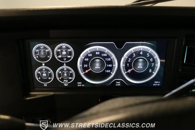 The interior continues the nice contrast of light blue and black. The two-tone is quite inviting with a fresh style to the carpeting, door panels, dash, and cloth bench seat. The full setup is nicely done with classic premium features like power windows, power locks, and a tilt steering column. These are joined by upgrades like R134a air conditioning, a retro-style AM/FM stereo with Bluetooth, and a cool overhead console with speakers. Plus, the AutoMeter full digital gauge cluster is one of the coolest modern upgrades around.
