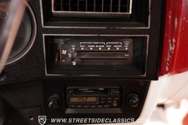 Inside the cab, you\'ll find a red vinyl bench with room for you and two of your burliest coworkers. The door panels look fresh, adding a touch of newness to the vintage vibe. Crank up your favorite tunes on the aftermarket cassette deck while the factory cruise control keeps you steady on those long hauls. One-handed maneuvering is a breeze with the power steering. The dash and original gauges have stood the test of time, telling the story of a truck that\'s seen its share of action.