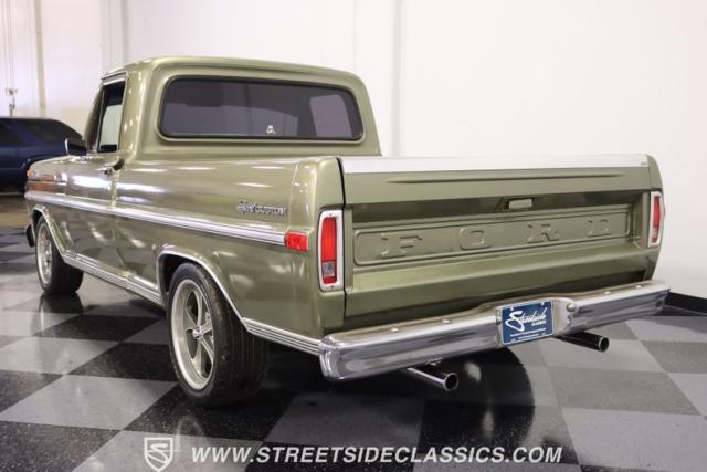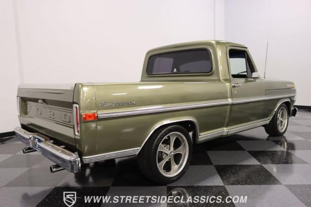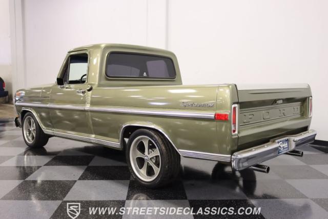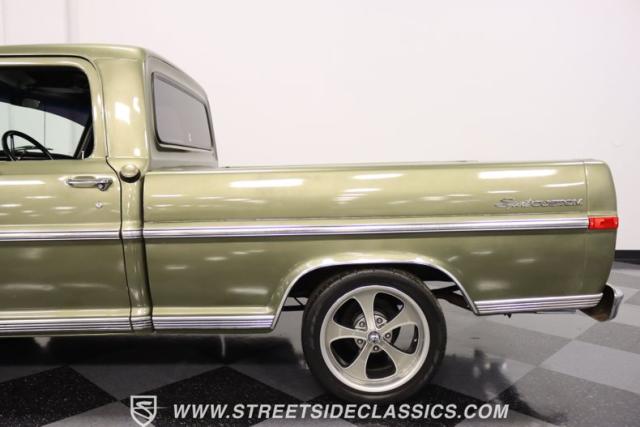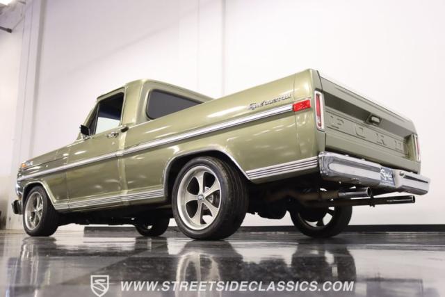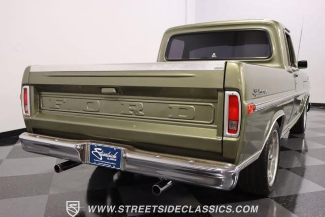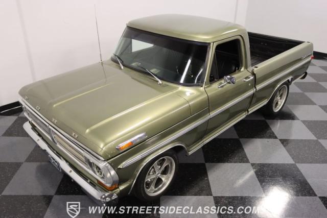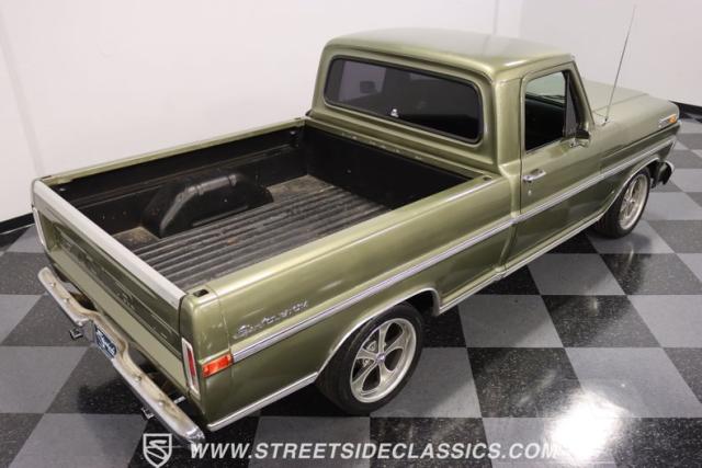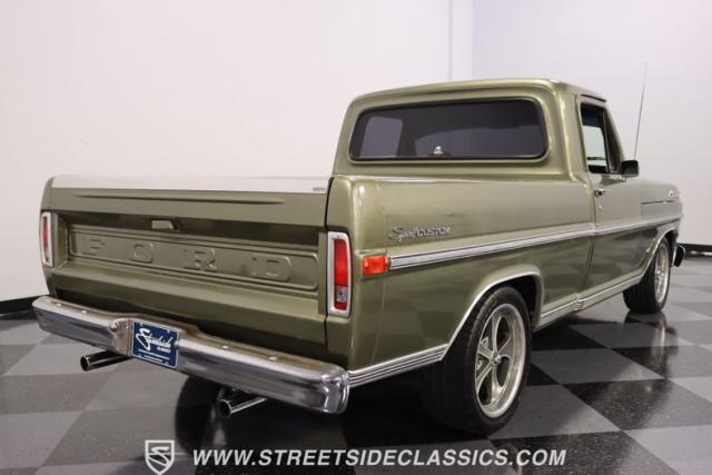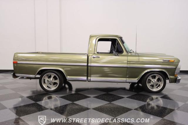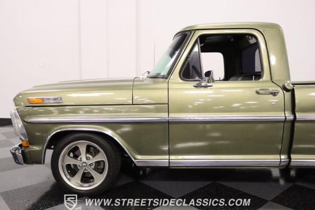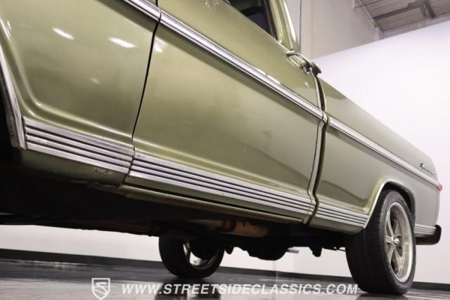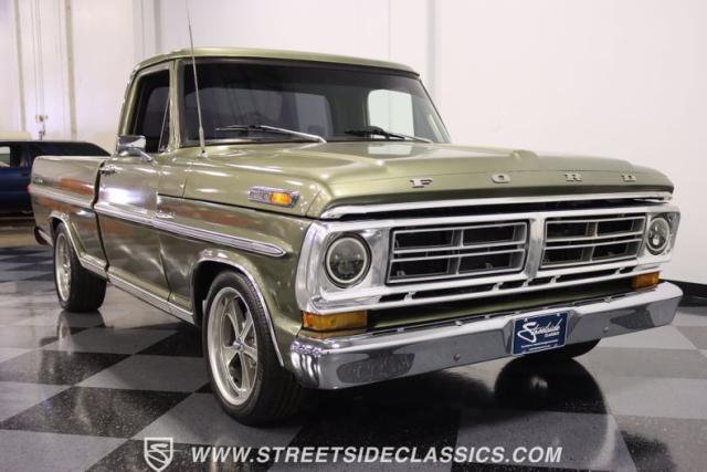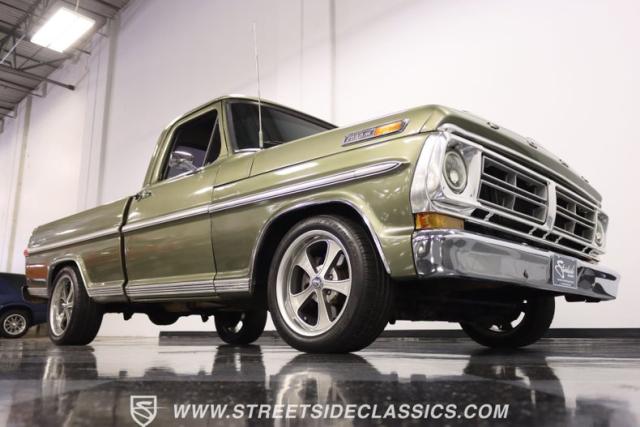 One of the most popular trucks of all time is the Ford F-100 and looking at this handsome 1972 Ford F-100 Sport Custom short bed pickup truck it is easy to understand why. The Sport Custom package comes with deluxe trim that includes side moldings, wheel opening moldings, rocker panel trim and chrome bumpers. This truck is painted in the factory color of Light Metallic Ginger (code R) that is showing a patina and a character that looks great on this truck\'s very straight body. A set of staggered Ridler wheels 17 inch front and 18 inch rear, enhance the look of this classic truck immensely.