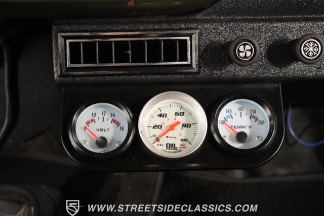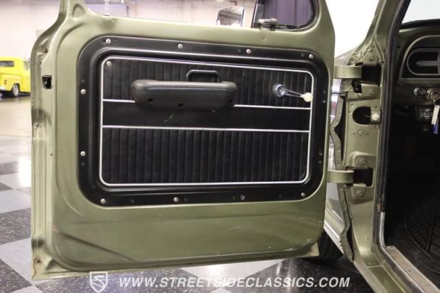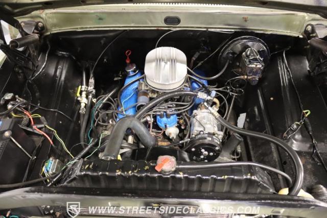 Inside the cab is clean with a black bench seat, upgraded steering wheel and a set of gauges under the dash that monitor volts, oil pressure and temperature. A custom molded black headliner holds an AM/FM/CD/AUX Bluetooth stereo and speakers. The original Ford AM radio is still in the dash. Additionally, this truck is fitted with cold air conditioning charged with modern 134a freon.