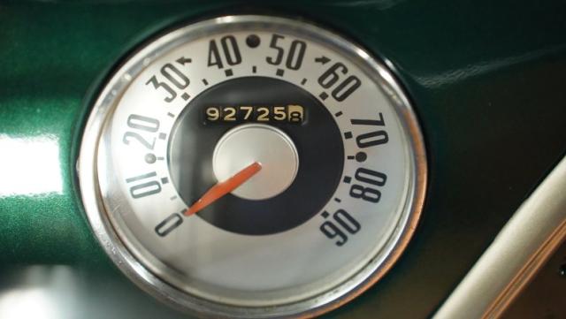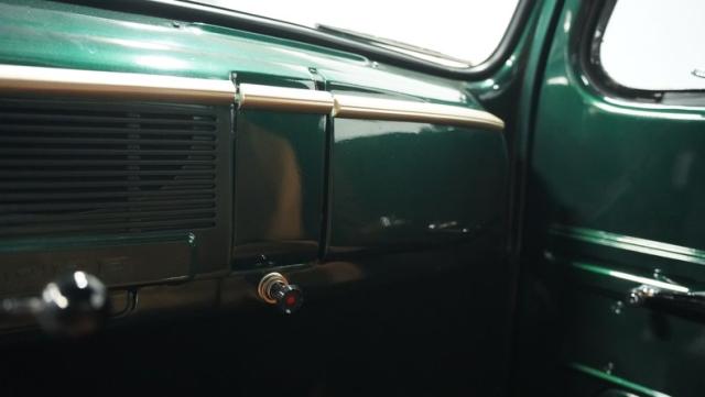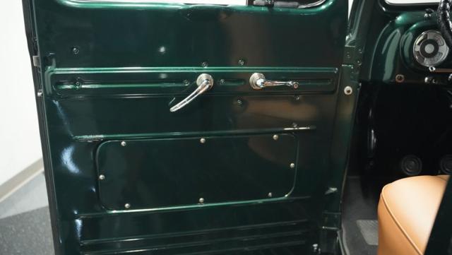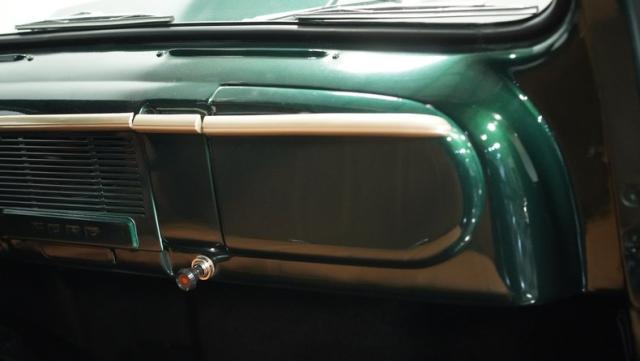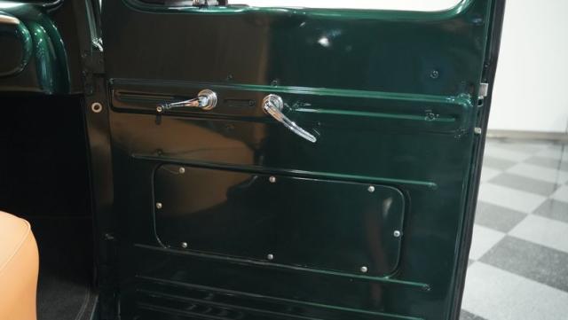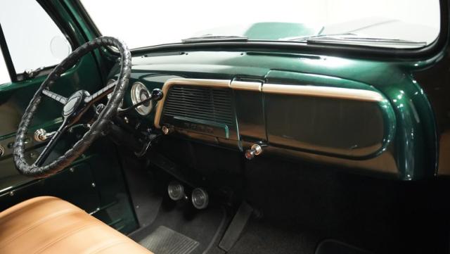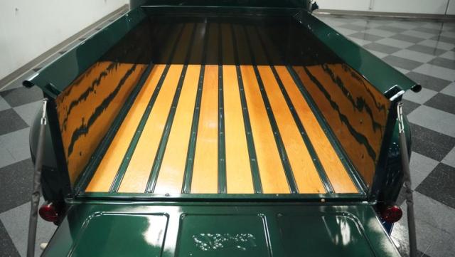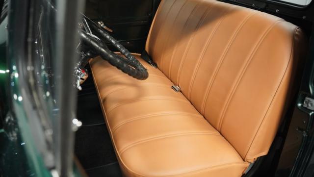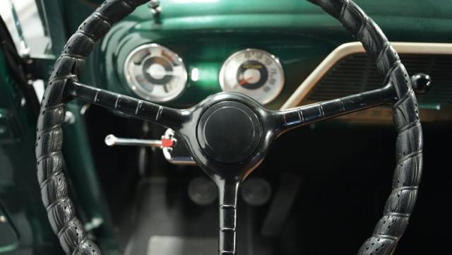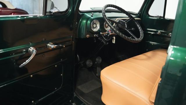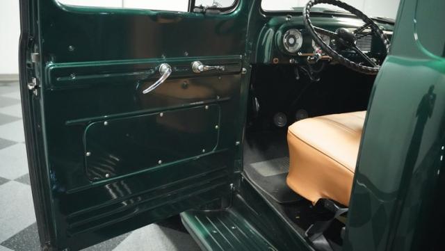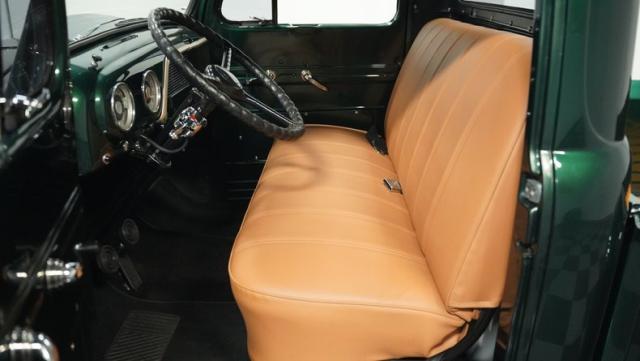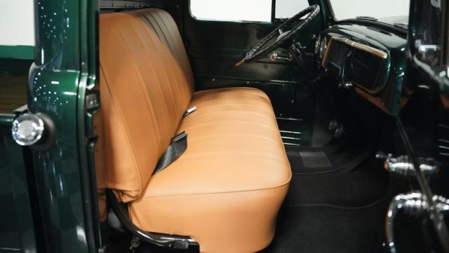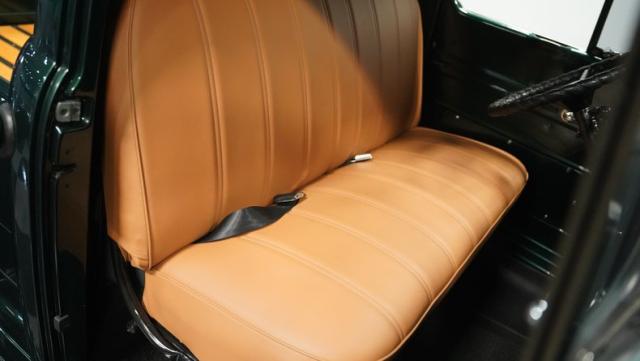 Inside, the cabin has been completely overhauled with comfort and style in mind. The interior is color-matched to the striking Emerald Green Metallic exterior, creating a cohesive look throughout. The bench seat, wrapped in tan vinyl upholstery, provides a stylish contrast and a plush perch for cruising. A new headliner and rear tool storage tray add to the fresh feel of the interior. The dash houses updated gauges that blend seamlessly with the classic design, while modern seat belts offer added safety without compromising the vintage vibe. The column-mounted shifter for the 3-speed manual transmission is right where it should be, ready for action. Pre-wiring for a radio, heat, or A/C has been added, allowing for easy upgrades down the road.