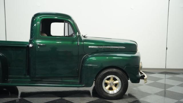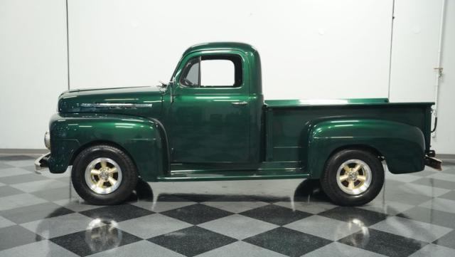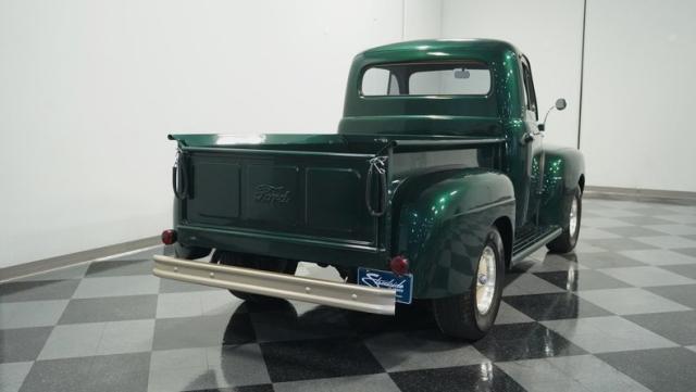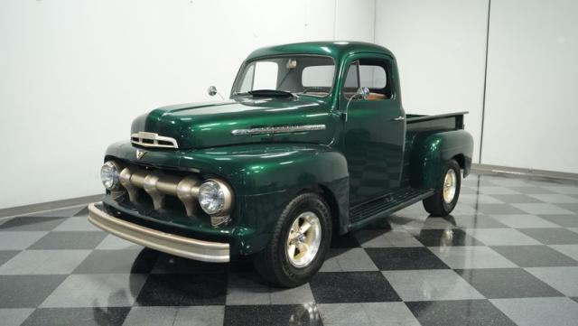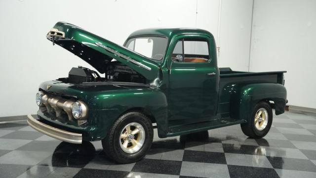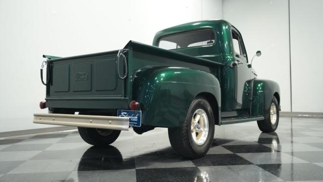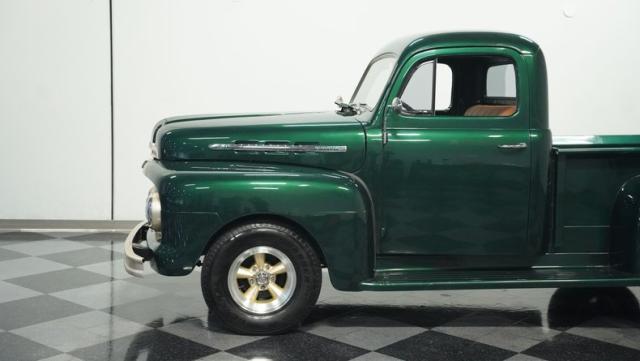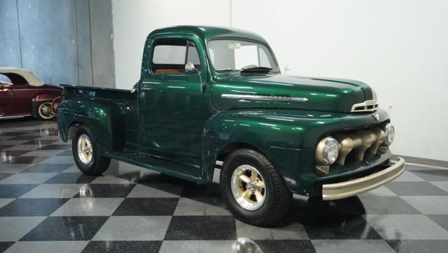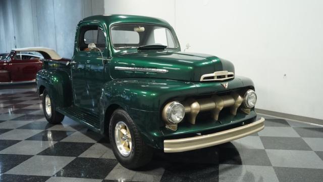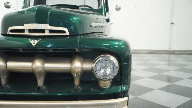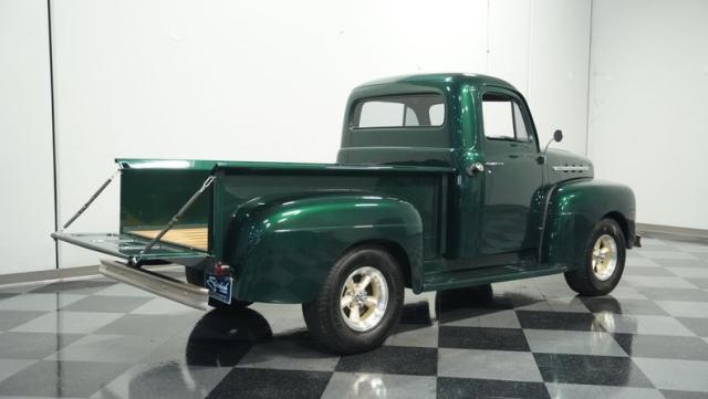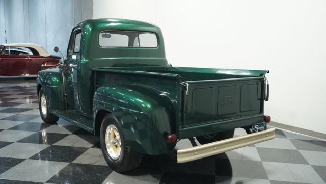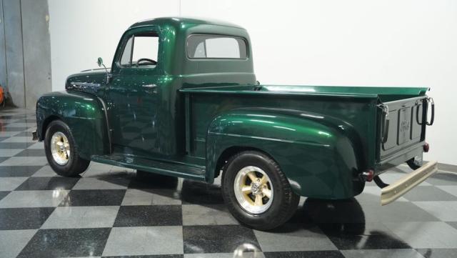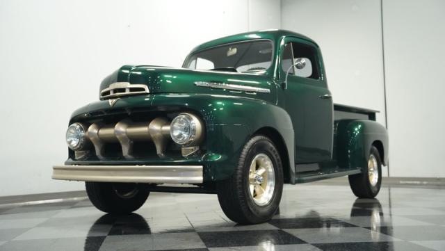 This 1951 Ford F-1 pickup truck rolls up with a bold Emerald Green Metallic paint job that\'ll make you stop and stare. Bronze accents complement the deep green, creating a striking two-tone effect that sets this classic hauler apart. The body lines are crisp and clean, showcasing Ford\'s iconic post-war design. Riding on 15\" American Racing wheels wrapped in meaty 255/70R15 tires, this F-1 has a powerful stance that means business. The wood bed floor has been refinished to a high shine, adding a touch of warmth to the truck\'s rugged exterior. Tinted side and rear glass complete the look, giving this vintage workhorse a touch of modern flair.