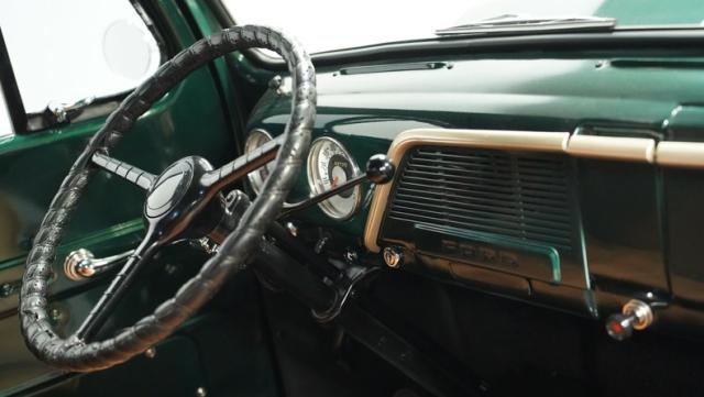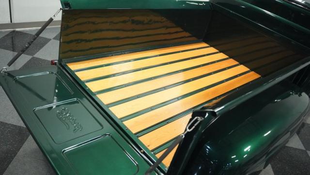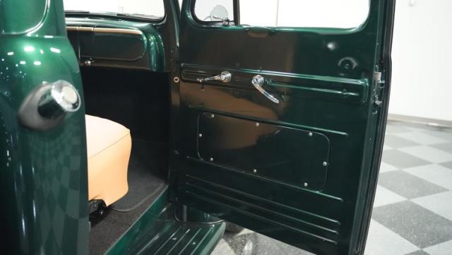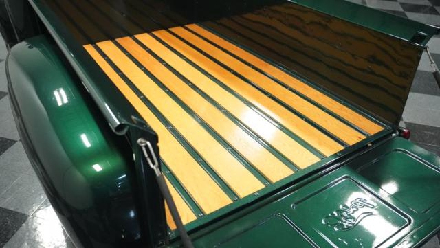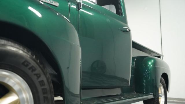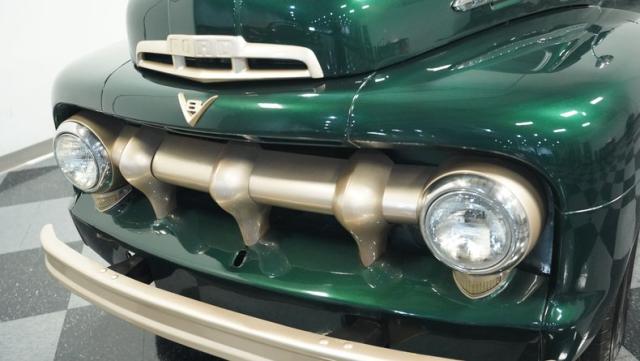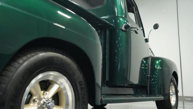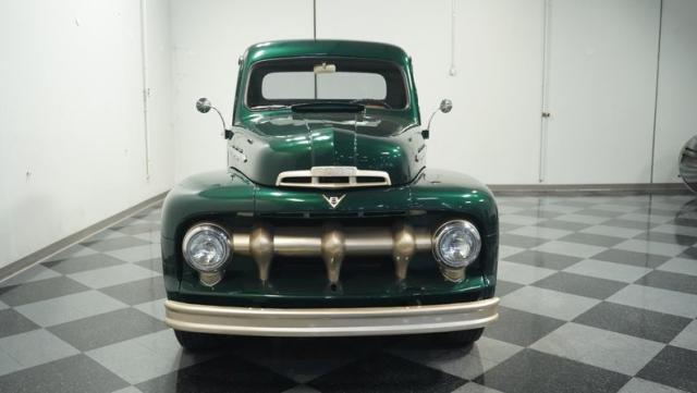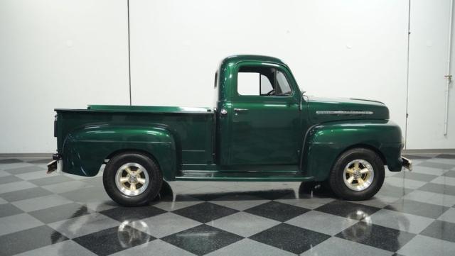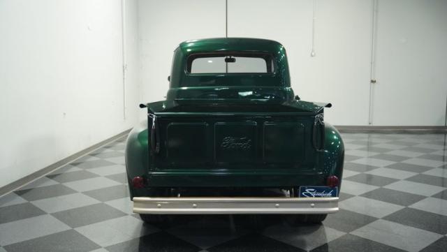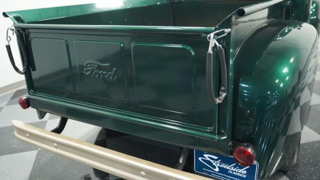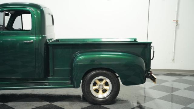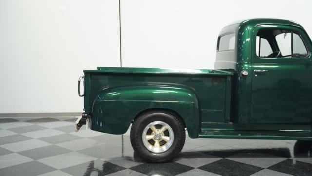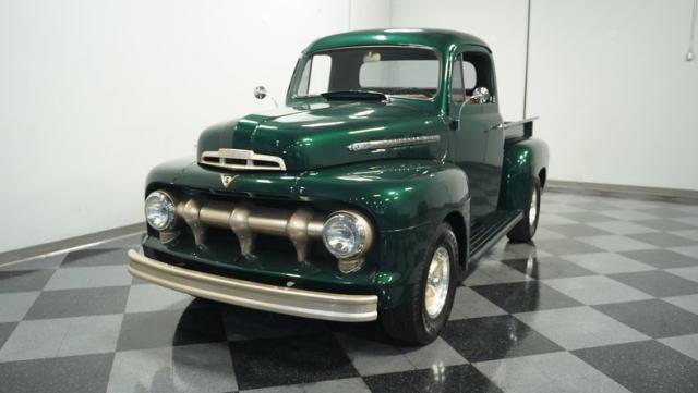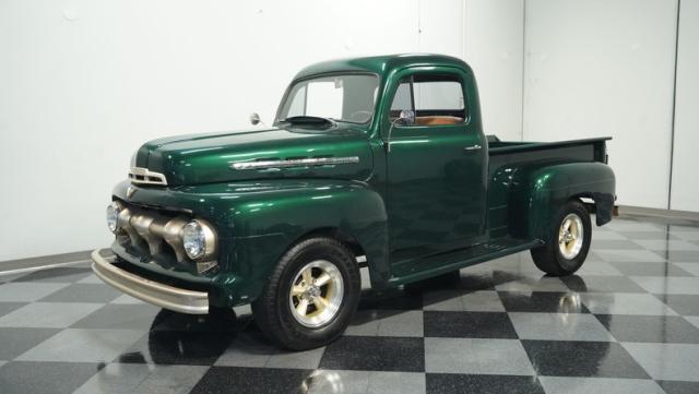 This 1951 Ford F-1 pickup truck rolls up with a bold Emerald Green Metallic paint job that\'ll make you stop and stare. Bronze accents complement the deep green, creating a striking two-tone effect that sets this classic hauler apart. The body lines are crisp and clean, showcasing Ford\'s iconic post-war design. Riding on 15\" American Racing wheels wrapped in meaty 255/70R15 tires, this F-1 has a powerful stance that means business. The wood bed floor has been refinished to a high shine, adding a touch of warmth to the truck\'s rugged exterior. Tinted side and rear glass complete the look, giving this vintage workhorse a touch of modern flair.