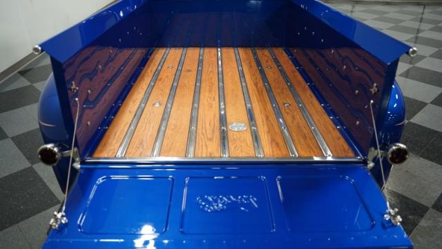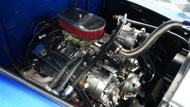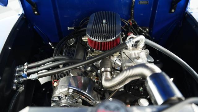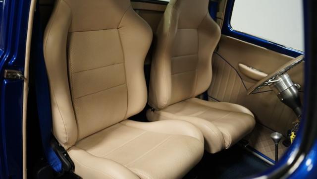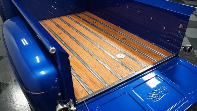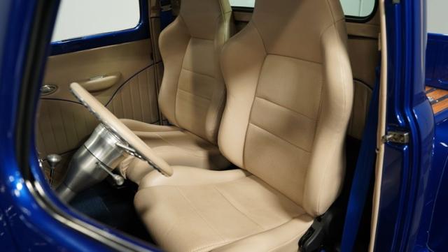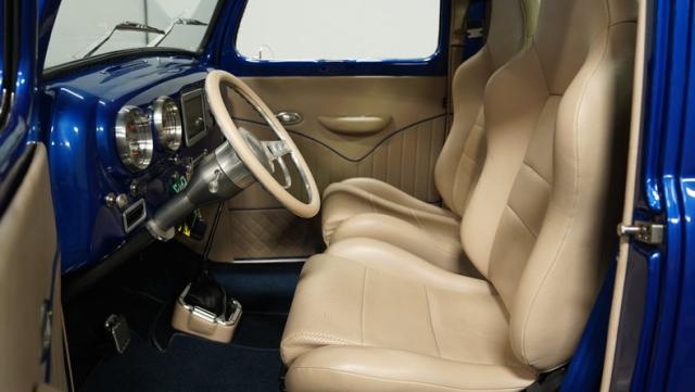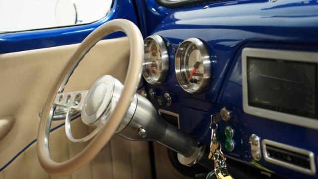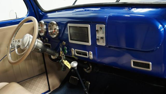 Under the hood, gone is the aged Flathead V-8 of yesteryear. In its place, we find a GM Goodwrench crate 350 cubic-inch V-8 sporting a dual-single barrel carburetor, polished Edelbrock intake, FITech Go Street EFI system, as well as shorty style headers. That power is routed through a 700R4 four-speed automatic transmission before being sent off to a nine-inch rear end.