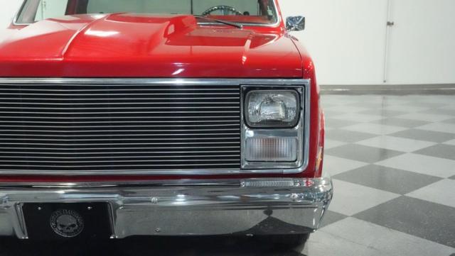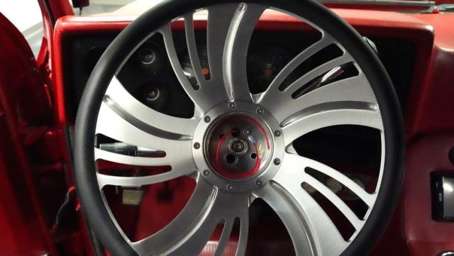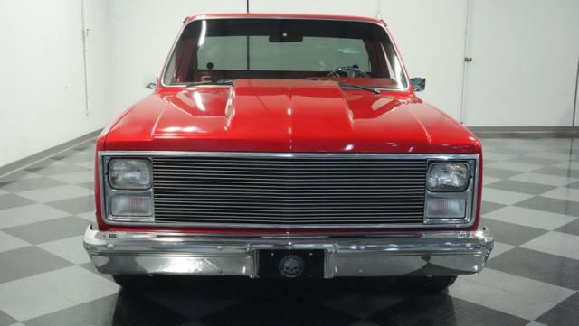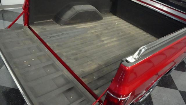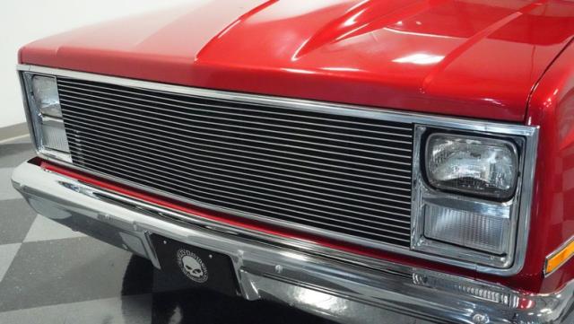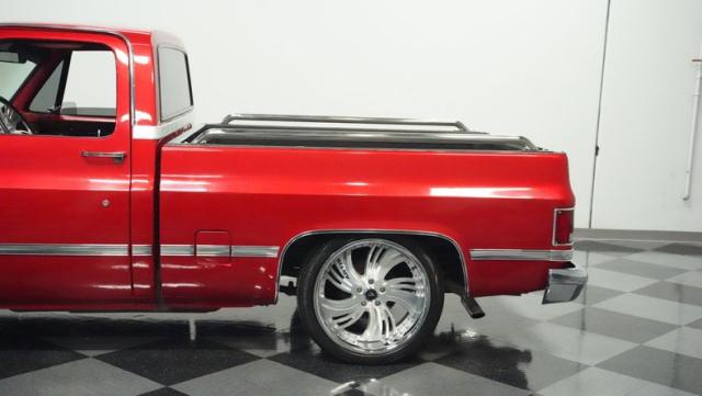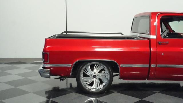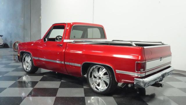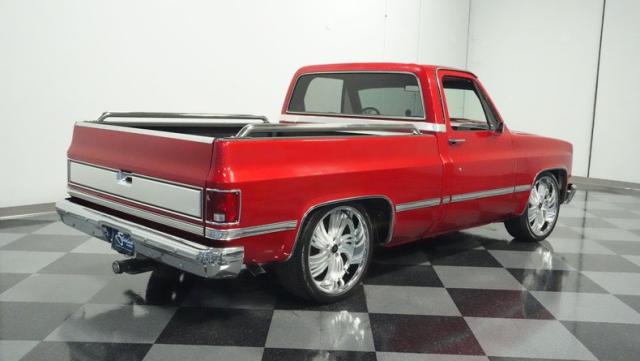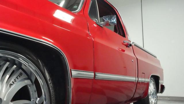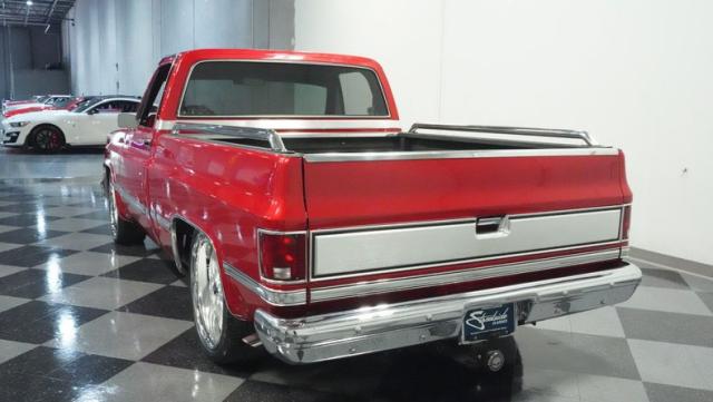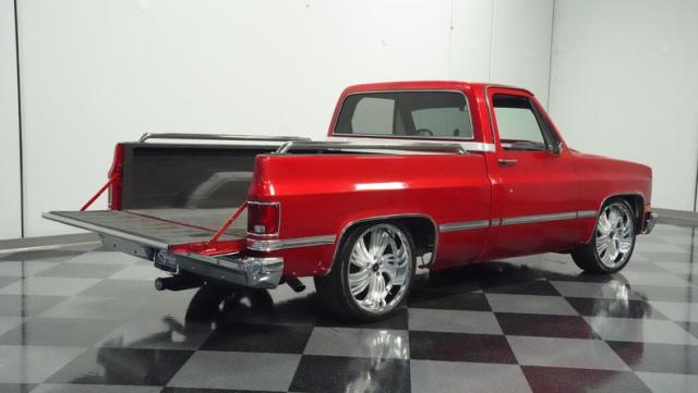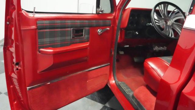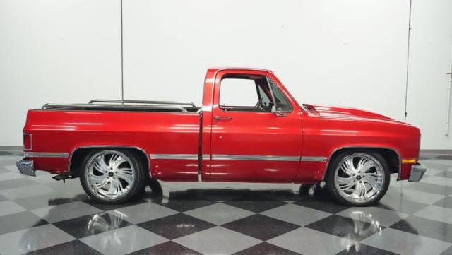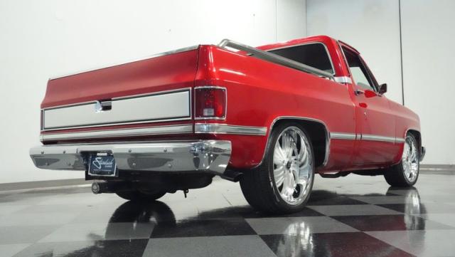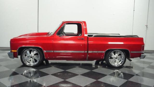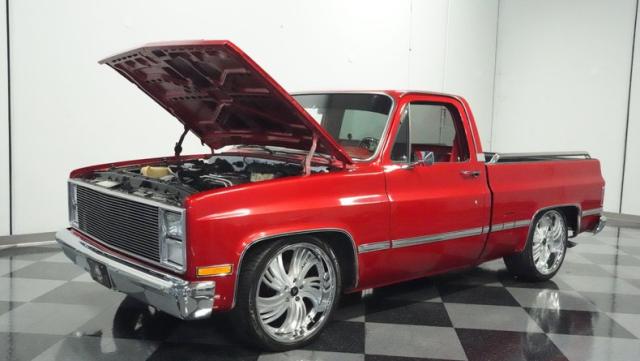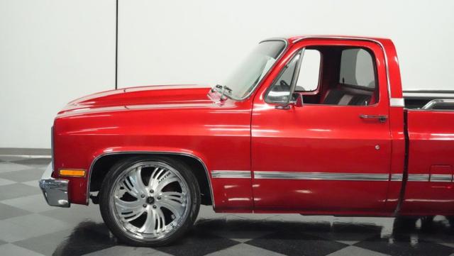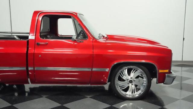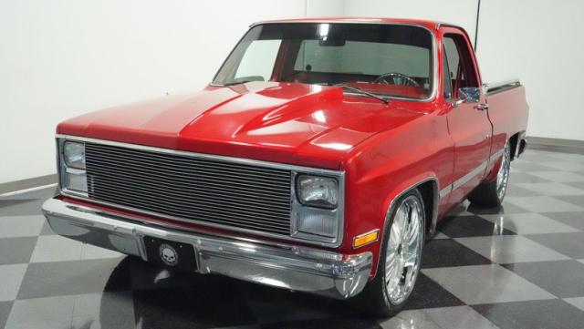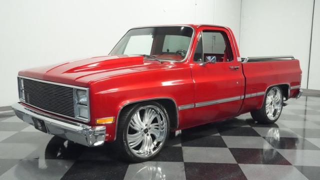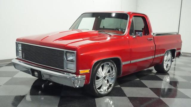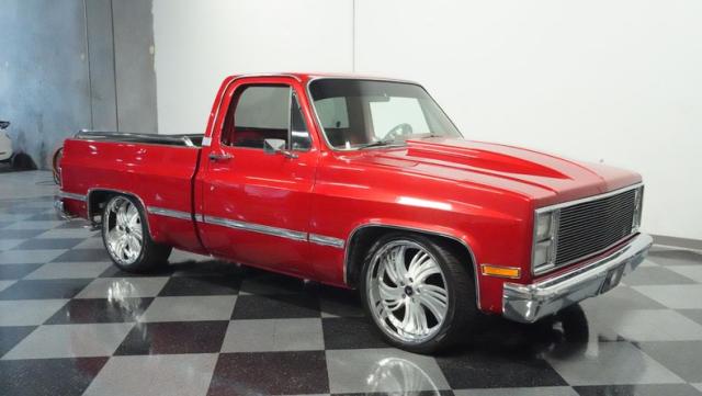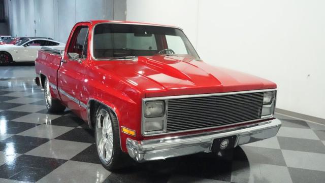 This 1985 Chevrolet C10 brings the heat with its candy apple red paint job. The vibrant hue catches light like a freshly polished apple, giving this classic truck a modern edge. A cowl hood adds muscle to the front end, while 22-inch Artis wheels fill out the lowered stance. Wrapped in 265/35ZR22 front and 285/35R22 rear tires, this C10 hugs the road with authority. Custom touches like the bed liner and tow hitch receiver prove this beauty hasn\'t forgotten its workhouse roots.