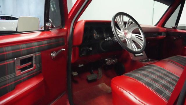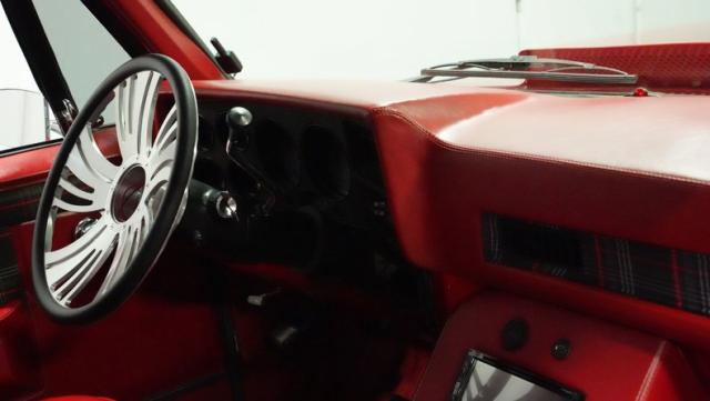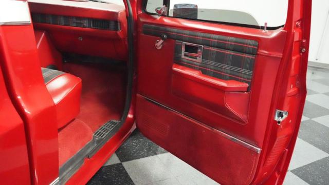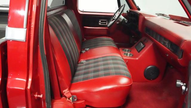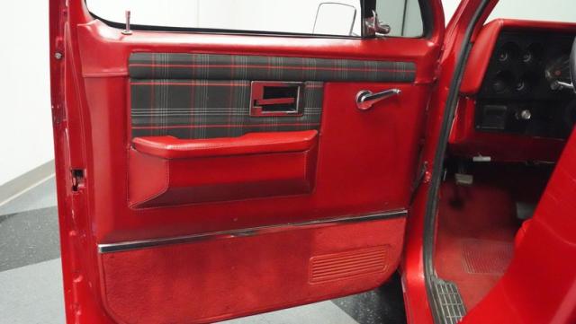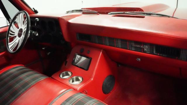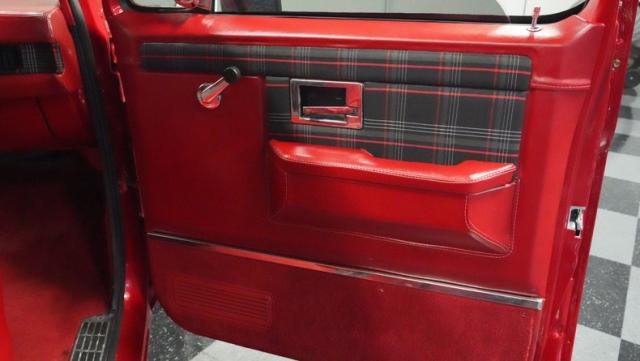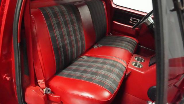 This 1985 Chevrolet C10 fuses classic truck DNA with custom upgrades. Its candy apple red exterior, plaid-accented interior, and rumbling V8 engine create a unique driving experience. Call today!