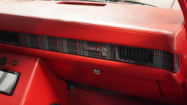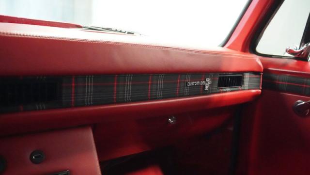 Inside, the cabin mixes comfort with style. A custom burgundy and plaid interior scheme covers the bench seat, door panels, and dash insert. It\'s an unexpected twist that adds personality to the classic truck design. The center console houses a double DIN head unit with Bluetooth connectivity, perfect for cruising tunes. USB ports keep your devices charged, while cup holders stand ready for your favorite road trip beverage.