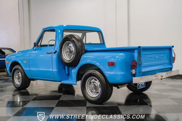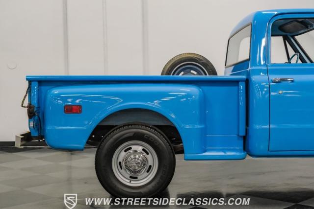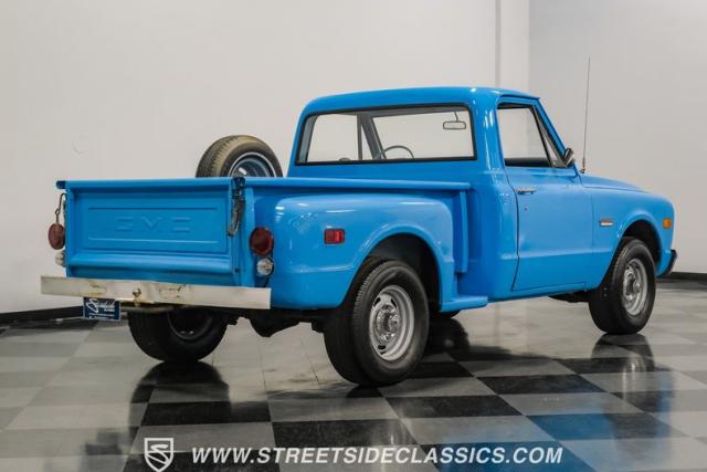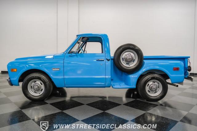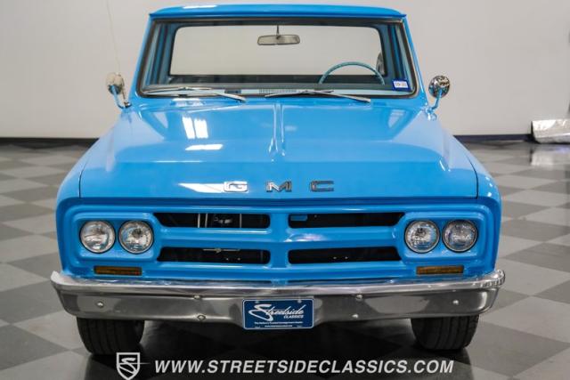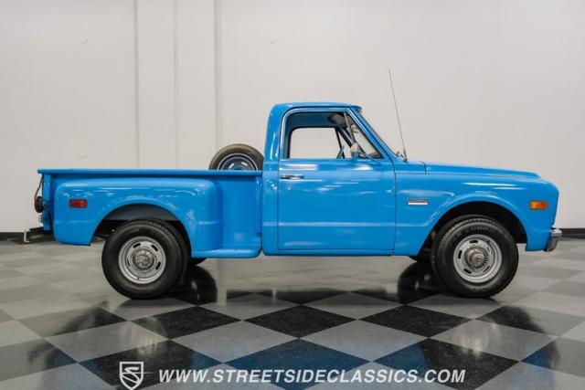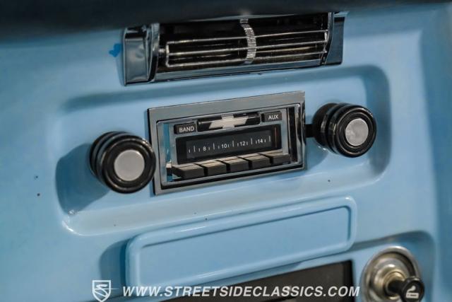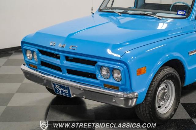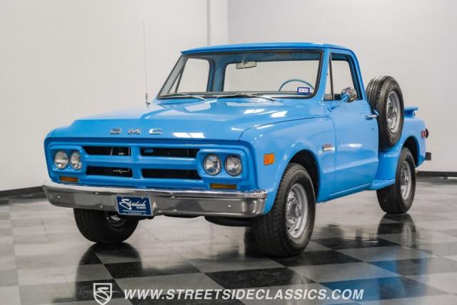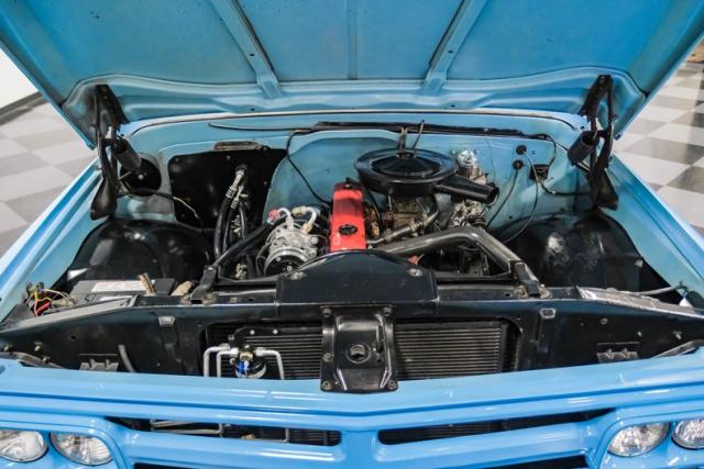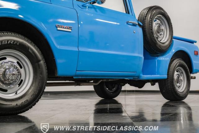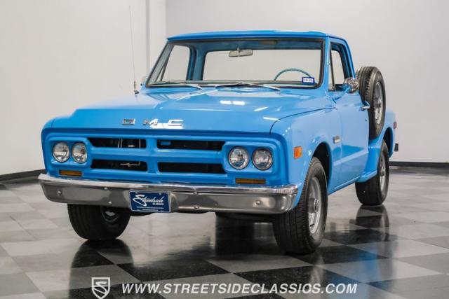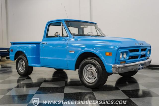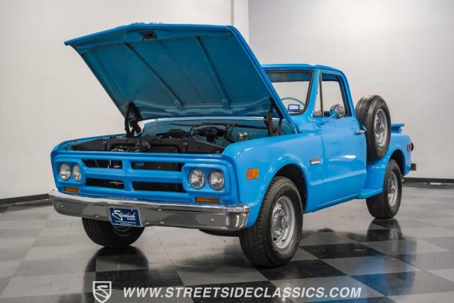 The 1968 GMC C10 Stepside sports a light blue exterior that makes a bold impression. A full repaint job completed about a decade ago gives this classic truck a fresh, clean appearance. The stepside bed design adds a distinctive flair, complemented by an authentic wood bed floor that speaks to the truck\'s utilitarian roots. Chrome hubs accent the 15-inch wheels, which are wrapped in meaty 255/70R15 Cooper tires. The front grille and headlight bezels, painted to match the body, create a cohesive look that amplifies the truck\'s visual appeal.