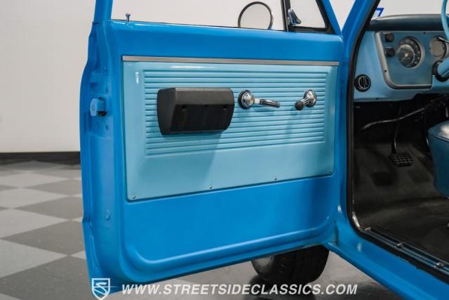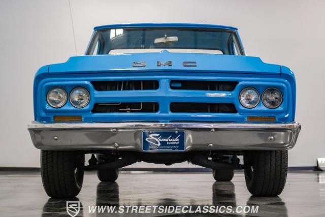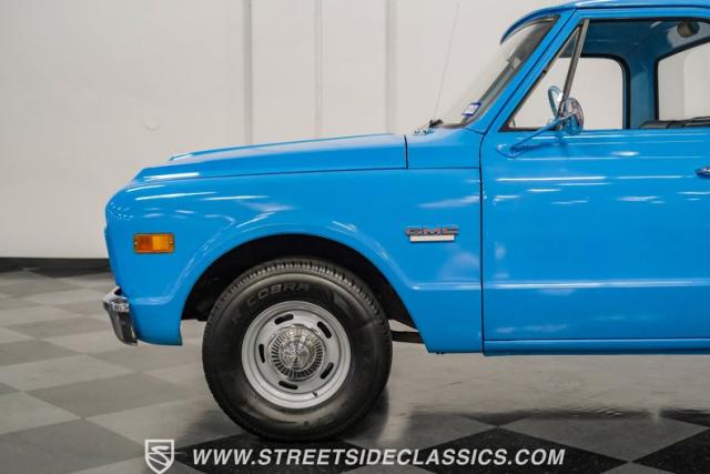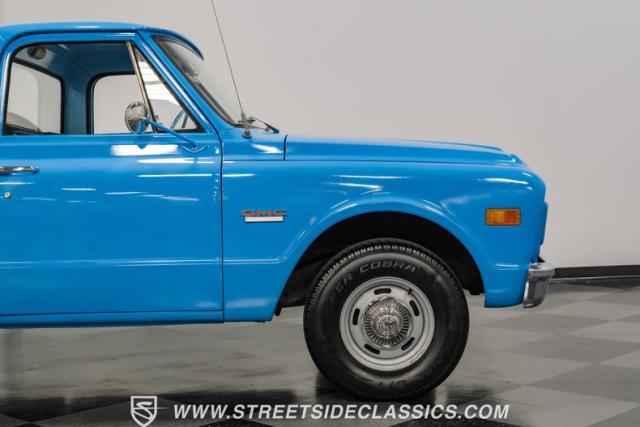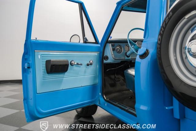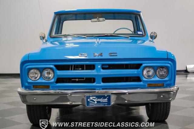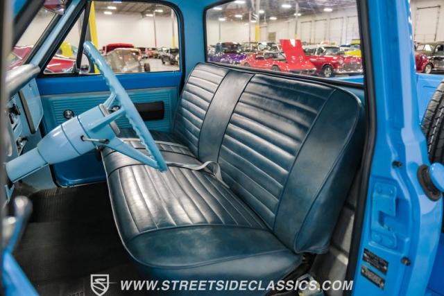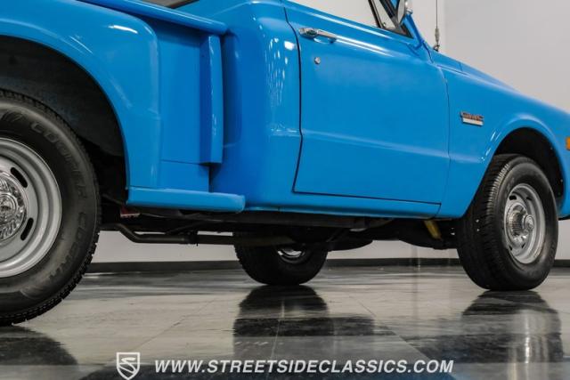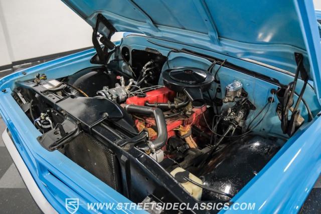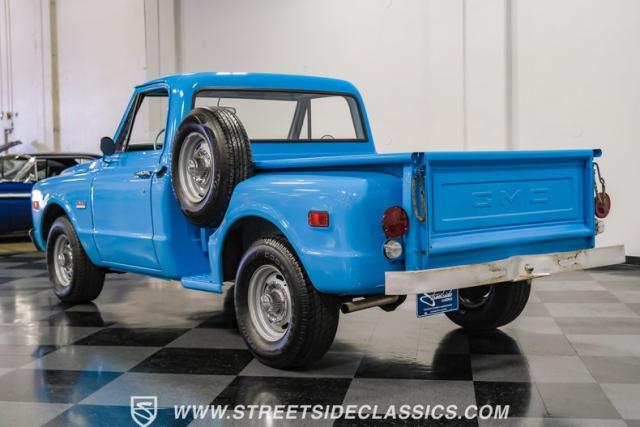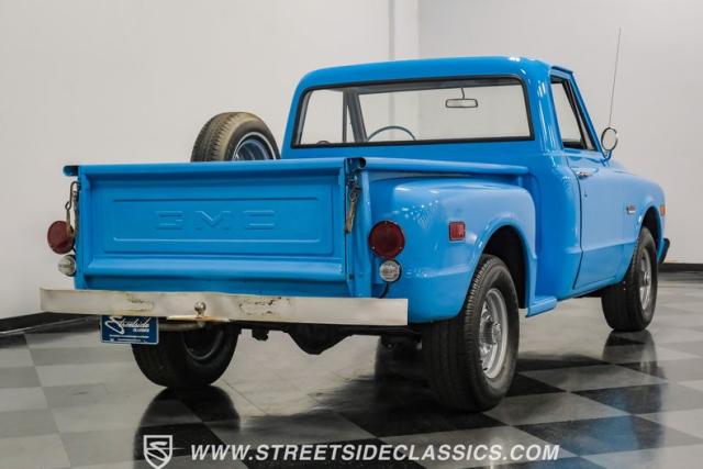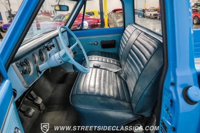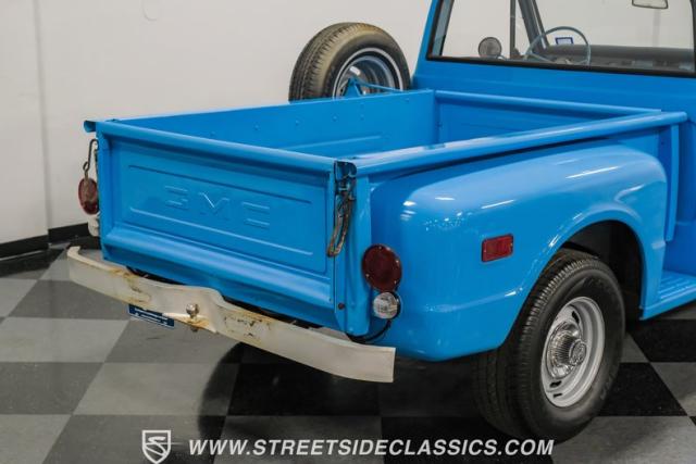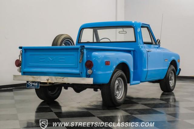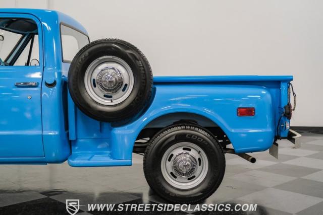 The 1968 GMC C10 Stepside sports a light blue exterior that makes a bold impression. A full repaint job completed about a decade ago gives this classic truck a fresh, clean appearance. The stepside bed design adds a distinctive flair, complemented by an authentic wood bed floor that speaks to the truck\'s utilitarian roots. Chrome hubs accent the 15-inch wheels, which are wrapped in meaty 255/70R15 Cooper tires. The front grille and headlight bezels, painted to match the body, create a cohesive look that amplifies the truck\'s visual appeal.