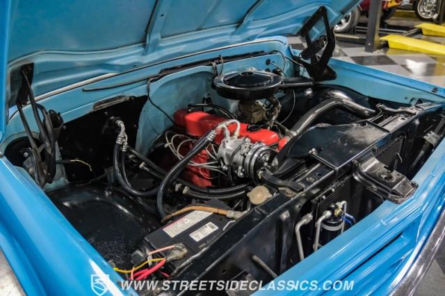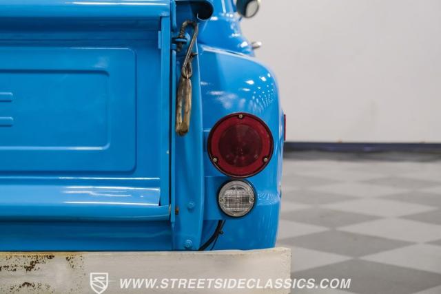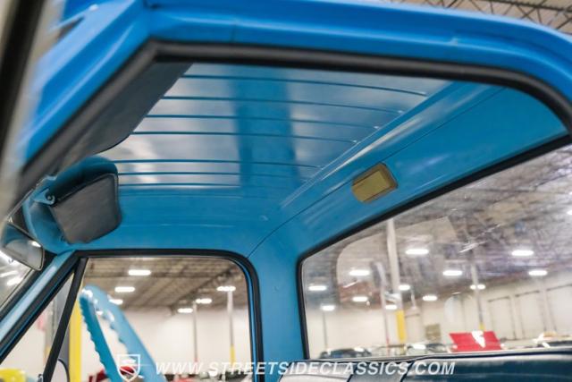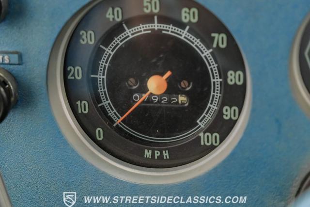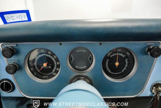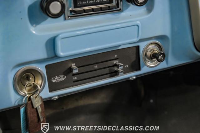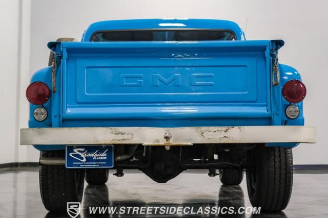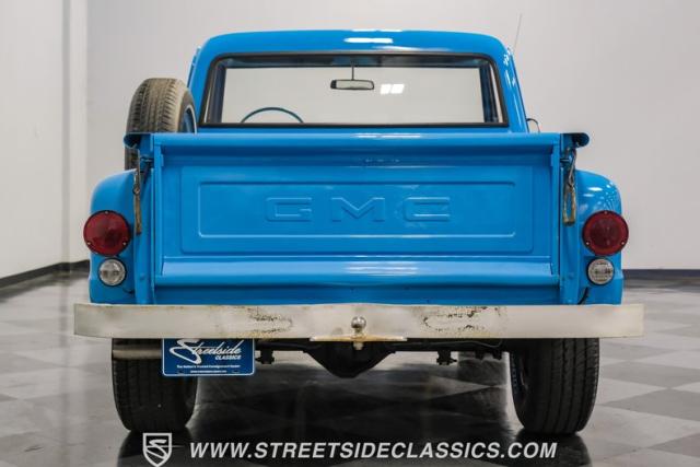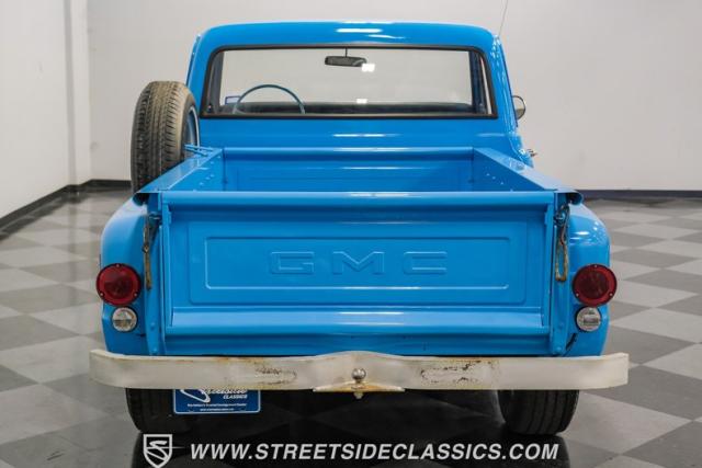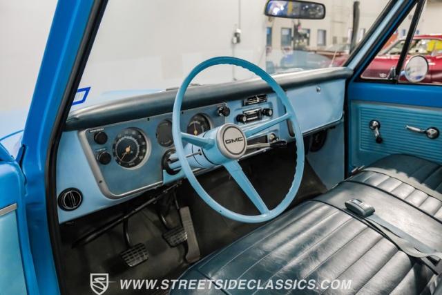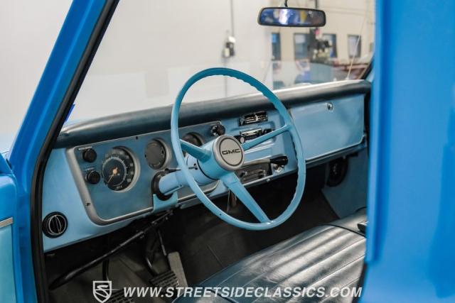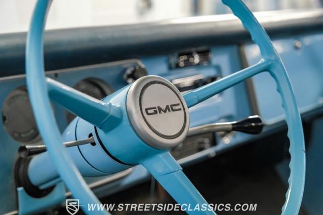 Inside, blue vinyl covers the bench seat, offering ample space for three. A black vinyl floor mat protects the cab\'s flooring. The dashboard maintains its original layout, featuring stock GMC gauges that provide essential information at a glance. A Retro Sounds AM/FM/Aux radio bridges the gap between classic aesthetics and modern functionality. The crowning feature of the interior is the Vintage Air AC system, installed in July 2024. This high-performance cooling system delivers exceptional comfort, even in the hottest summer months.