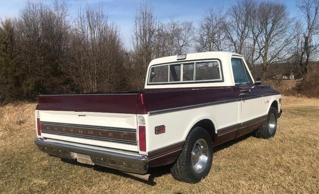 1972 Chevrolet C-10 short bed pick up with a 1966 Chevrolet 396 cu in big block engine, headers, dual exhaust, automatic transmission, power steering, power disc brakes, tilt steering wheel, Rally wheels, and sliding rear window. Excellent running and driving truck with super slick paint on a solid body, with nicely refinished interior. New chrome grille, bumpers and exterior side trim.