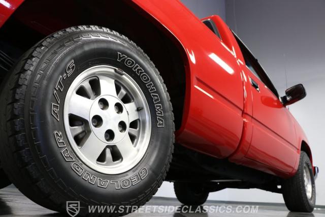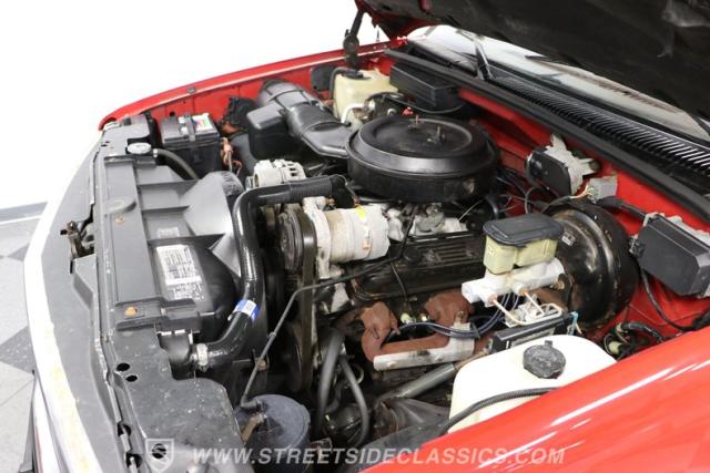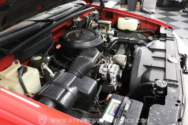 The vibrant red style and the well-optioned feeling continue inside. There\'s a driver-oriented setup where it\'s just an easy reach to all the best features, like power windows, power locks, and heater (the A/C will need servicing to blow cold again.) You\'ll also love the classic touches, like the sliding rear glass, and the AM/FM stereo is on the driver\'s console with the factory\'s separate cassette player in the dash. And you\'ll love the way this is built for individual comfort. That\'s why the cloth seating has the convenience of a bench, but there\'s also a fold-down armrest to give the driver bucket-like comfort. The steering wheel is on a tilt column to give you a clear view of the full factory gauges.