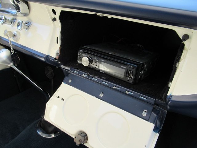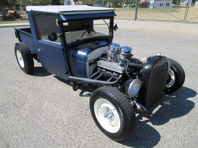 You probably won’t see another one like it! This Model A Pickup is exactly what guys used to build in the 50’s and 60’s. Painted in a Matte Blue finish with all of its bumps and bruises still there, Big Ford headlights, a wood bed with relocated Barrel style fuel tank under it, battery access panel and a little added clearance for the rear differential. The 15 inch skinny steel wheels are painted a cream color with Chrome center caps and a wood framed ratty canvas soft top to let the light in. The exposed powerplant is a 401 Buick Nailhead V8 with an Offenhauser aluminum dual quad intake with a couple of Carter AFB 4 barrels on top, Chrome dome air cleaners, Finned aluminum Offenhauser valve covers, aluminum radiator with overflow catch can, electric fan, Lake style headers with block off plates and a set of Smithy tube mufflers with turn downs. The Turbo 400 transmission shifts properly and is followed by a 57 Chevy rear differential with some freeway friendly gears. The interior is finished in White vinyl with Blue piping, Custom 1958 Rambler dash board, Early Ford style steering wheel, Moon Eyes tachometer, Lokar Floor shifter, glovebox mounted AM/FM CD stereo with Aux and USB, pop out tilt windshield, electric wiper and dual hinge mounted mirrors. The suspension consist of 36 Ford Rear radius rods, custom fabbed frame with 10 inch kickup, a dropped A front axle with split A radius rods and some front disc brakes to stop this crazy contraption. This car was built to drive and turns a lot of heads but if you are over 5 foot 8 inches you won’t fit, no legroom in this one!