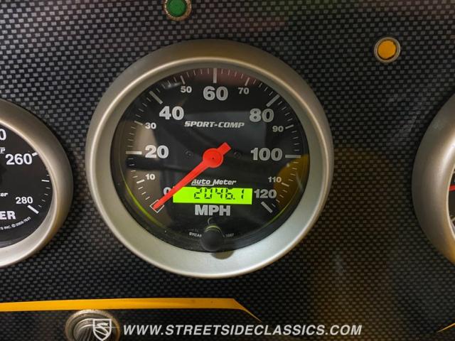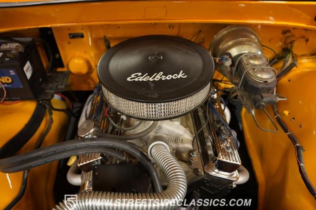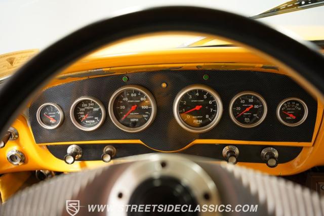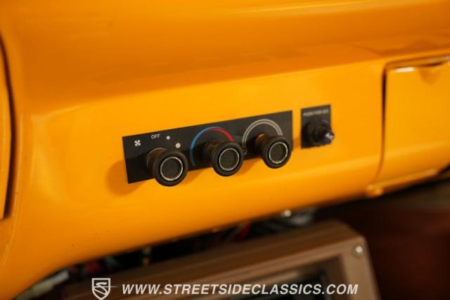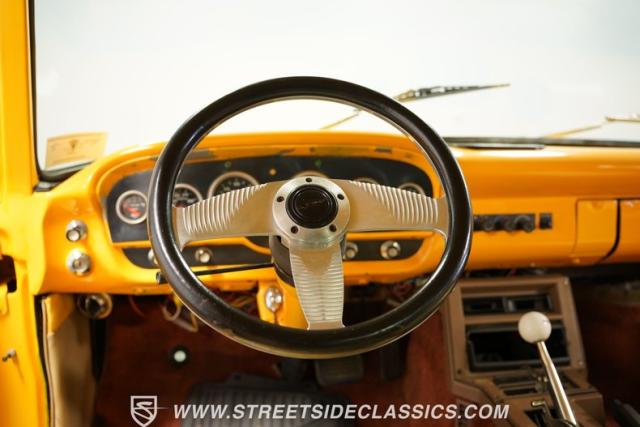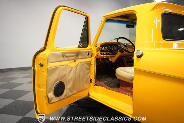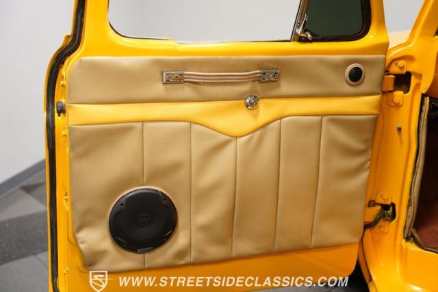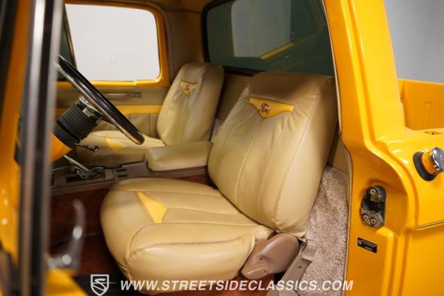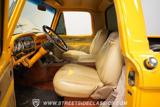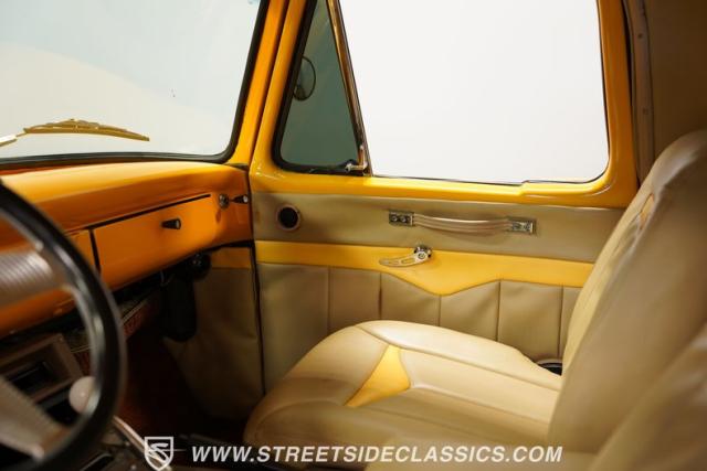 Step into the cabin of this vintage Ford, where custom touches envelop the interior with a nostalgic yet functional flair. Bucket seats clad in beige vinyl with a discreet Ford logo offer a hint of heritage, while a floor-mounted shifter and a bespoke center console affirm the truck\'s custom credentials. The layout is straightforward and user-focused, characterized by gauges that monitor every aspect of the vehicle\'s performance. The choice of a yellow secondary color on the door panels adds a cheerful contrast, mirroring the exterior\'s sunny demeanor.