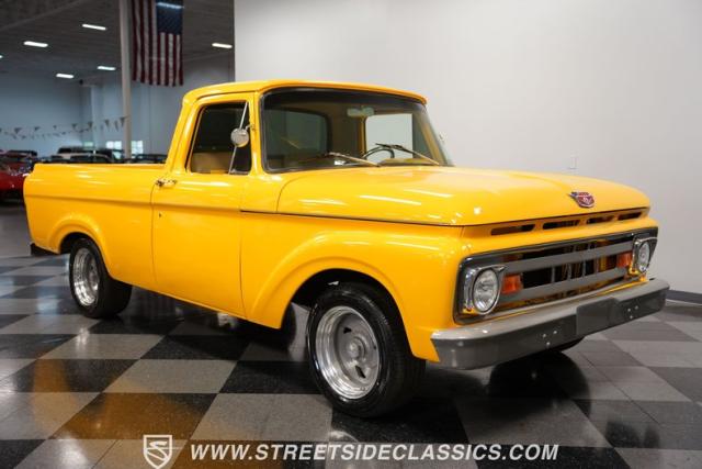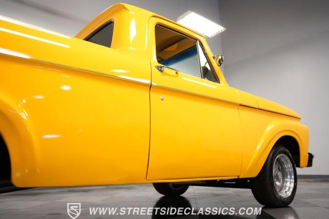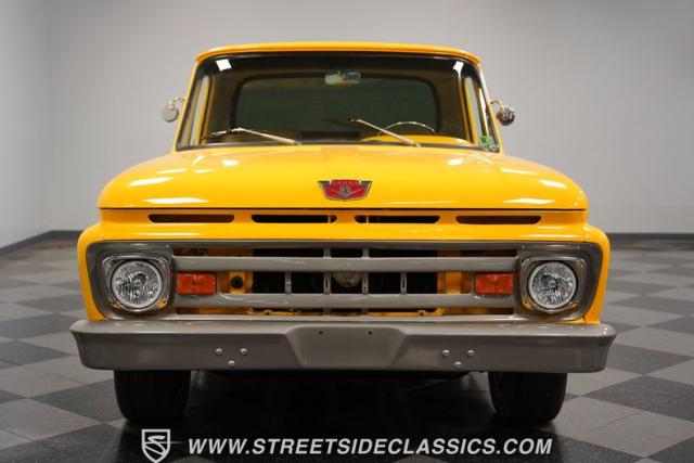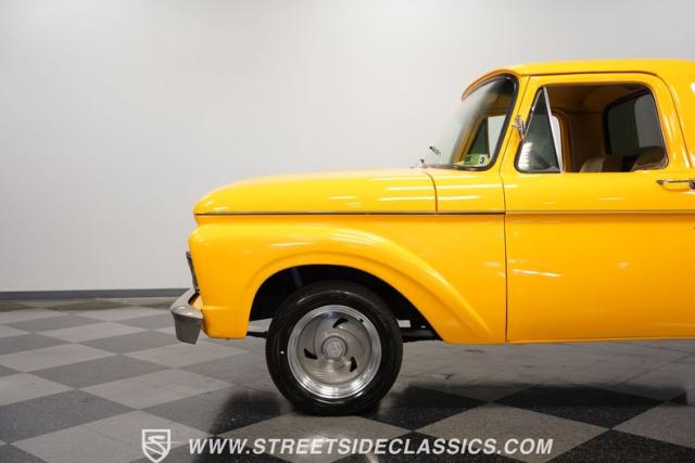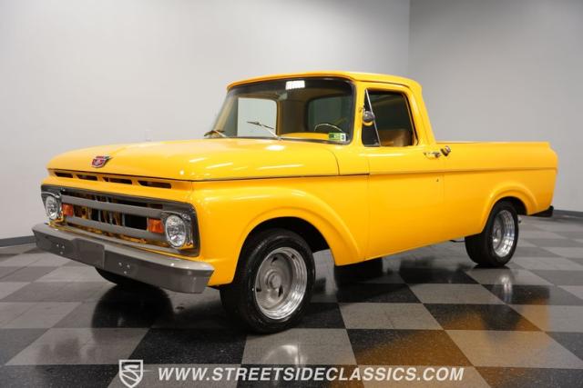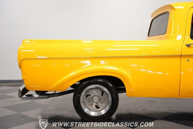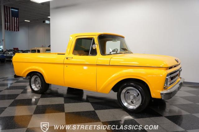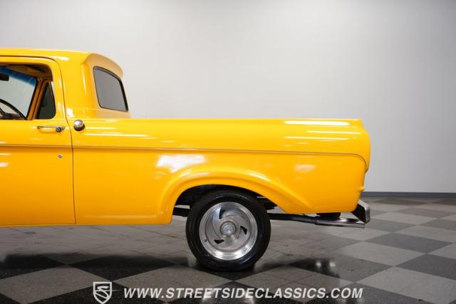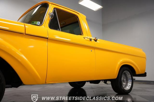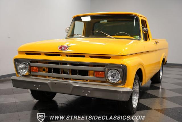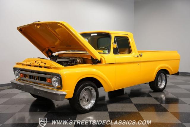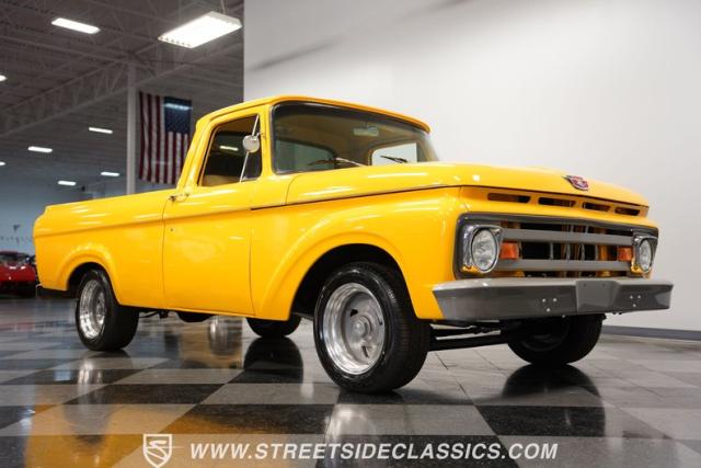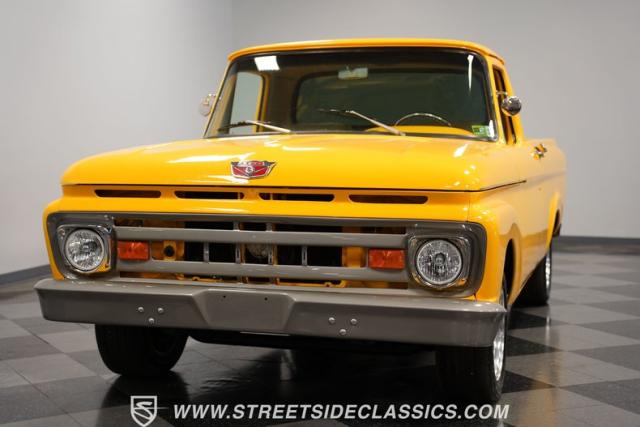In a vibrant shade of yellow, this 1961 Ford F-100 Unibody is a rare gem from Ford\'s experimental era, where they dared to dream up a sleeker, more integrated pickup design. From its unique unibody construction, which seamlessly integrates the cab and bed, to the 16-inch Billet Specialties wheels wrapped in robust 225/55R16 front and 245/50R16 rear tires, every aspect of this vehicle demands a closer look. The exterior exudes a sense of rugged readiness, highlighted by a bed liner, the overall presentation remains visually appealing, further enhanced by the metallic gray accents of the painted bumpers and grille.