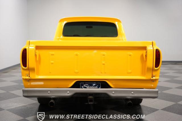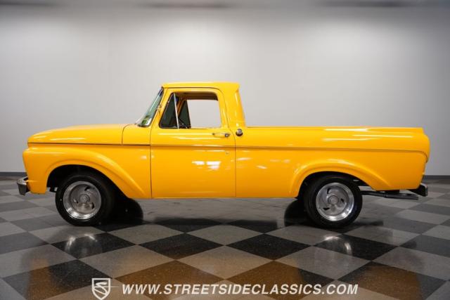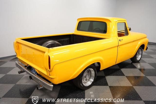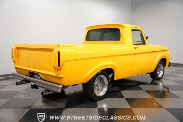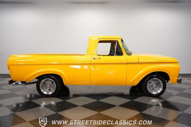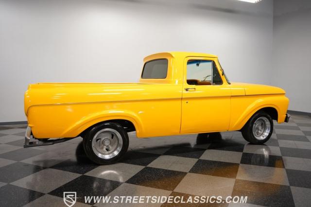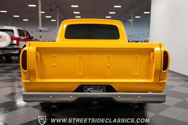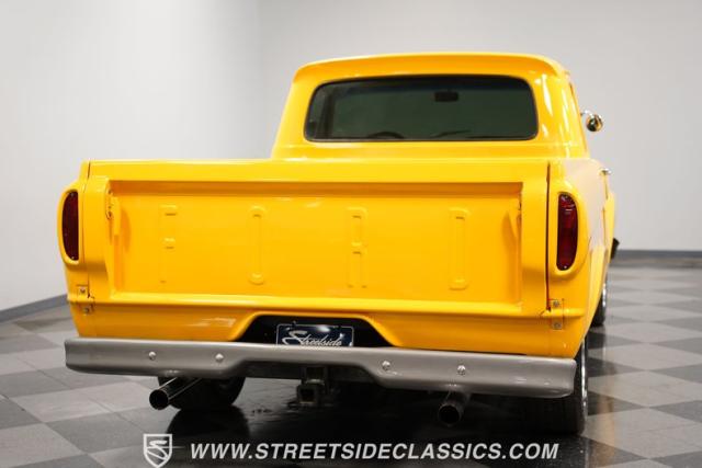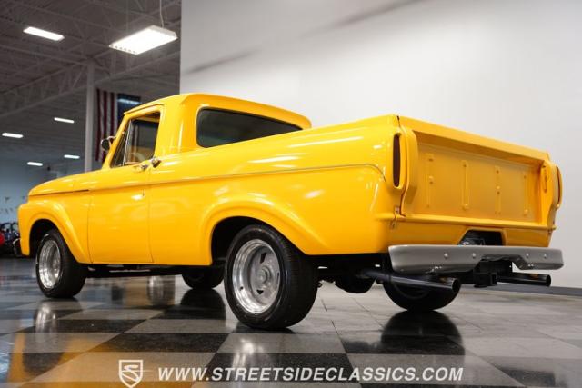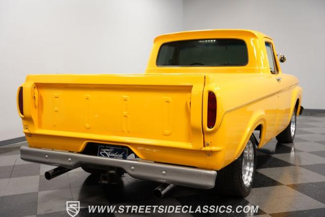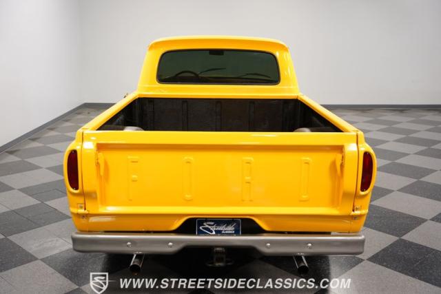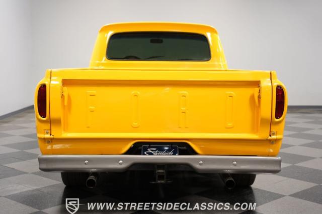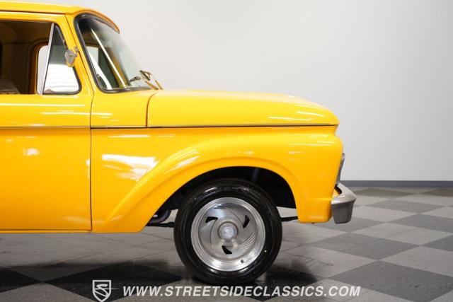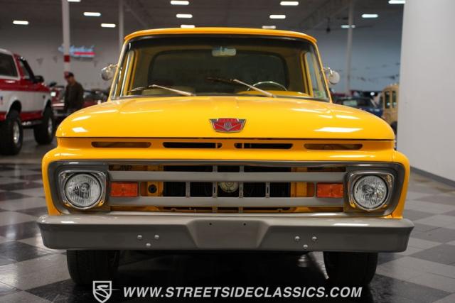 In a vibrant shade of yellow, this 1961 Ford F-100 Unibody is a rare gem from Ford\'s experimental era, where they dared to dream up a sleeker, more integrated pickup design. From its unique unibody construction, which seamlessly integrates the cab and bed, to the 16-inch Billet Specialties wheels wrapped in robust 225/55R16 front and 245/50R16 rear tires, every aspect of this vehicle demands a closer look. The exterior exudes a sense of rugged readiness, highlighted by a bed liner, the overall presentation remains visually appealing, further enhanced by the metallic gray accents of the painted bumpers and grille.