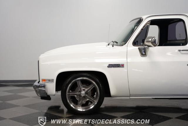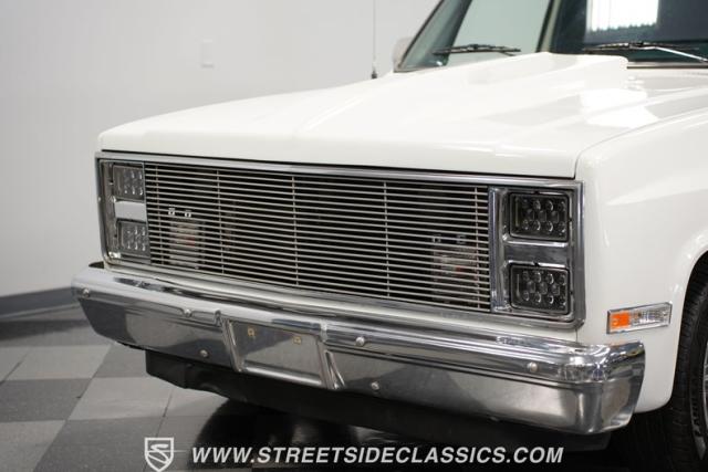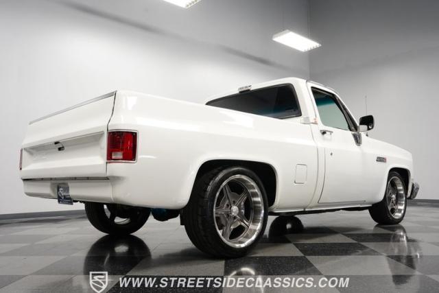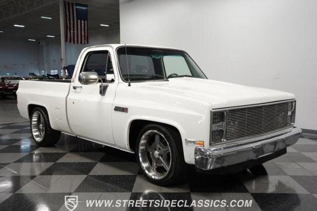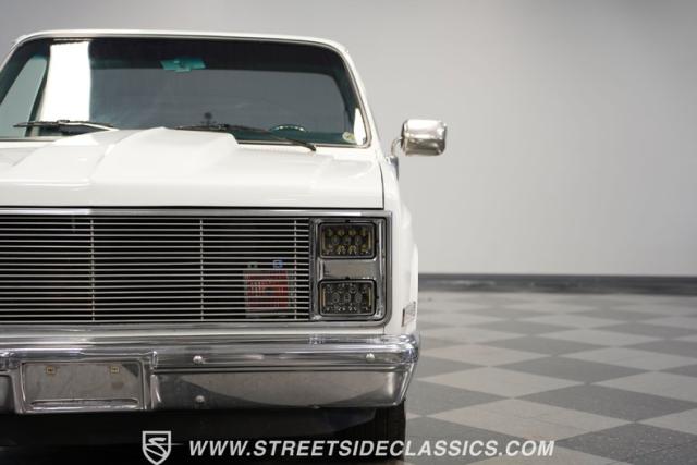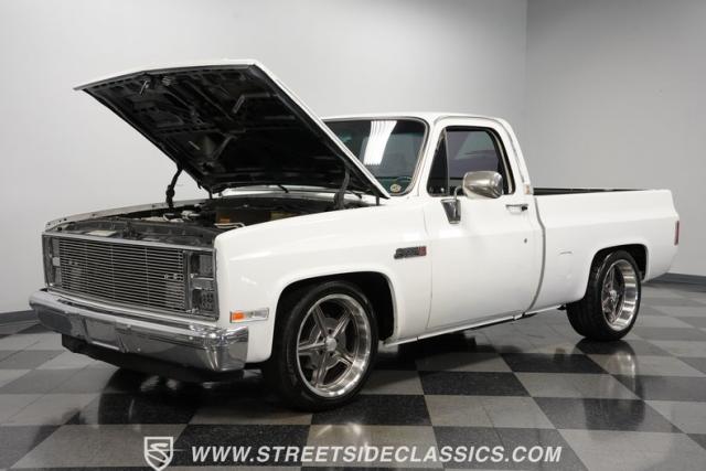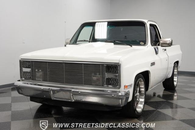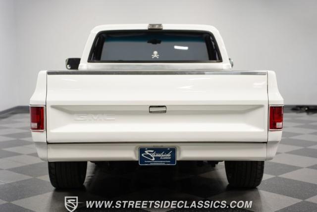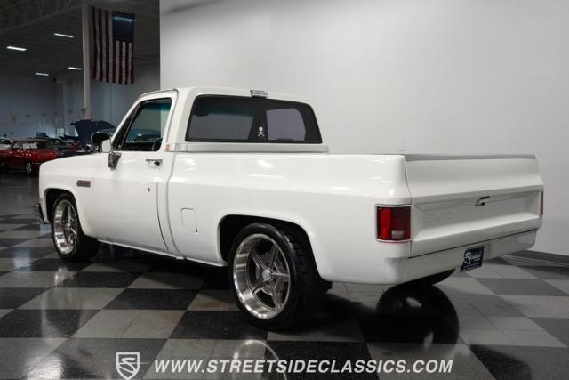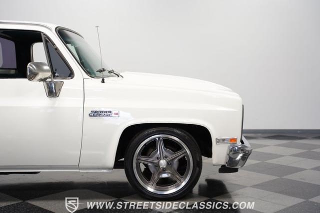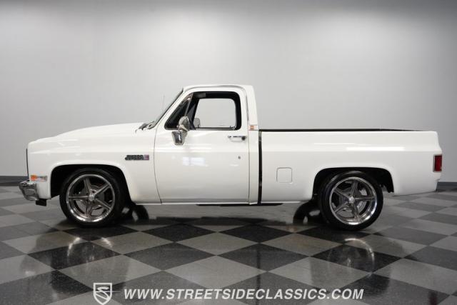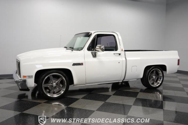 This 1986 GMC Sierra 1500 Classic rolls with authority through every street. The crisp white exterior builds on its muscular proportions, anchored by a metal cowl induction hood and precision-crafted 20-inch Billet Specialties wheels. The short bed configuration and spray-in bed liner multiply its capabilities. LED side marker lights and custom headlights with a distinctive grille broadcast pure American muscle.