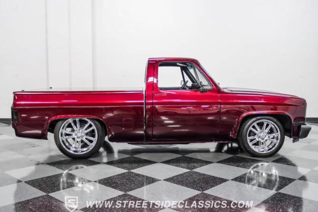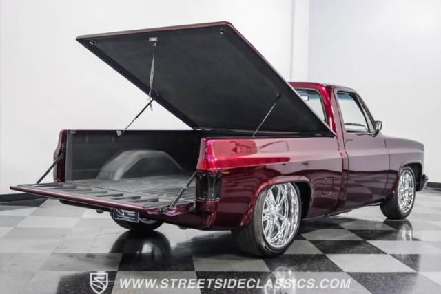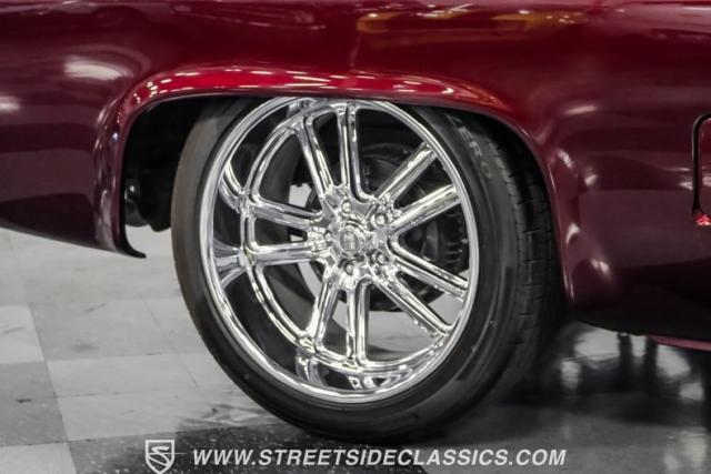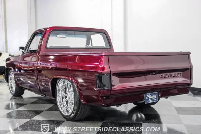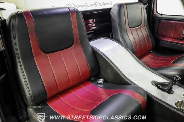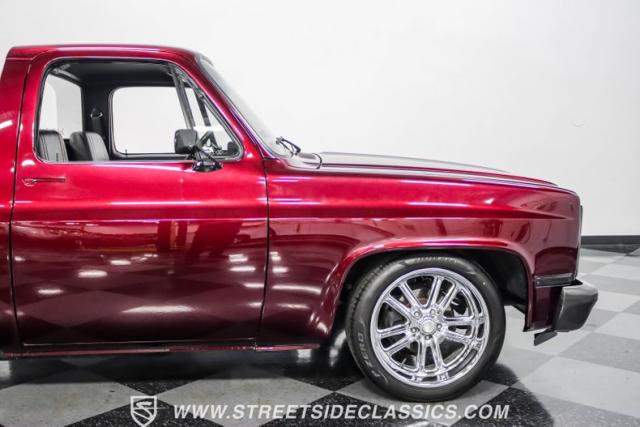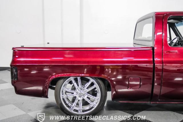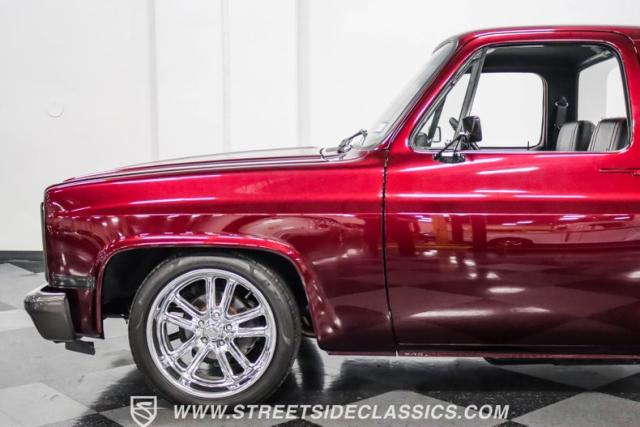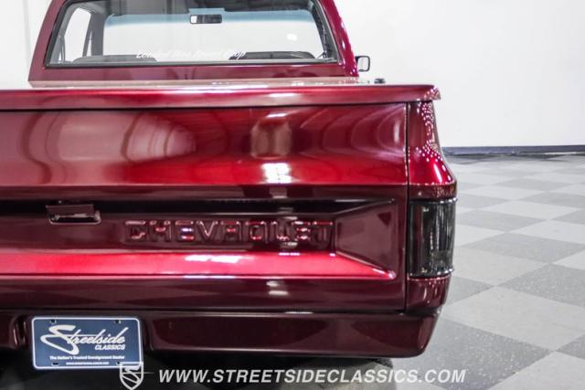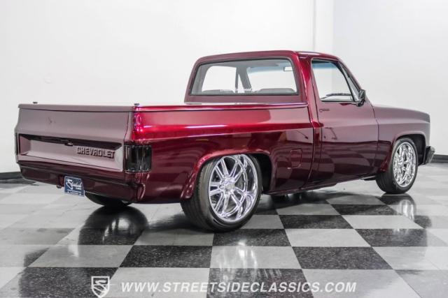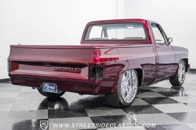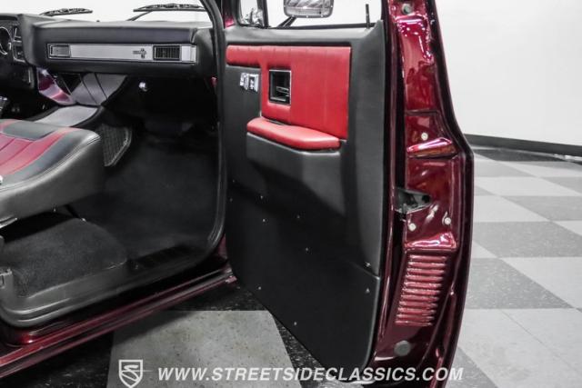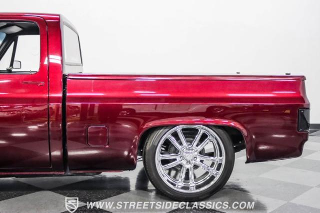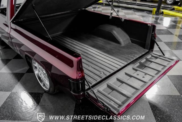 This 1987 Chevrolet C10 Silverado Restomod showcases American muscle reimagined. Its black cherry pearl paint gleams with a deep, rich luster that sets it apart from ordinary pickups. The sleek profile, accentuated by removed drip rails and custom panels, gives this C10 a modern edge. Rolling on 20-inch U.S. Mags up front and 22-inch in the rear, wrapped in Pirelli rubber, 245/45R20 front, 295/40R22 rear.