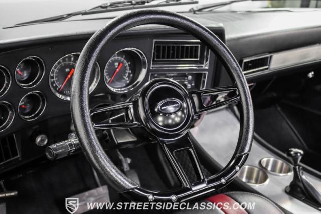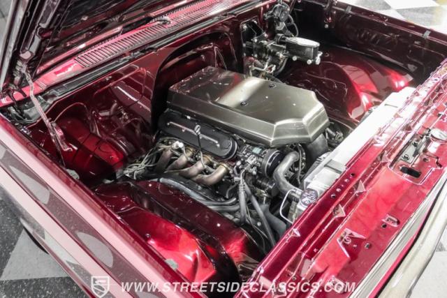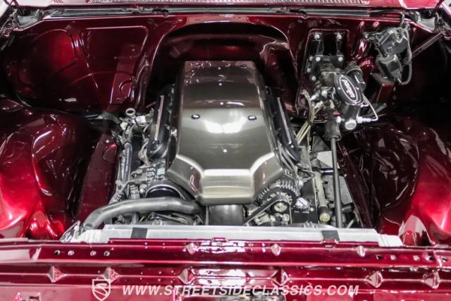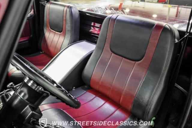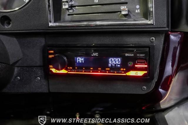 Inside, the full custom leather interior blends black and burgundy, creating a bold yet refined atmosphere. Bucket seats with a custom stainless steel center console offer both comfort and style. The cockpit is equipped with a Billet Specialties steering wheel, Lokar shifter, and Classic Instruments gauges. A JVC stereo system with AM/FM, Bluetooth, CD, and aux input provides entertainment, while Vintage Air keeps the cabin cool.