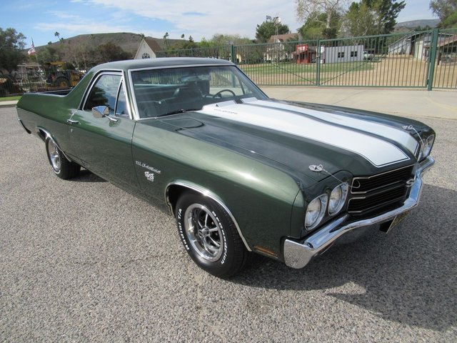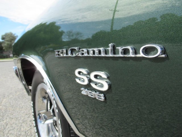 A real deal matching number SS 396 El Camino. 1970 has become probably the most valuable and favorite year of the El Camino. This restored example is finished in Forest Green Metallic with White stripes per the trim tag and original build sheet that comes with the vehicle. The GM plant had a problem with the blocks from the factory and had to bore them, so all 396 engines that year actually became 402’s. Options on this one include the 350 Horsepower version along with power disc brakes, power steering, original working A/C with upgraded compressor and 134 freon conversion, functional cowl induction hood, dual exhaust with upgraded coated headers and Flow master mufflers for a deep and throaty big block sound, Turbo 400 automatic transmission and 12 Bolt Posi-Traction rear differential. The front and rear sway bars assist in responsive handling and the original 14 inch SS 5 spoke Rally wheels with raised white letter radials complete the muscle car look. The interior is finished in the correct Black Vinyl with bench seat, original SS Steering wheel, Factory AM/FM stereo, factory gauges with tachometer, a couple of added Stewart Warner under dash gauges for accurate engine vitals and original tinted glass. This rust free Los Angeles California built El Camino was sold new in South Gate California at Dana Chevrolet and is ready for another 55 years of cruising!