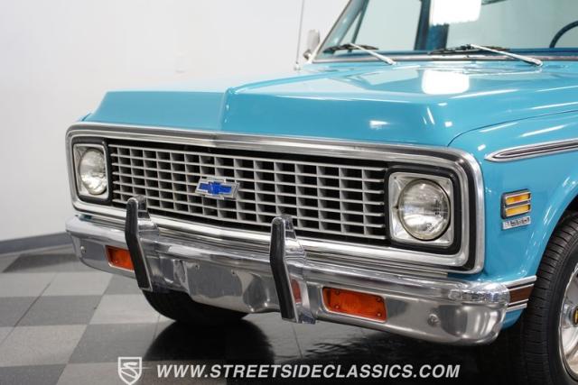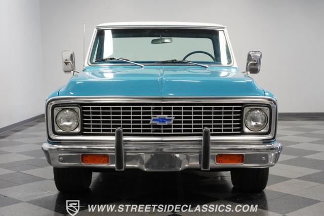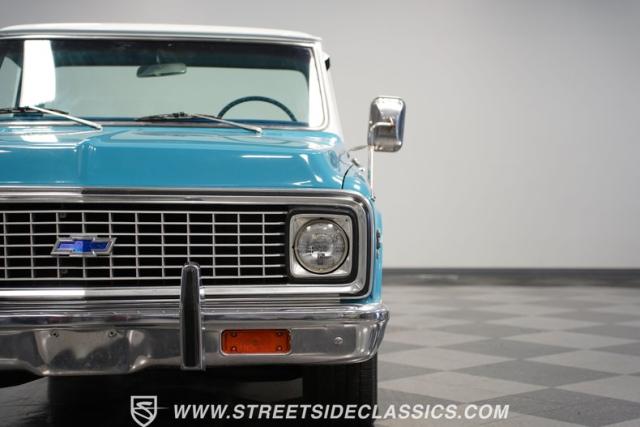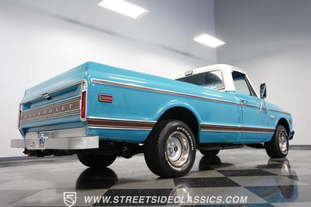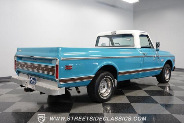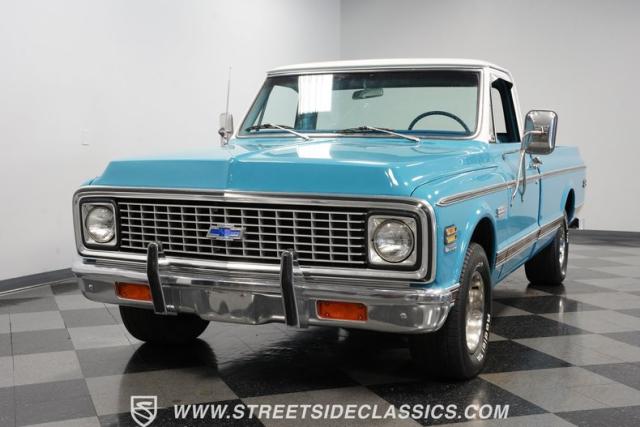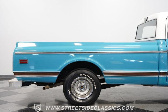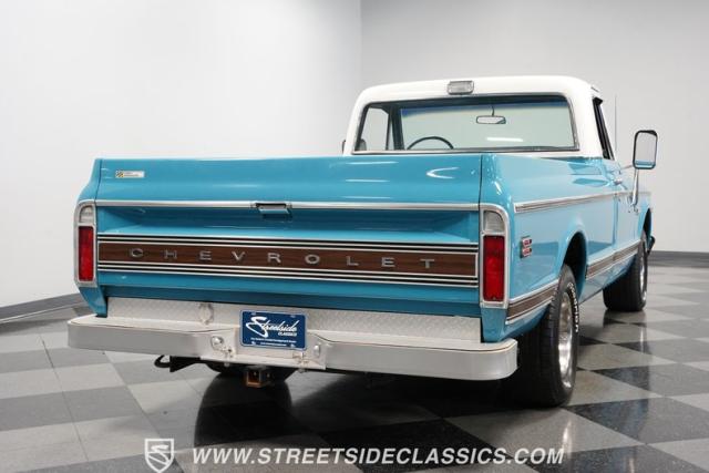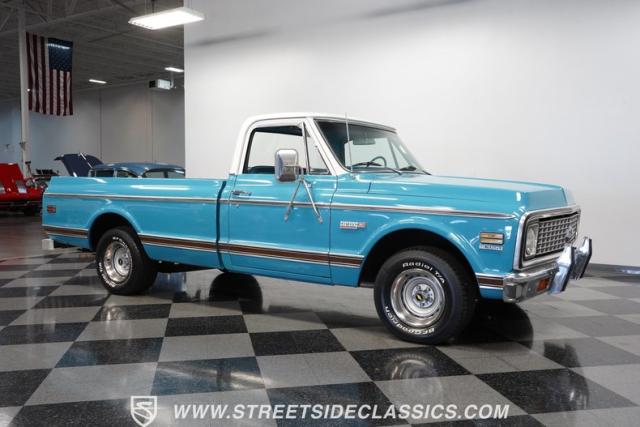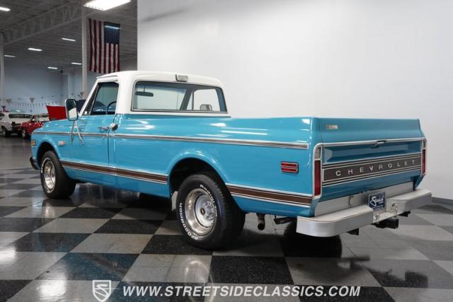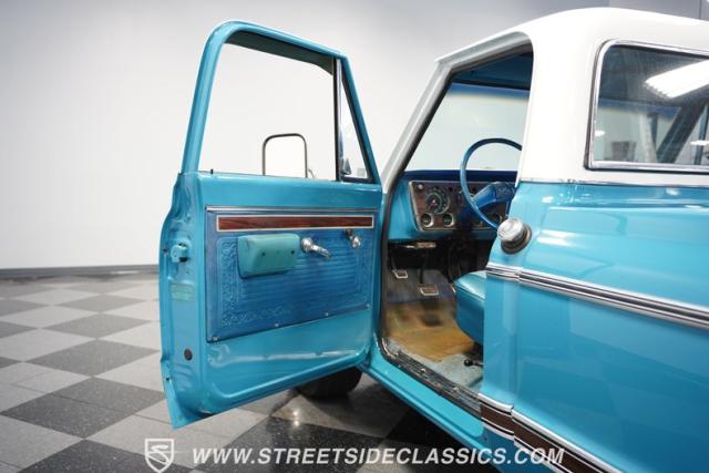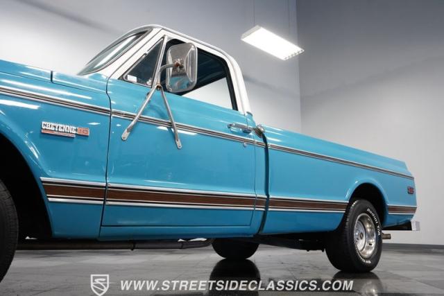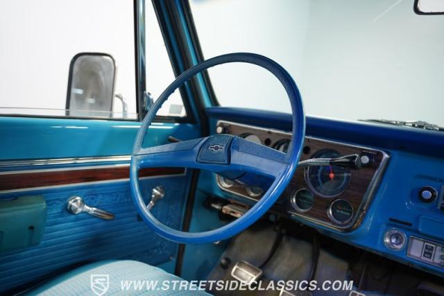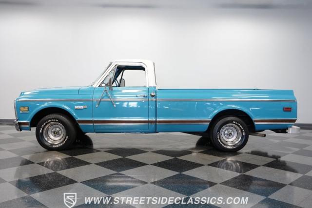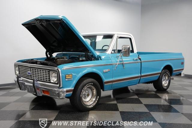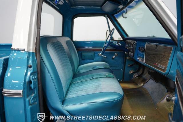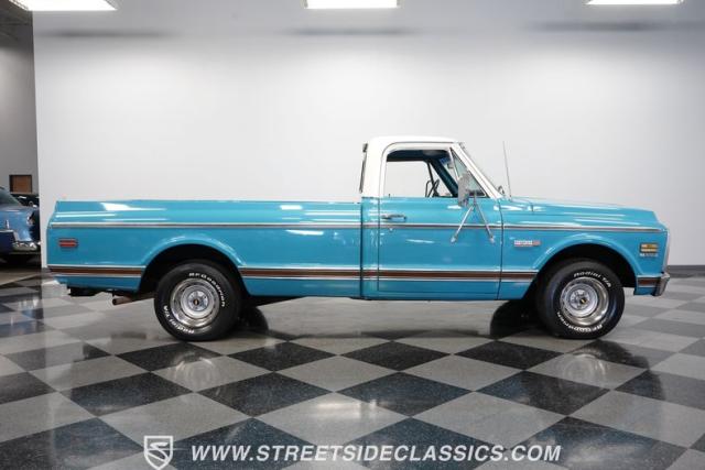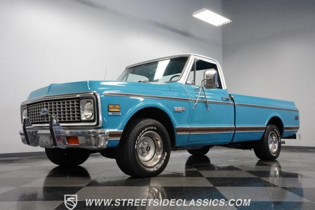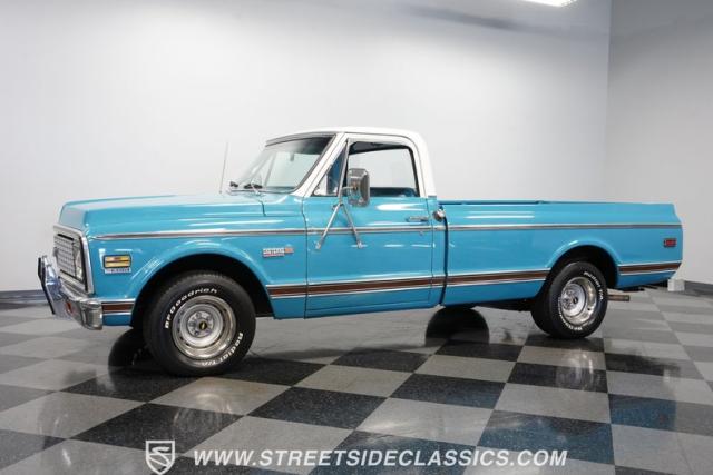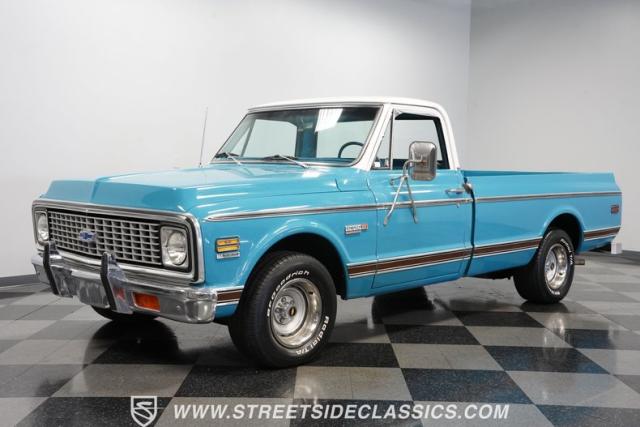 This 1971 Chevrolet C10 Super Cheyenne has been with the same family for decades, sporting its factory-correct Medium Blue and White two-tone paint scheme. The long bed configuration amplifies its working-class DNA, while the Super Cheyenne trim adds a distinctive flair. The truck\'s bold stance is enhanced by factory 15-inch wheels wrapped in BFG Radial T/A 275/60R15 tires. Heavy-duty rear bumper with a trailer hitch and oversized tow mirrors reinforce its capability, while the painted bed remains clean and functional.