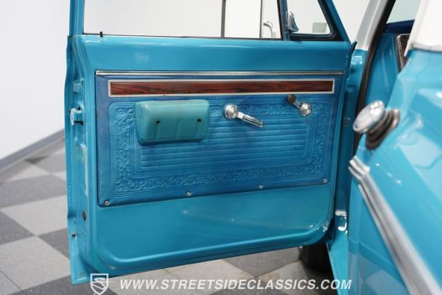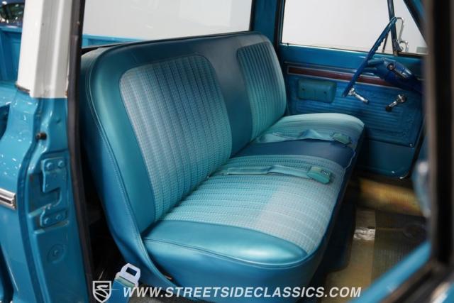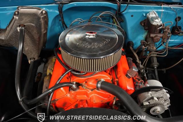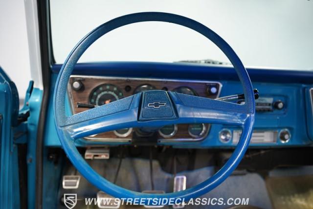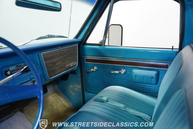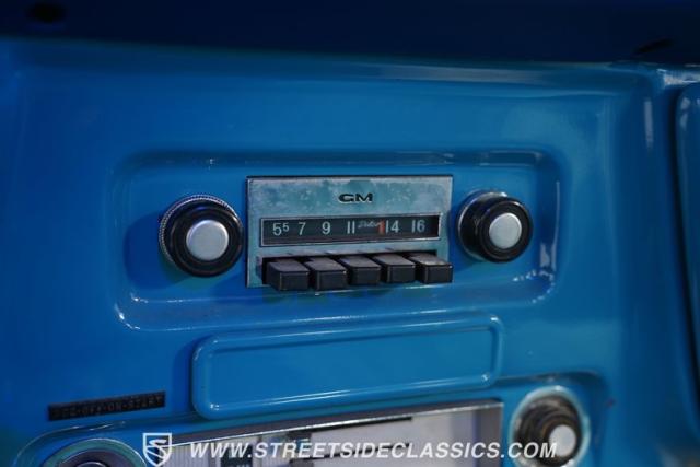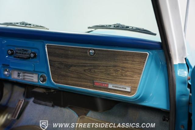 Inside, the blue cloth bench seat anchors a practical cabin built for business. The wood Cheyenne trim elements add refined detail throughout the interior. A classic column shifter puts total control at your fingertips. The factory AM radio and power steering maintain period-correct functionality, while the straightforward gauge layout keeps vital information visible. Blue LED dome lighting adds modern convenience without compromising the original design.