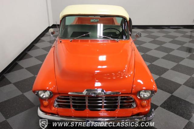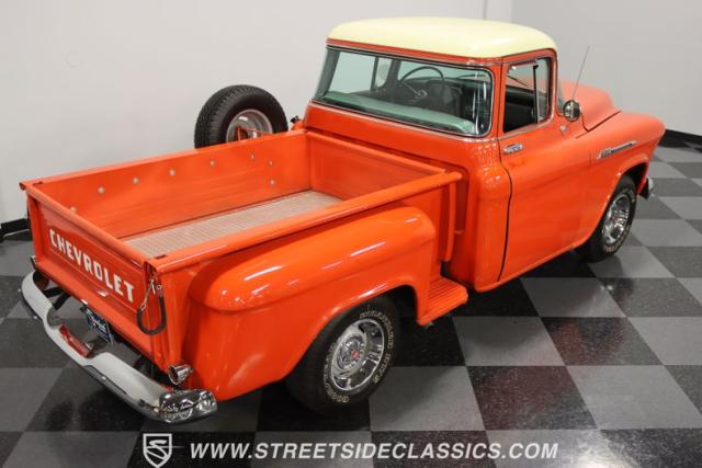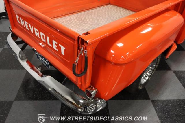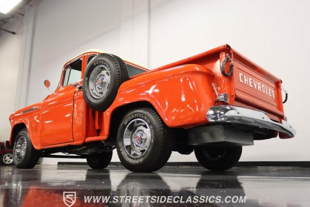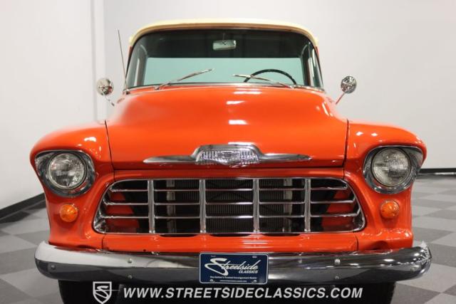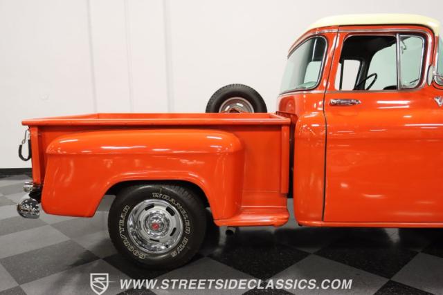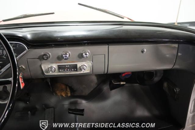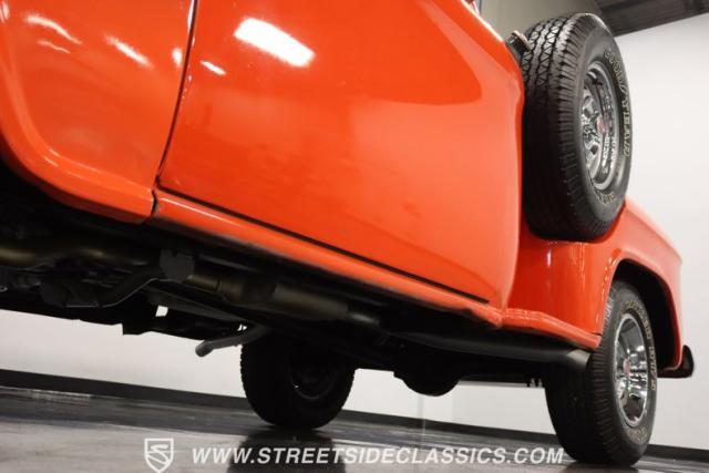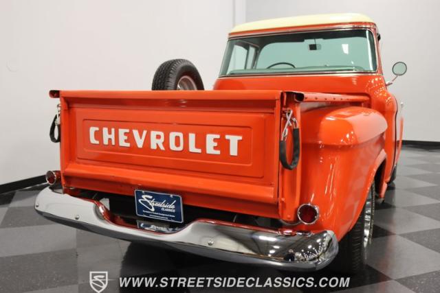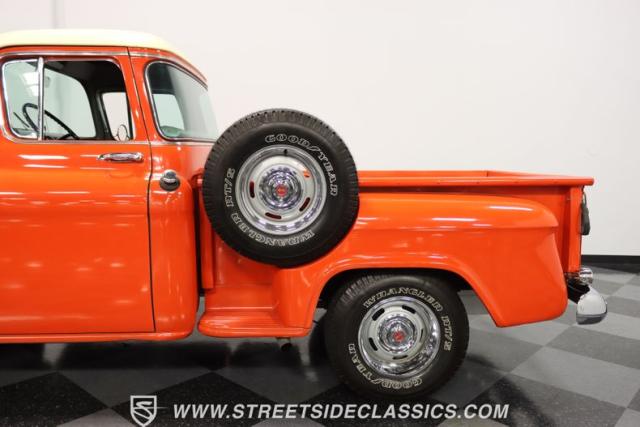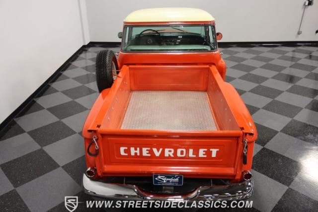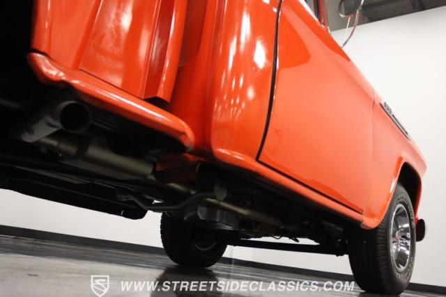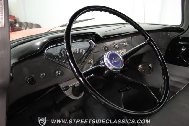 This 1956 Chevrolet 3100 Big Window commands attention with its bold Gypsy Red paint and Shoreline Beige accents. While the paint may not be concours-perfect let\'s call it a \"five-footer\" it adds an undeniable patina of character. The diamond plate bed floor offers a touch of rugged, modern style that complements the truck\'s classic lines. Rally wheels and sizable 235/75R15 tires give it a strong, purposeful stance.