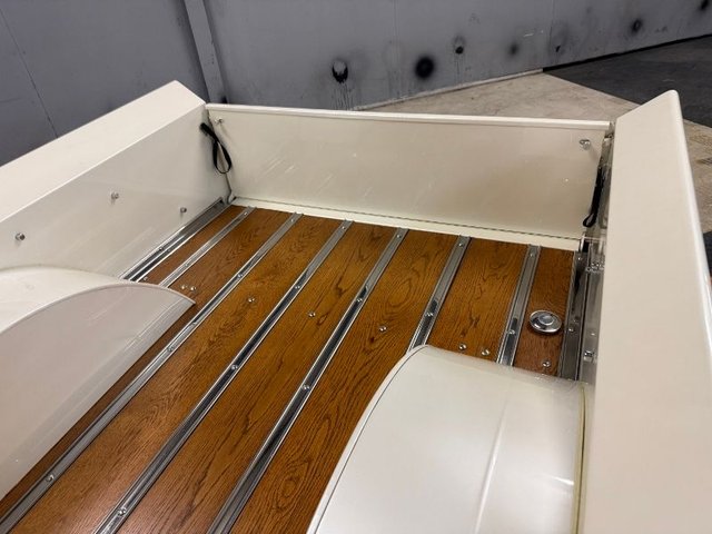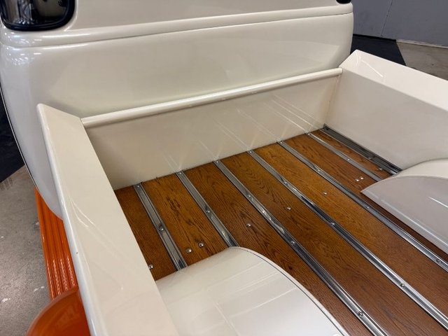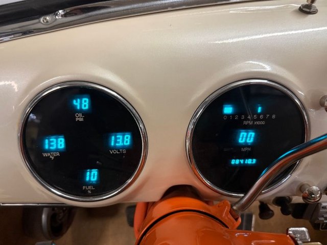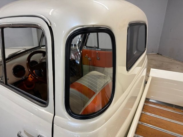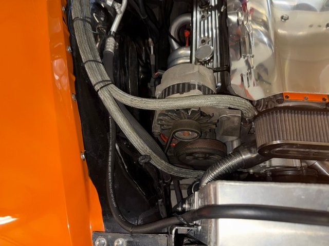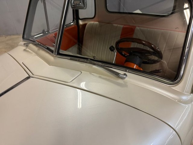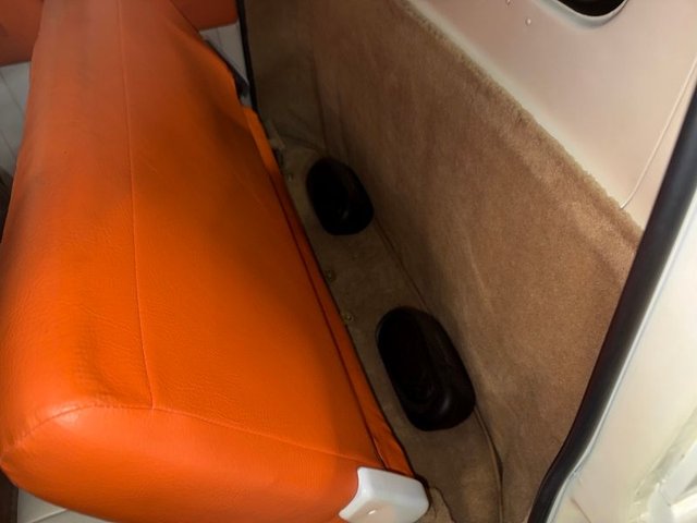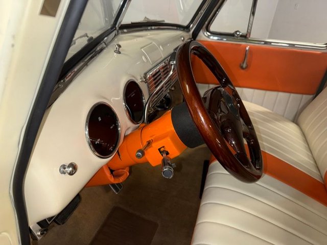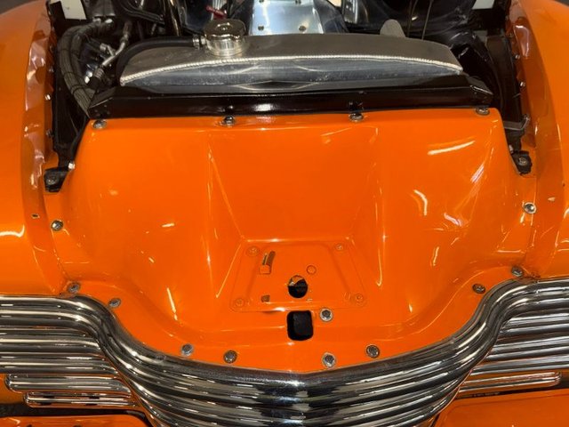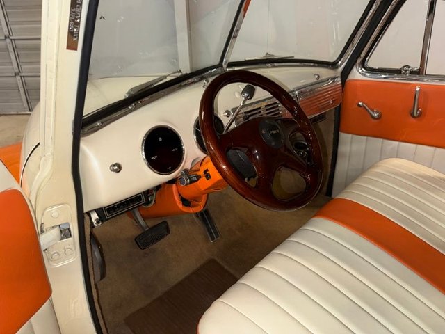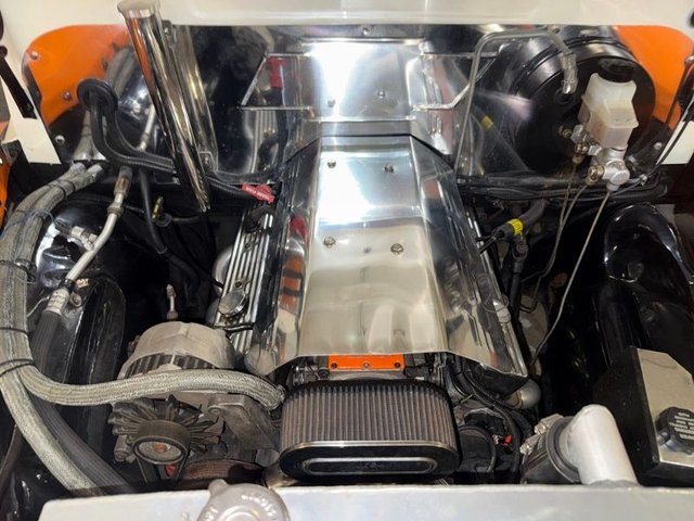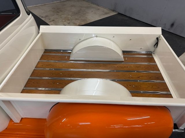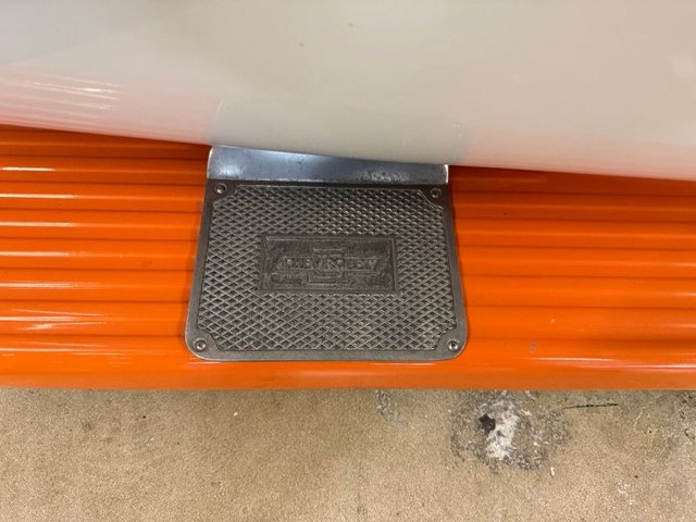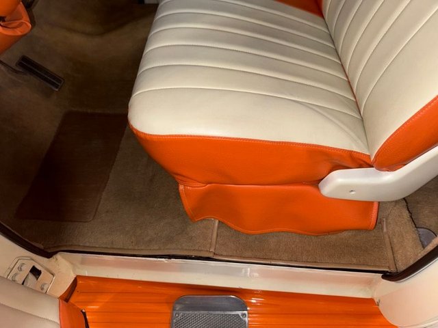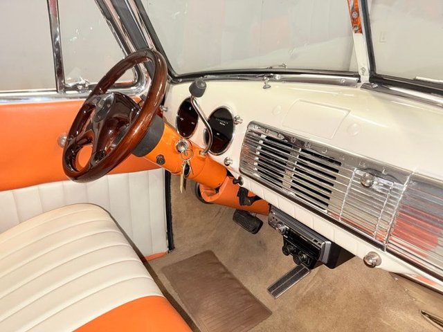 The interior is a beautiful Orange and White on a bench seat along with door panels. The dash is all steel with (2) round gauge clusters digital; oil-water-volts-fuel in one, Tach and speedometer in the other. Dash trim and glove box are chrome and all like new. Chrome light knob and wiper knob, chrome rearview mirror. All garnish moldings are chrome plated. Door handles and window cranks are good. Tilt and telescopic column with automatic shifter. Beautiful 4-post steering wheel, Pioneer AM/FM/CD player mounted under dash with speakers in kick panels and behind the seat. A/C vents mounted under the dash. Tan carpet. Tan carpeted behind the seat. There are seat belts and white headliner. Beautiful inside.