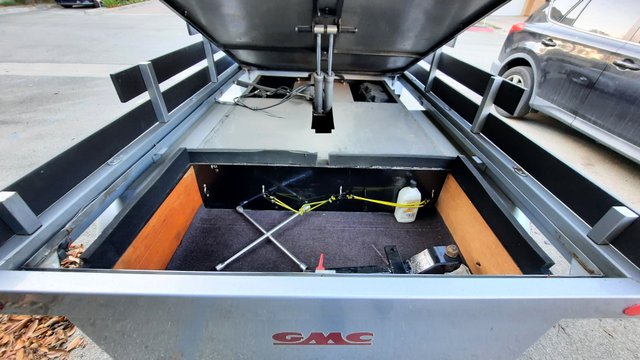 The body is original except for the truck bed and rear bumper modification all done in steel. The unique truck bed is powered by an electric hydraulic lift that opens to around 30 degrees giving access to storage space. The battery is also located under the lift bed.