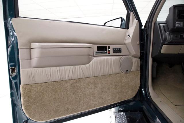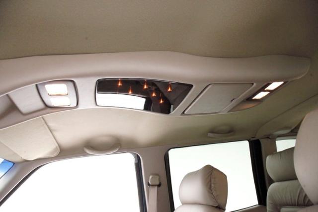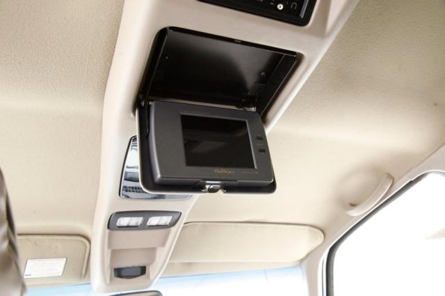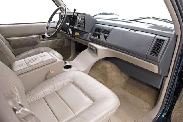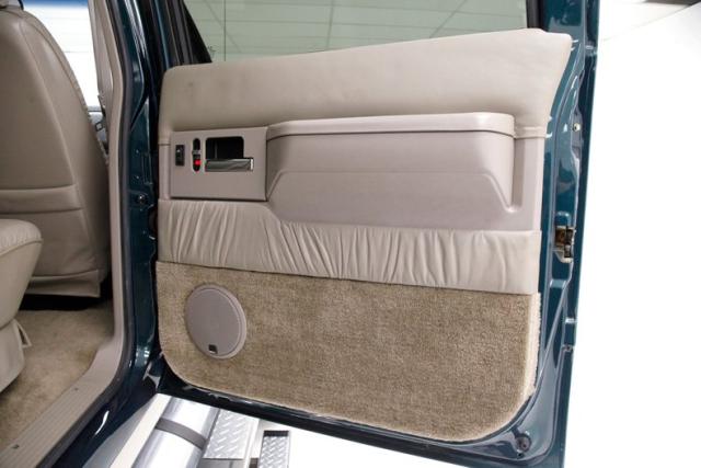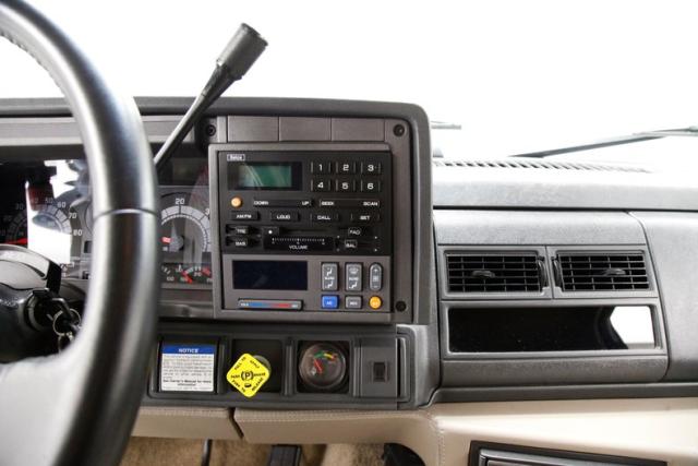 In true big rig fashion, you\'ll need some gumption to climb up to the driver\'s seat, over the fuel tanks and over not 1 but 2 steps to get in, it is not for the faint hearted. Once inside you are enveloped in the lap of luxury seated on any one of the front or rear tan leather living room recliners you can grab the wheel or your remote to the TV with VHS player or stereo as it is equipped with both. A square and rectangle dash is in front and shows all the essentials along with many conveniences to poke your fingers at for your comfort. The truck does have an airside bagged suspension activation button and all dash controls are pushbutton. Overhead in a roof console if you will, is the drop down TV, some lighting, input jacks and a bit of small item storage bins. The rear passengers are treated to a trio of chairs all slammed together all fun full tan luxurious leather and plenty of room for 3. The center seat back doubles as an armrest and there are climate controls and other conveniences available to these rear passengers. Tan carpeting floods the floors and right down to the door panels inside which all these features reside, is pure luxury with leather and vinyl power toggles and speakers. And if this is not enough a 3rd row leather seat is in which is a luxurious \"simple\", (not), bench also in tufted leather and room for another 3. A picture window gives the rear passengers something to peer out of to view the cargo being hauled.