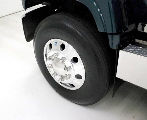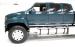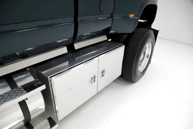 This one of a kind custom built promo truck is essentially made up of 3 trucks: A GMC 6500, a Crewcab dually, and a Suburban. The job is done so well, it\'s tough to tell exactly which parts are which, but it all comes together in a WOW presentation. Big steel is bathed in Dark Ivy Green Metallic basecoat/clearcoat, and it is all straight as arrows with well minded gaps, and with the amount of steel on this truck that\'s making a statement as it\'s a lot to manage! The front is pure GMC with a stainless steel horizontal ribbed grille and 2 massive bump out fenders housing the big square headlight. A colossal piece of chrome in the form of a front bumper is attached just below, and unlike the old locomotives of yore, this is not a cow catcher but a cow killer, or for that matter anything that decides wrongly to get in its way! The tinted window crew cab appears as the Suburban section of this build with its 4 doors and then some even an extra glass for the rear passengers to view the world as it skips by. On the rockers are stainless chromed barrel like fuel tanks, dual steps to climb in and even some rear tool boxes just below the beginnings of the bed. The bed is a full on 8 foot uninterrupted bed as the fenders hang off the sides to cover the dual wheels and tires. Dual large and in charge mud flaps hang off of either side and in the center is another stupendous piece of chrome in the form of a rear bumper. A large hitch is below and towing capacity of over 23,000 lbs. The bed you could not fill enough to reach the total capacity as to weight hauling on this truck. It is lined with textured body matching trunk paint. All this floats on 22.5 inch polished truck wheels and 11R22.5 rubber with 2 of these for each side on back.