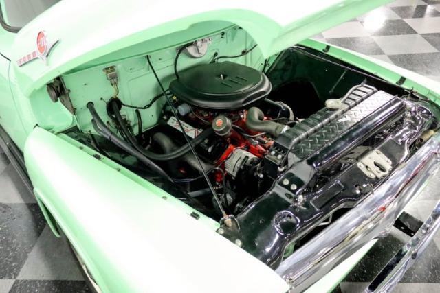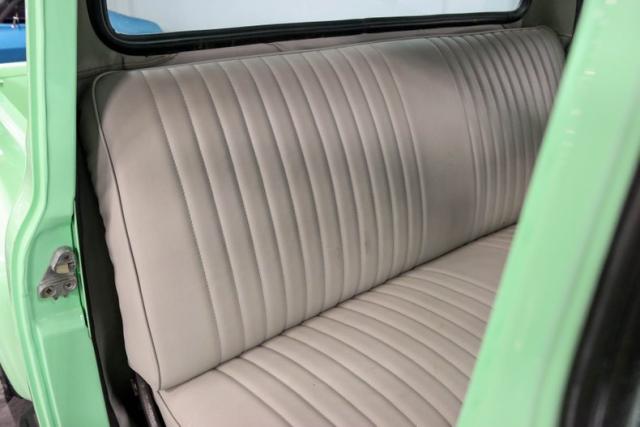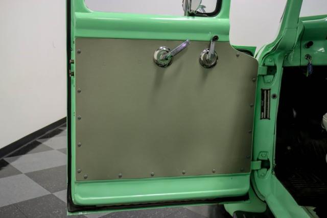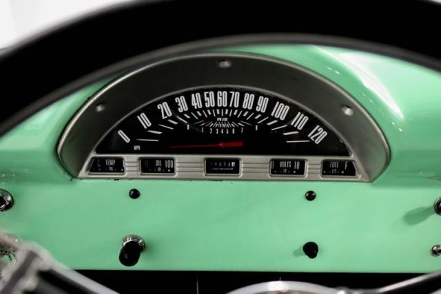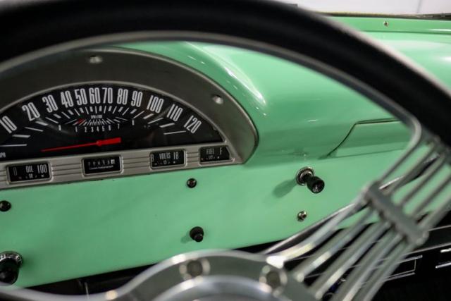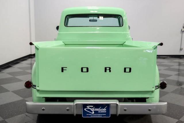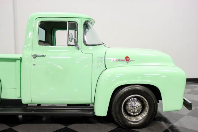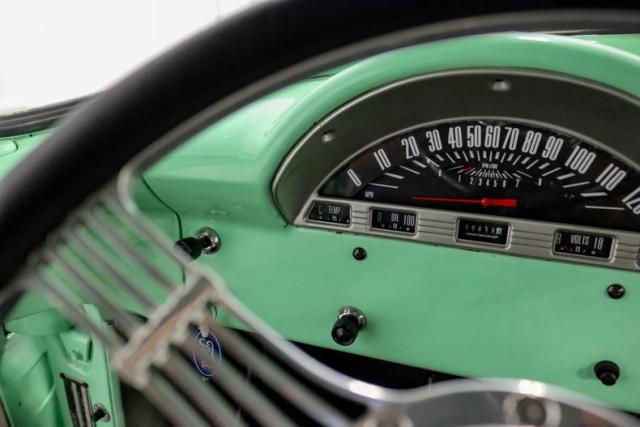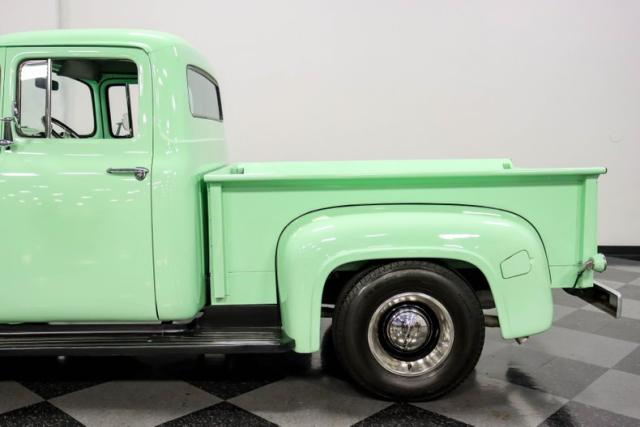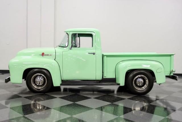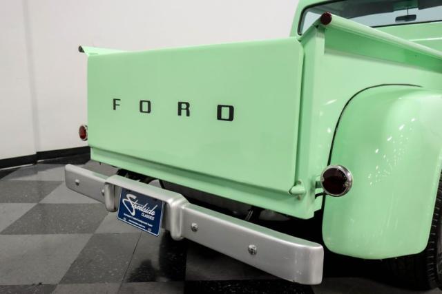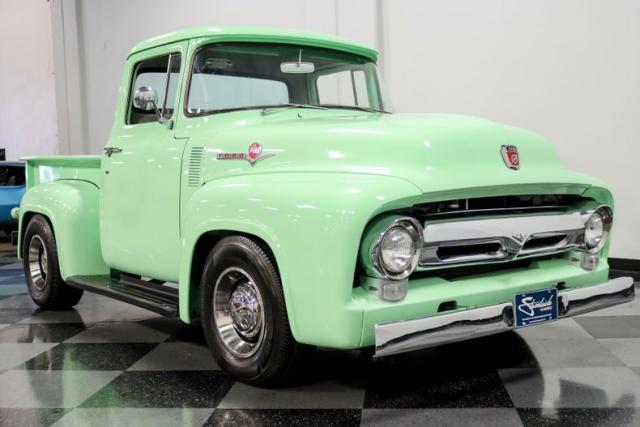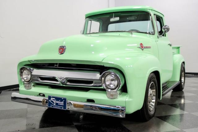 This 1956 Ford F-100 wears a coat of Meadow Mist Green, a factory-correct hue that paints a picture of wide-open Texas prairies. The truck\'s clean, flowing lines are enhanced by custom touches like an integrated fuel filler and streamlined tailgate. Sitting on 15-inch wheels wrapped in 235/75R15 tires, this F-100 cuts a striking figure, especially with its slightly lowered stance that gives it an extra dose of attitude.
