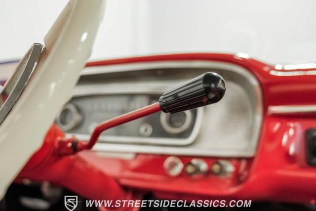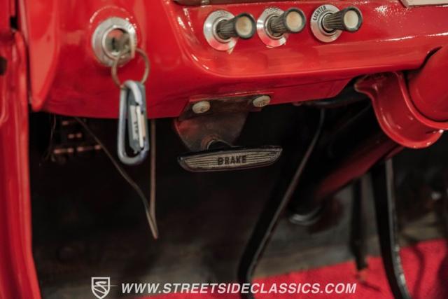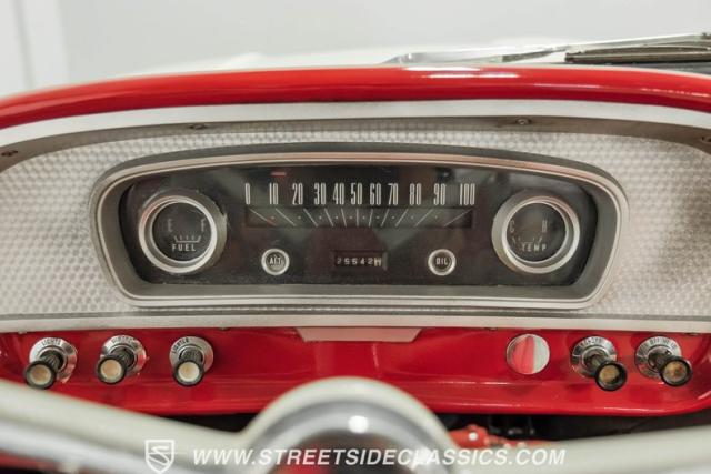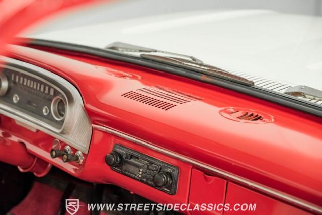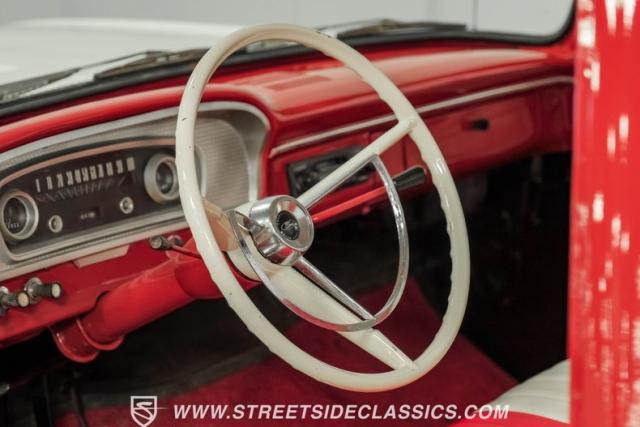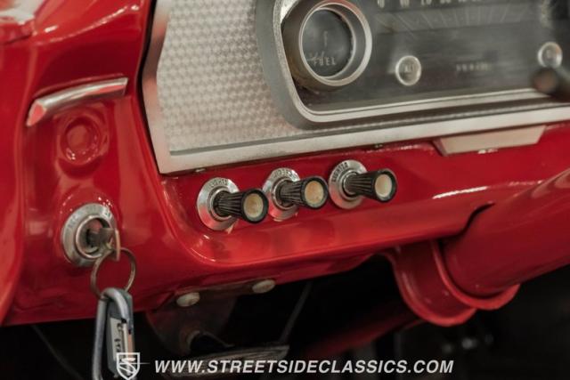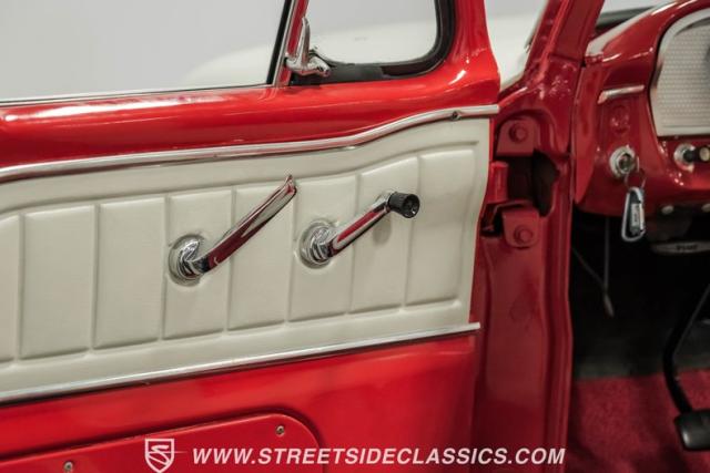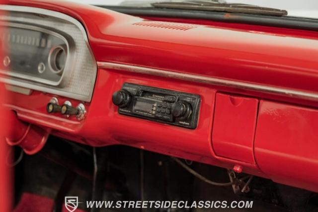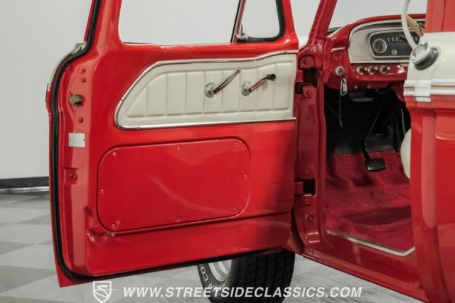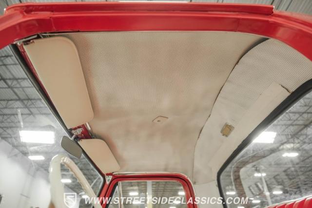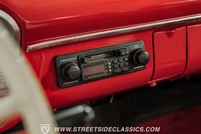 Inside, the red and white theme continues, creating a cohesive look that ties the exterior and interior together. The bench seat, upholstered in vinyl, provides a comfortable spot for long drives. An AM/FM cassette player in the dash lets you enjoy your favorite tunes as you cruise. The dash maintains a clean appearance, contrasting nicely with the surrounding bezels. The 6-digit odometer adds to the vintage feel of the cabin. This interior strikes a balance between preserving the truck\'s original character and offering practical comfort for today\'s driver.