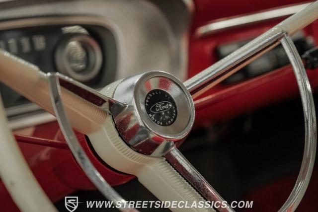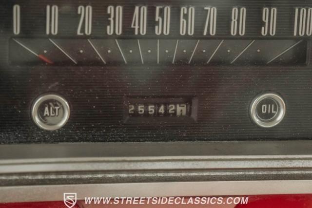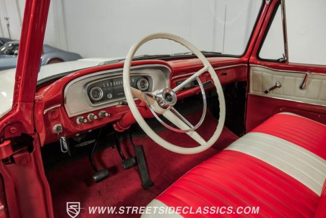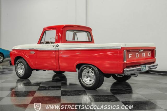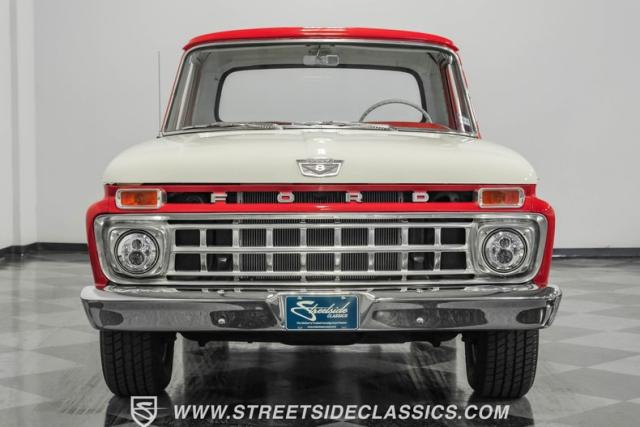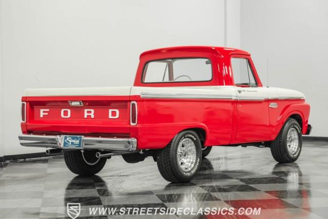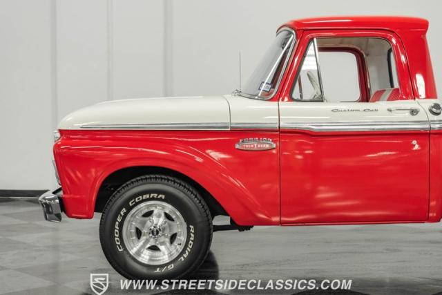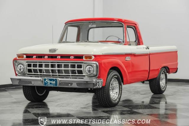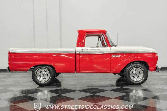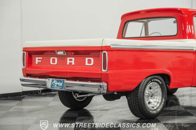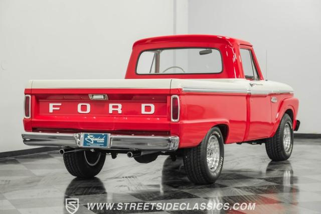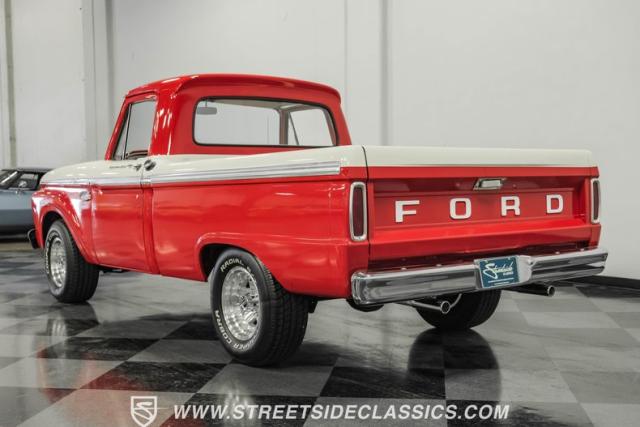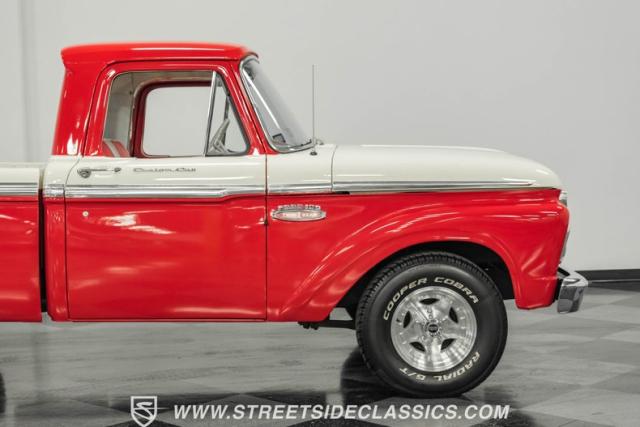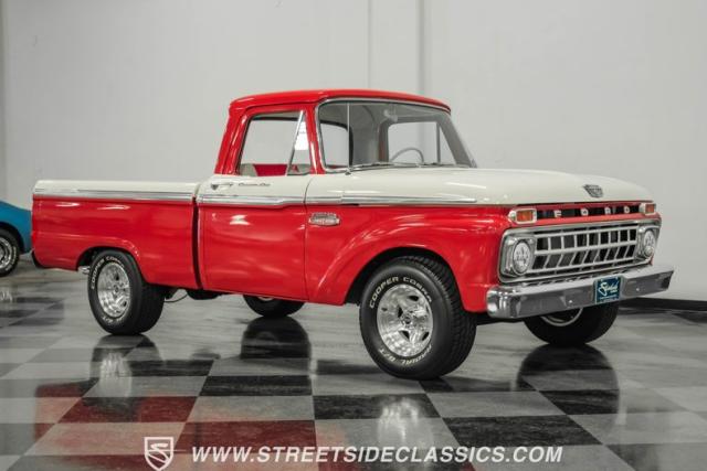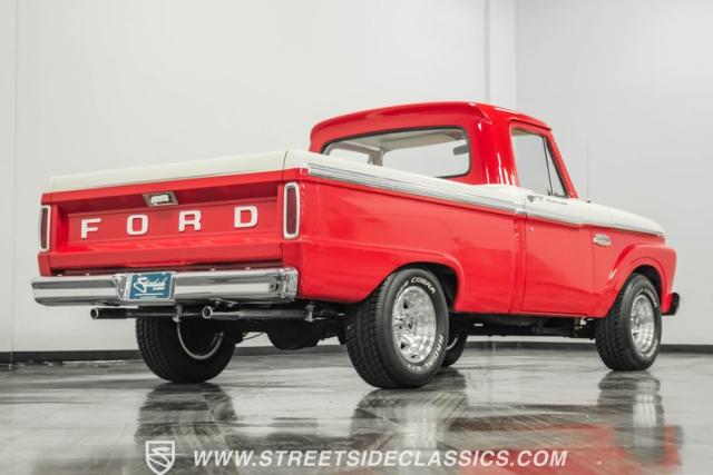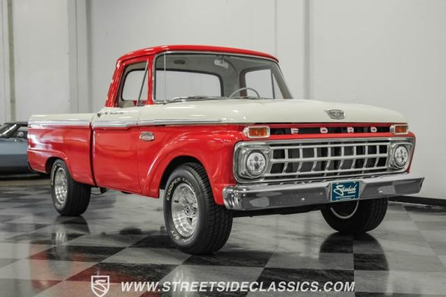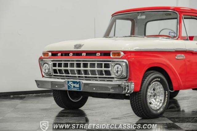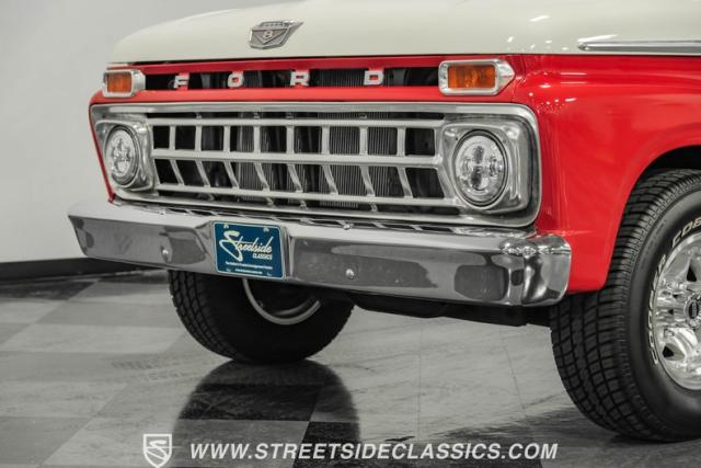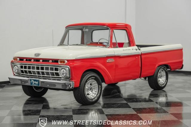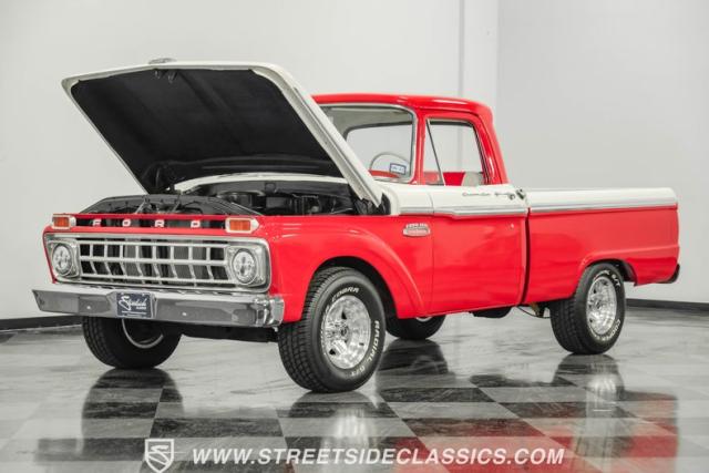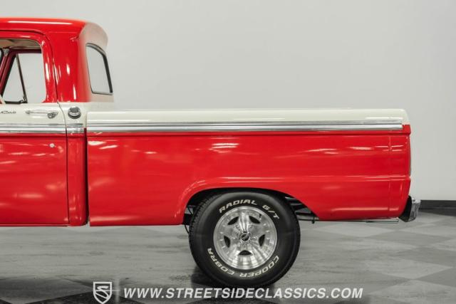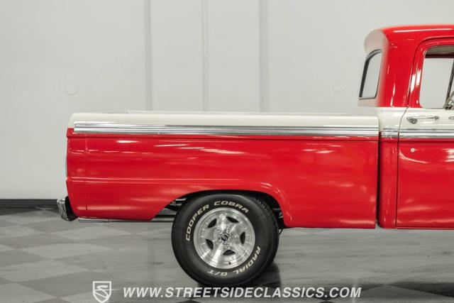 This 1965 Ford F-100 showcases a bold red and white two-tone paint job that grabs your attention. The sharp lines of its classic truck body are emphasized by the contrast between the vibrant red color and crisp white accents. American Racing 15-inch wheels fitted with 255/70R15 tires give this F-100 a muscular stance. The bed features a durable liner, ready for work or play and Projector headlights modernize the front end. This F-100\'s exterior combines classic styling with thoughtful updates, creating a look that\'s both nostalgic and fresh.