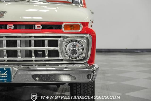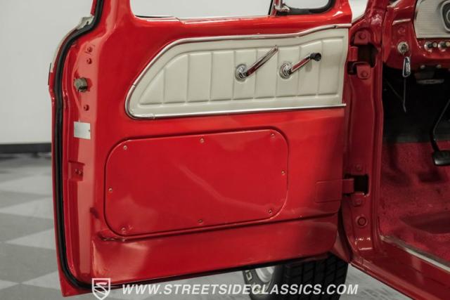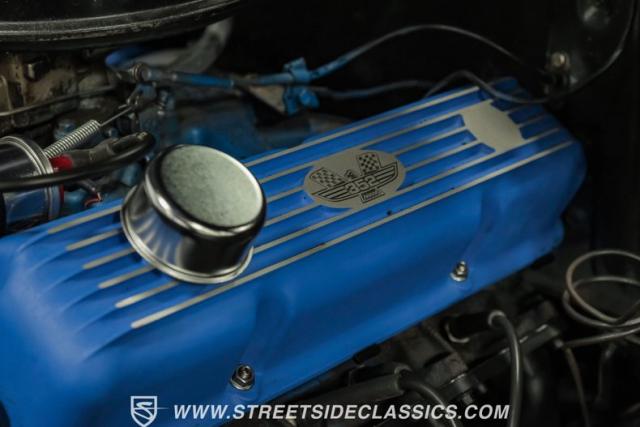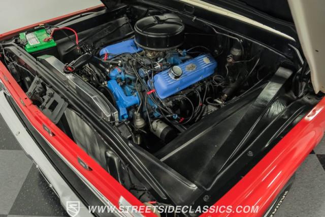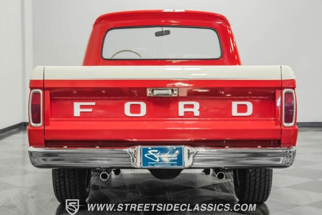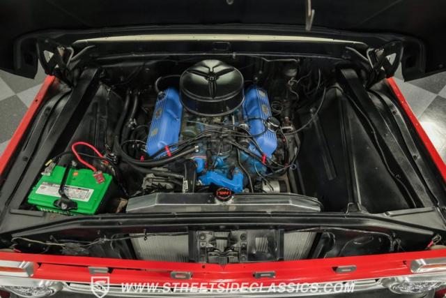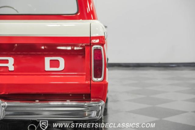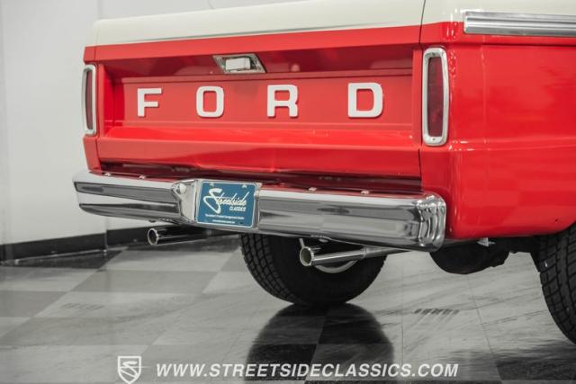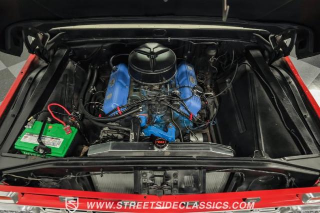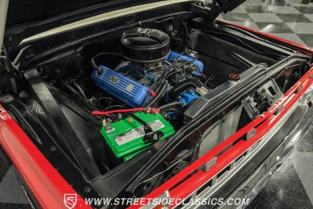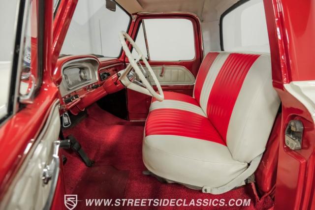 A 352 V8 engine powers this F-100, paired with a 3-speed manual transmission for an engaging driving experience. The engine bay features stylish valve covers, adding visual appeal to the functional space. An aluminum radiator keeps the engine running cool in all conditions. The dual exhaust system, equipped with Thrush mufflers and long tube headers, produces a satisfying sound. The truck\'s Twin I-Beam front suspension and solid axle rear with leaf springs and shocks offer a blend of classic ride quality and capability. Drum brakes on all four corners provide stopping power, while the 10-bolt rear axle ensures durability for whatever tasks you have in mind.