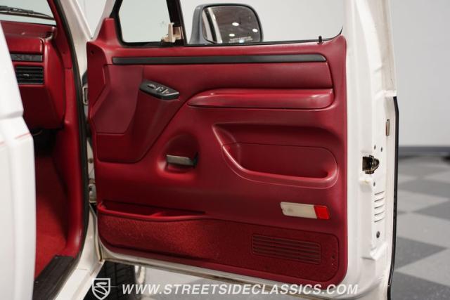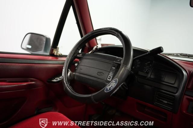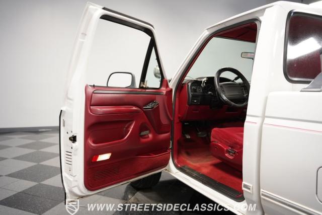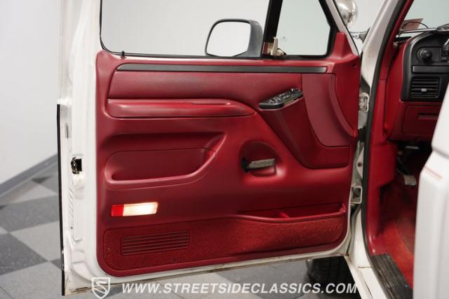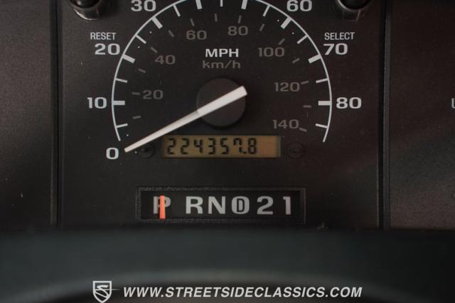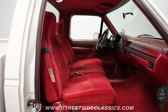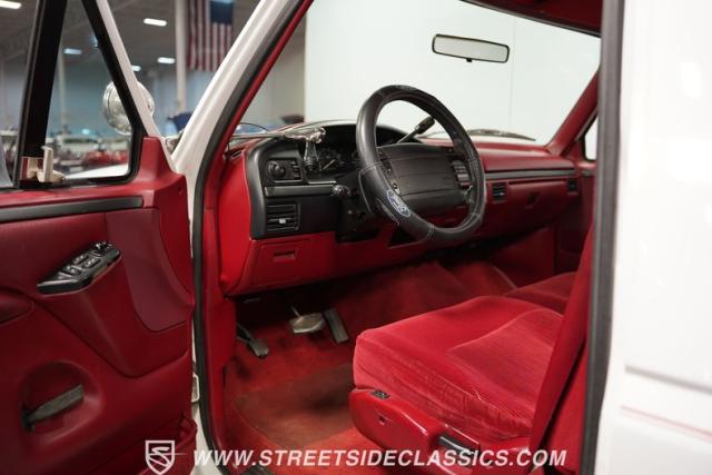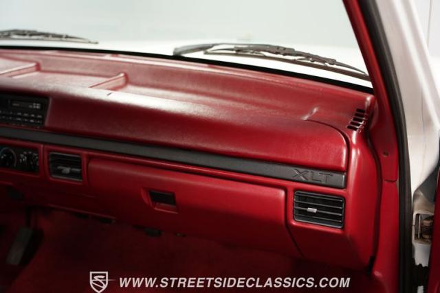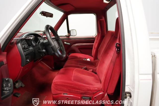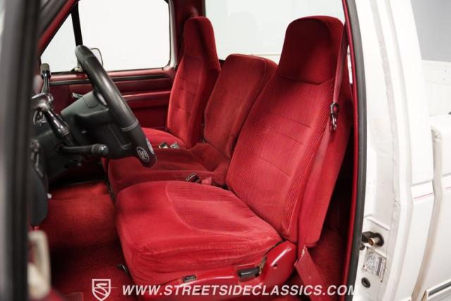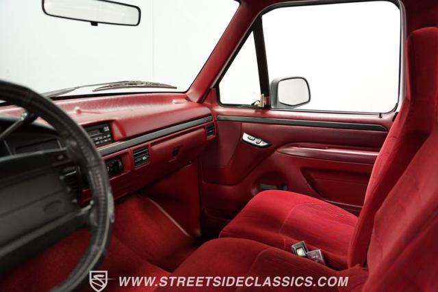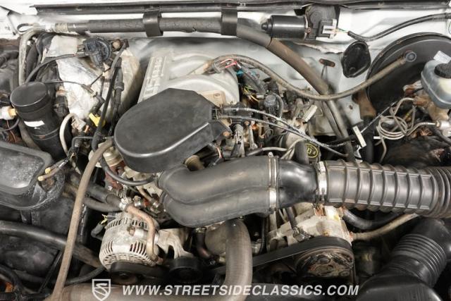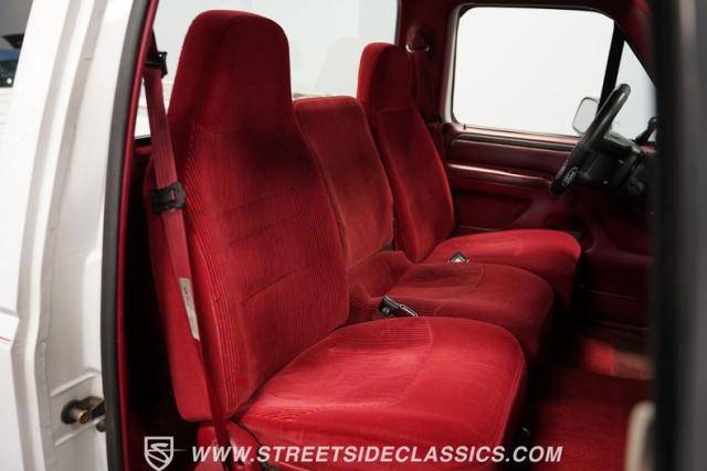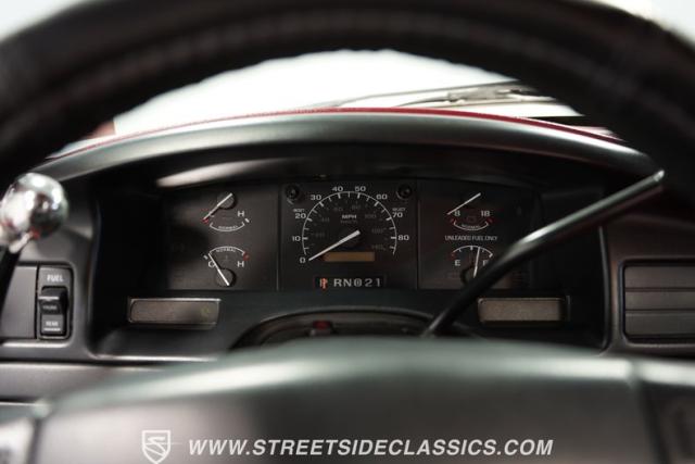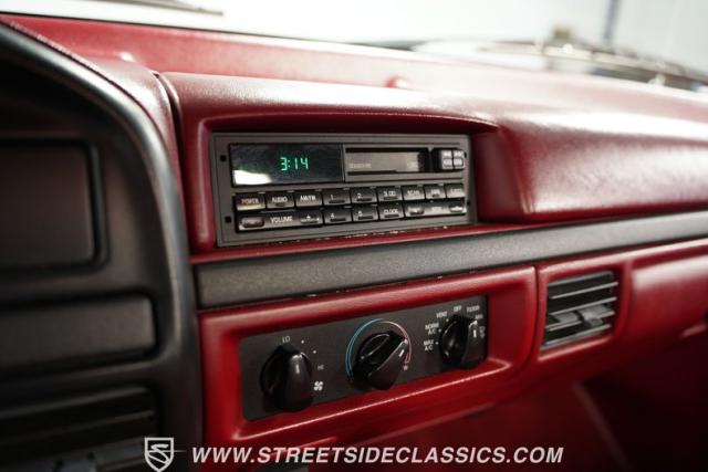 Inside, we find a clean OE red cloth interior featuring a 70/30 bench seat, AM/FM radio cassette player, power steering, locks, windows, and mirrors, as well as air conditioning and cruise control to add a little modern convenience to any trip to or from the home improvement store, or the farm.