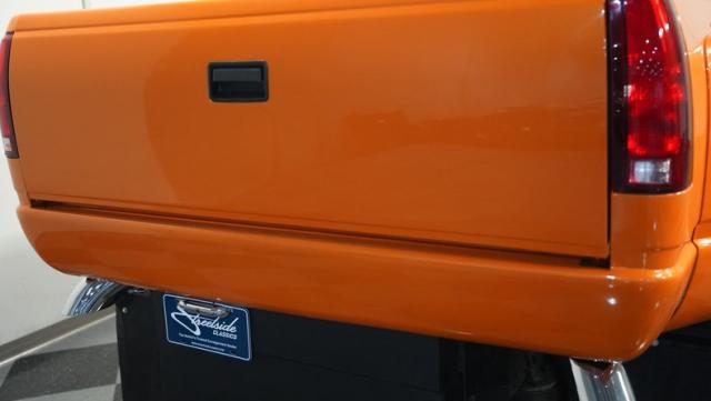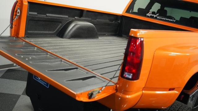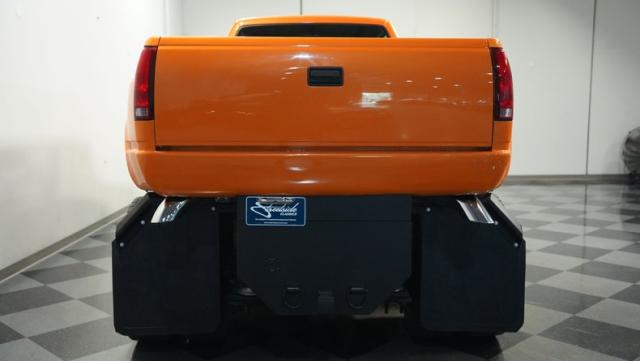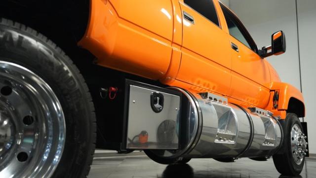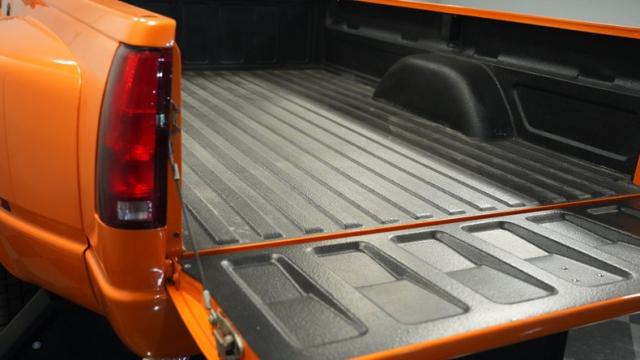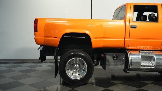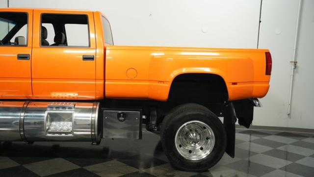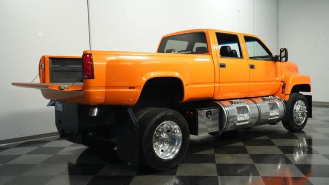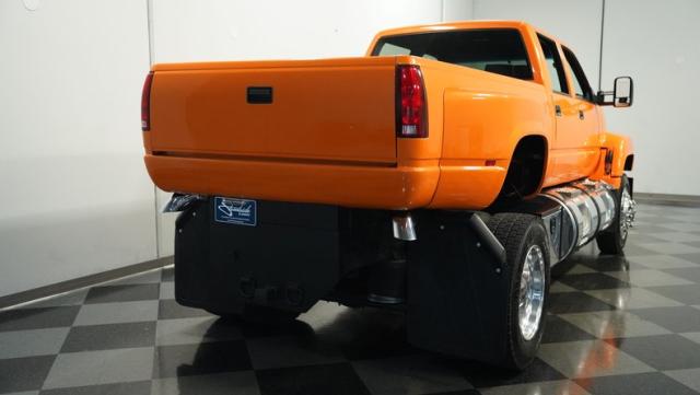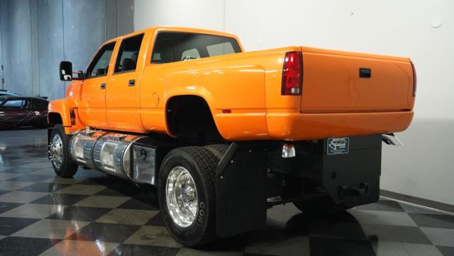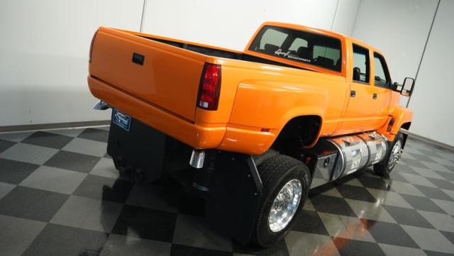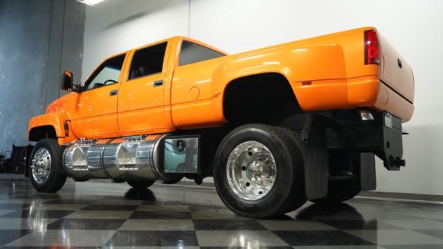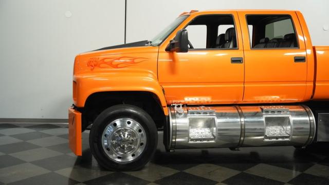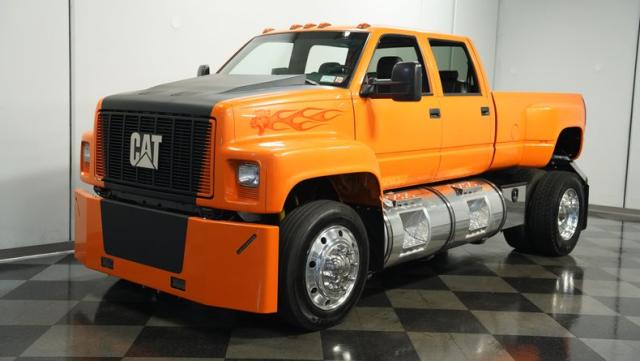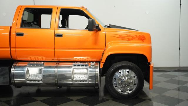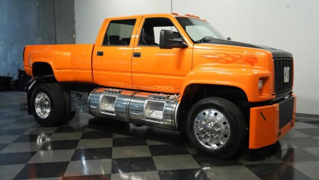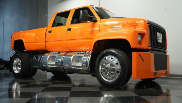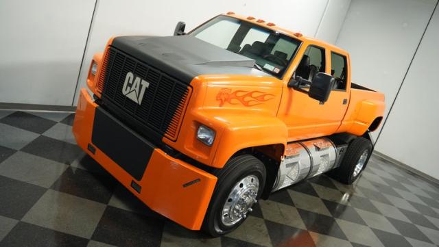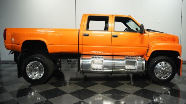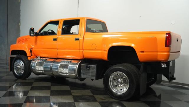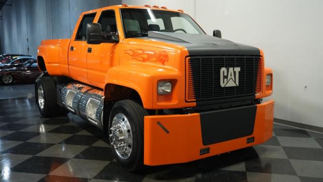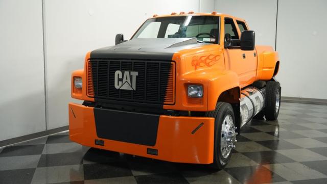 This 1993 GMC TopKick C7500 is a custom-built powerhouse that stands out from the crowd. Shortened by 10 feet and outfitted with a dually body, this TopKick is truly one-of-a-kind. The Lamborghini Orange Pearl Clearcoat paint, expertly applied by Kolorcraft, is accented by matte black CAT graphics, courtesy of John Williams. Rolling on polished 22.50\" Alcoa wheels wrapped in 255/70R22.5 front and 275/70R22.5 rear tires, this truck makes a bold statement wherever it goes.