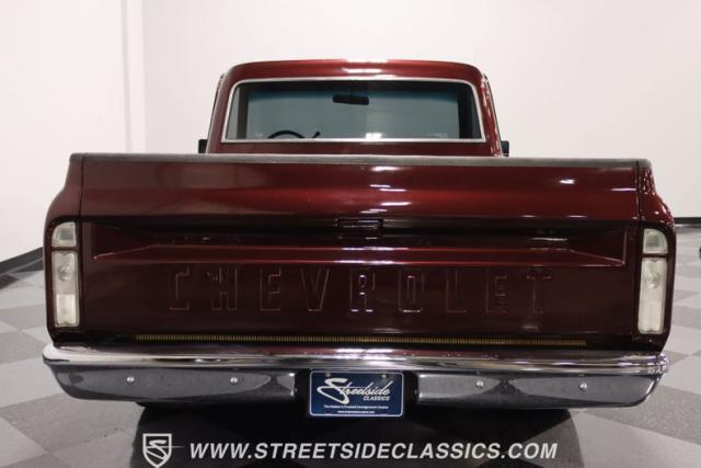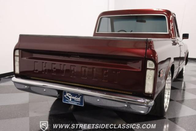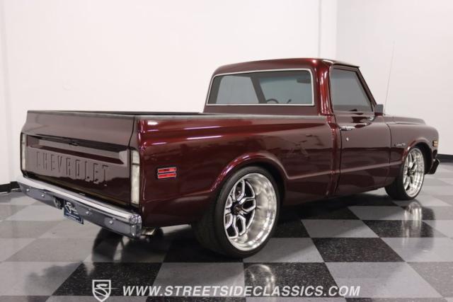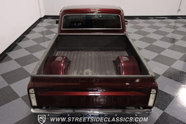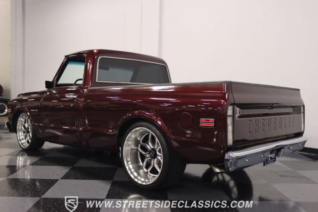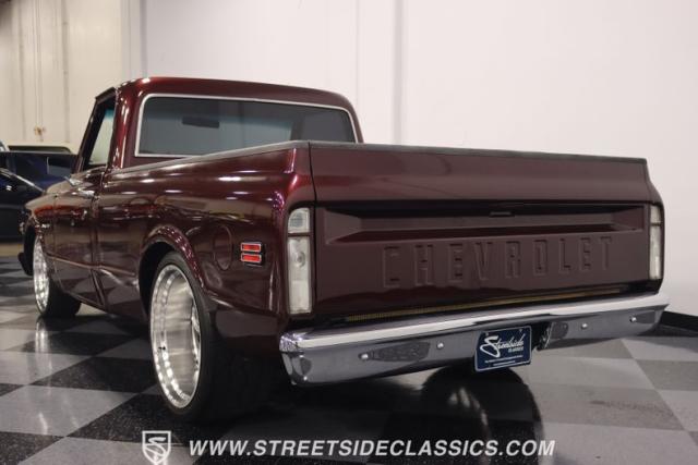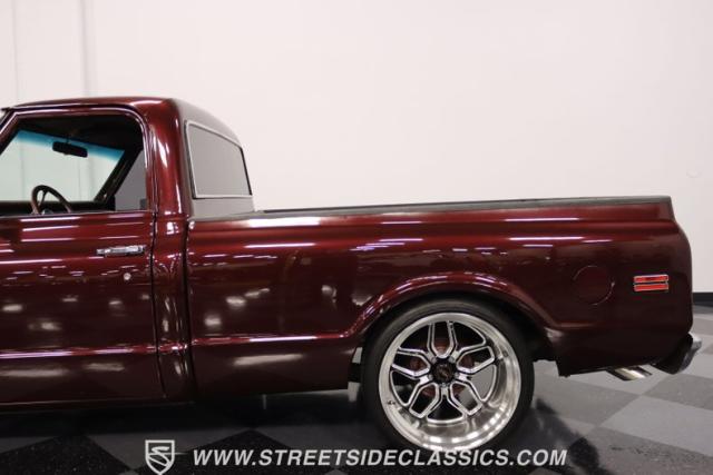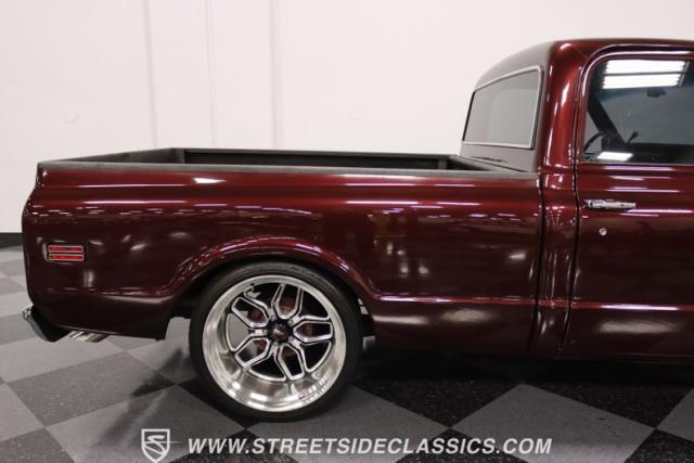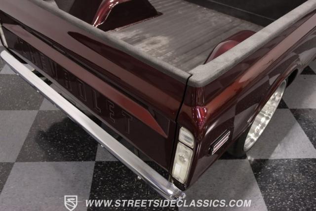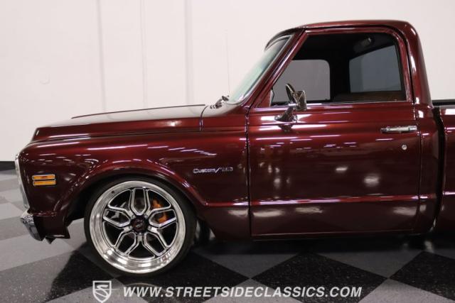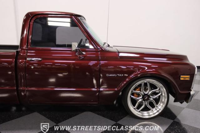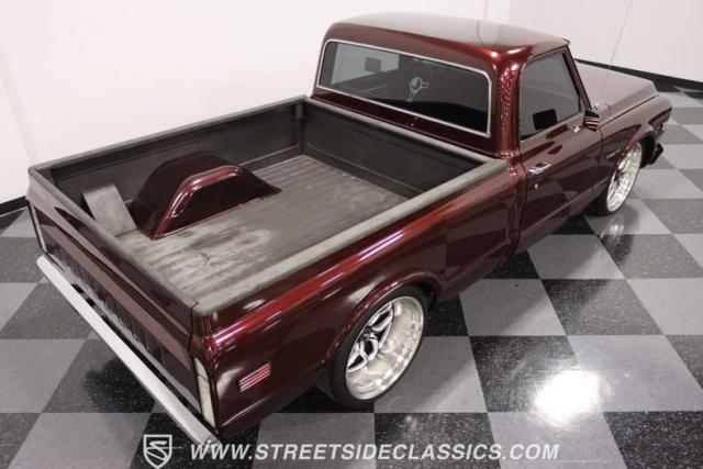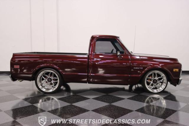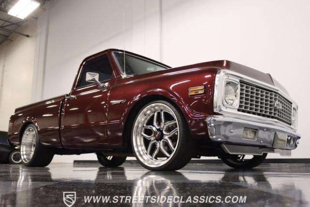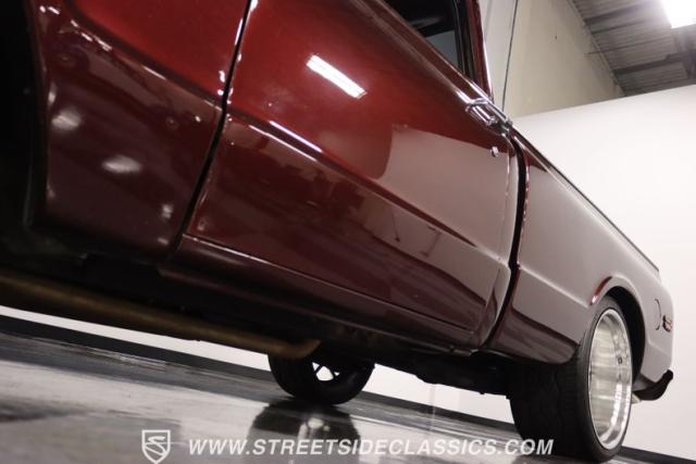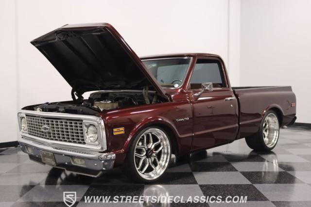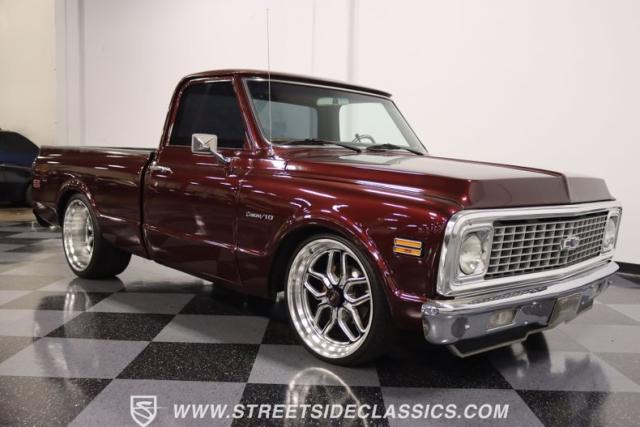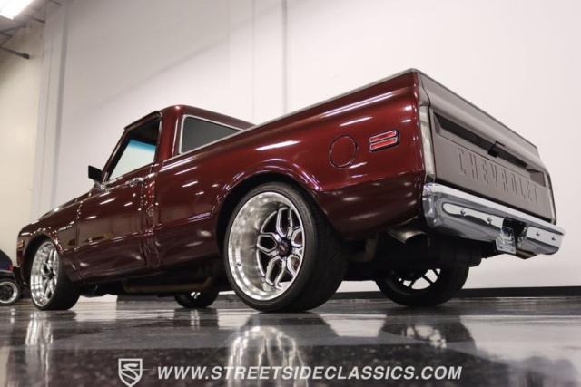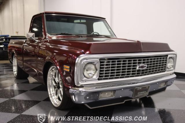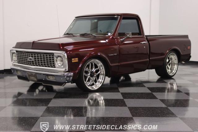 This Candy Wine 1972 Chevrolet C10 is ready to stand out with a ground-hugging stance thanks to its Western Chassis suspension and a custom front splitter. Those massive 22-inch Weld wheels, wrapped in fresh Atlas rubber up front and grippy Nitto tires in the back, tell you it\'s not just about lookin\' good. Custom touches like the upgraded glass with vent window delete, clear rear lenses, and tinted windows refine the look and add a hint of modern style to this classic pickup. And just to be sure it stands out, that bed\'s lined with tough Rhino liner, ready for whatever you throw at it.