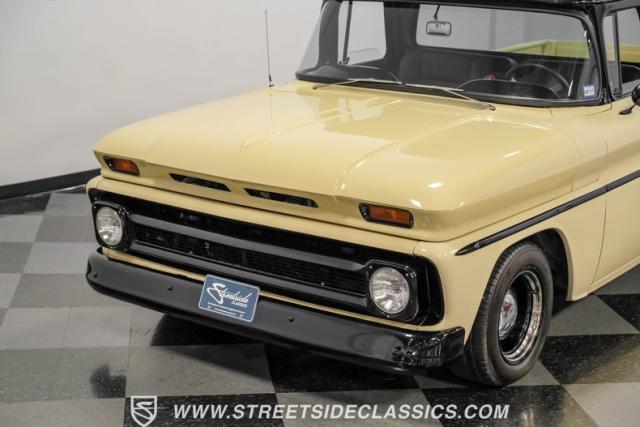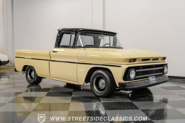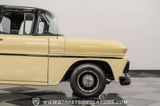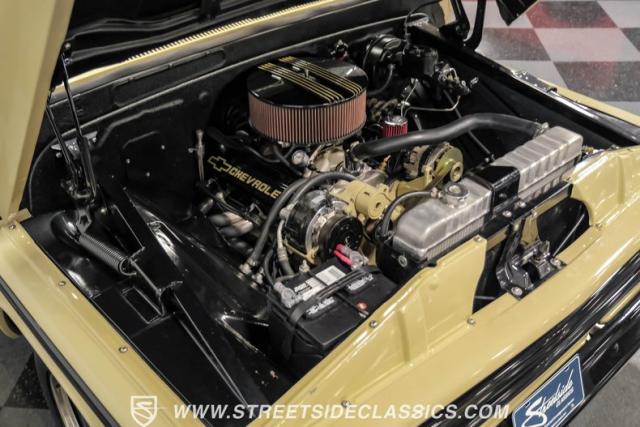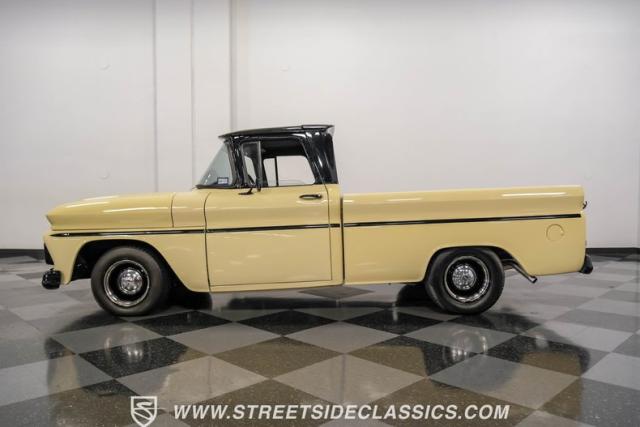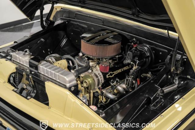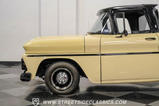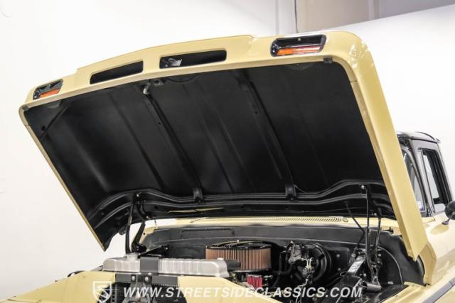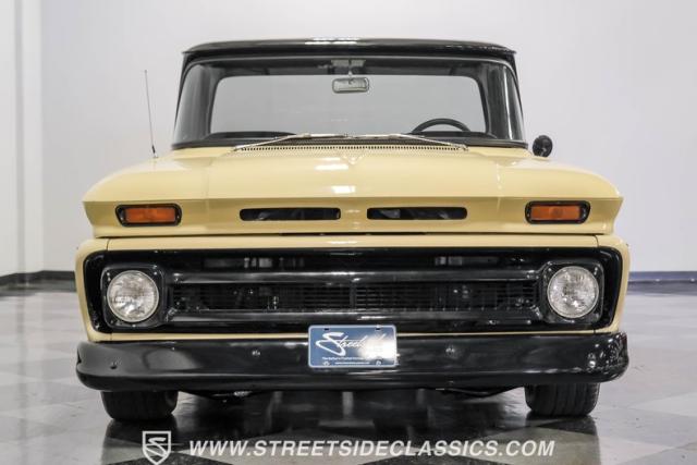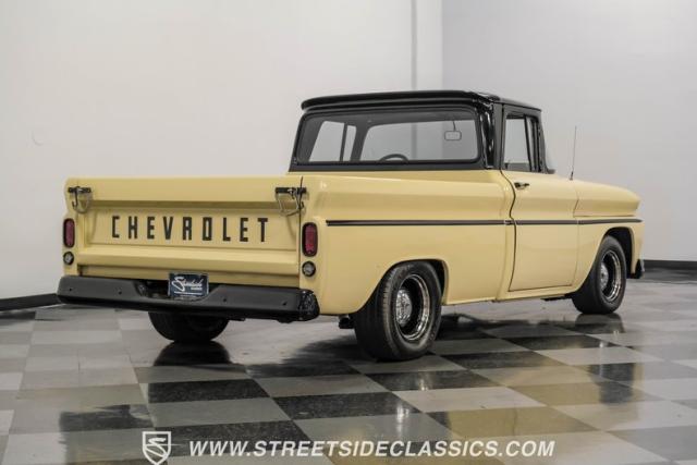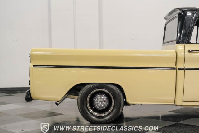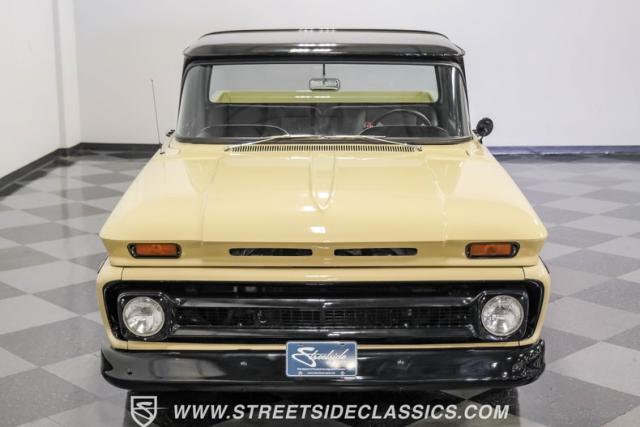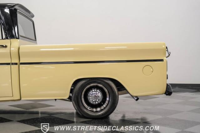 This 1963 Chevrolet C10 Big Back Window is a desert storm on wheels. Its Desert Sand exterior paired with black accents creates a striking contrast that commands respect. The lowered stance, riding on 15\" wheels wrapped in BFGoodrich rubber (225/60R15 front, 255/60R15 rear), gives this classic pickup an aggressive profile. Custom touches like the 1964 grille and streamlined side trim elevate its visual appeal, while the stained wood bed adds a touch of vintage class.