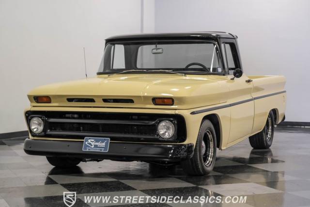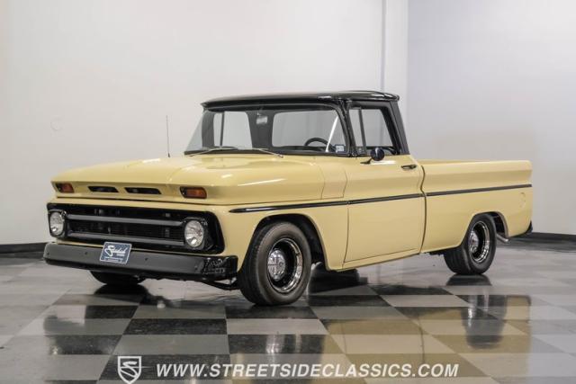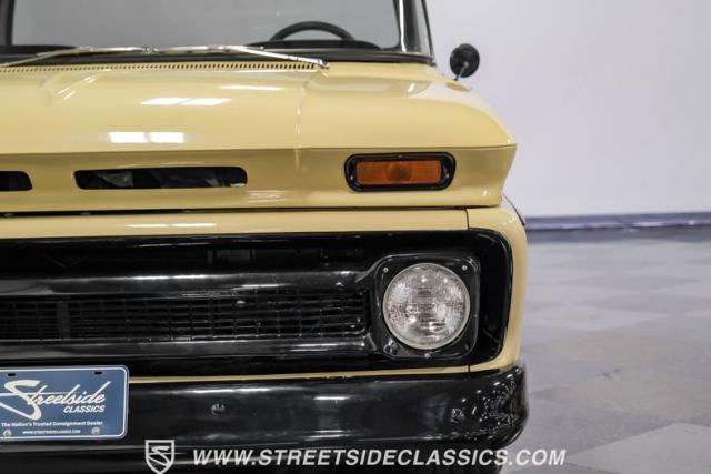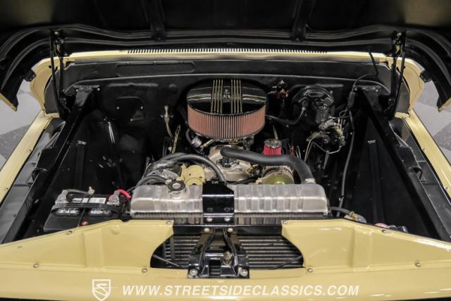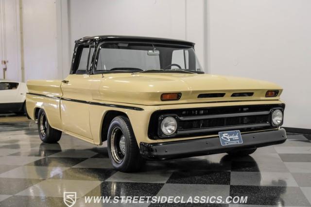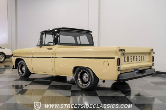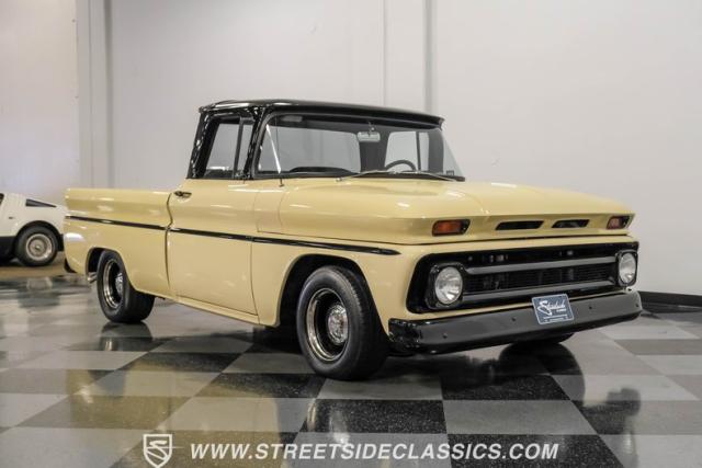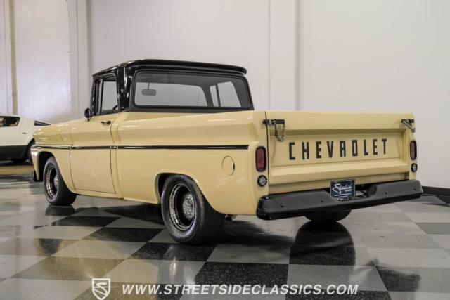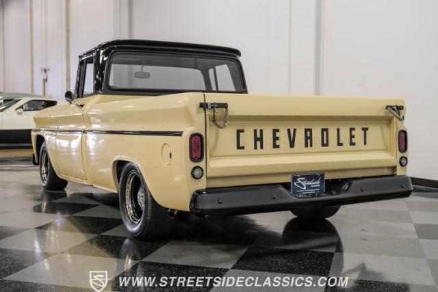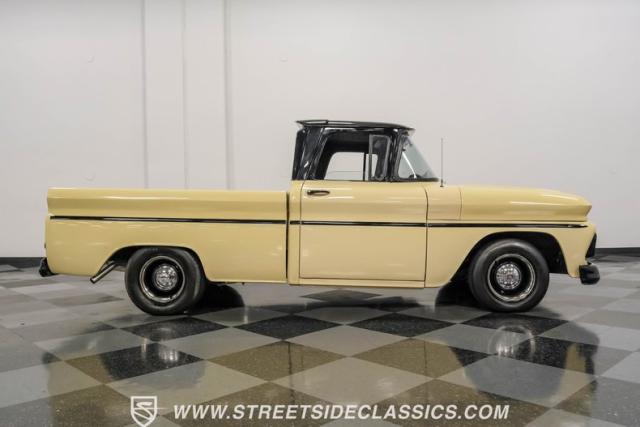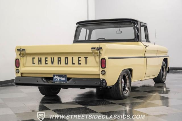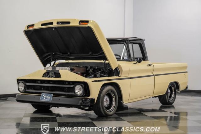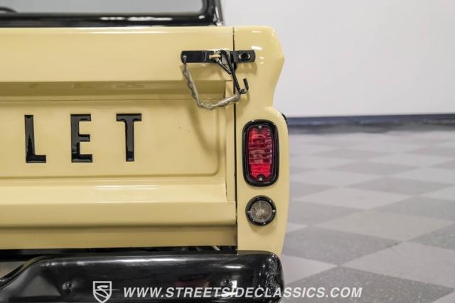 This 1963 Chevrolet C10 Big Back Window is a desert storm on wheels. Its Desert Sand exterior paired with black accents creates a striking contrast that commands respect. The lowered stance, riding on 15\" wheels wrapped in BFGoodrich rubber (225/60R15 front, 255/60R15 rear), gives this classic pickup an aggressive profile. Custom touches like the 1964 grille and streamlined side trim elevate its visual appeal, while the stained wood bed adds a touch of vintage class.