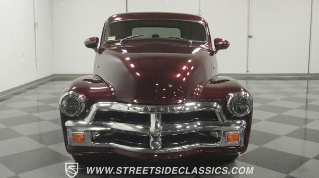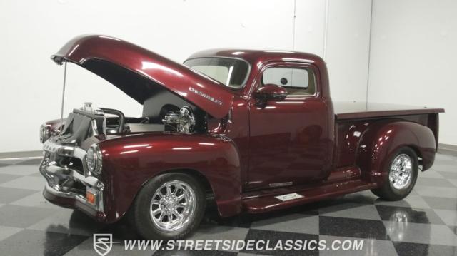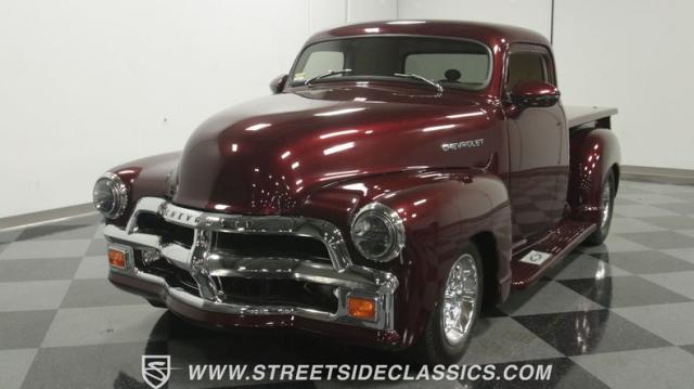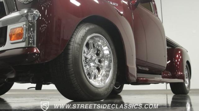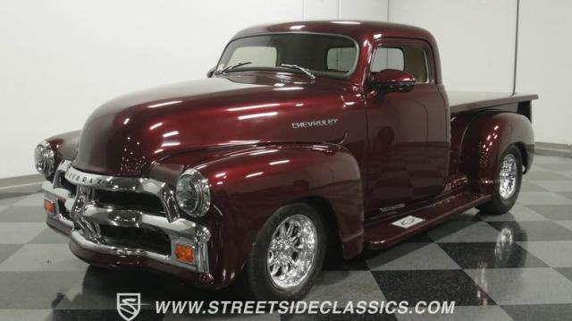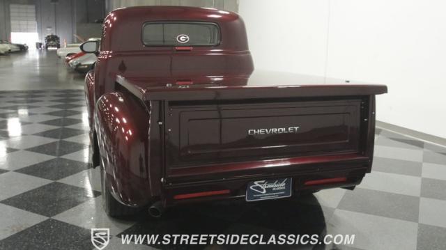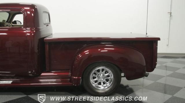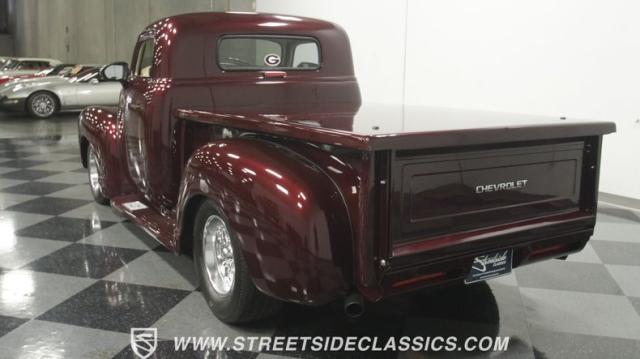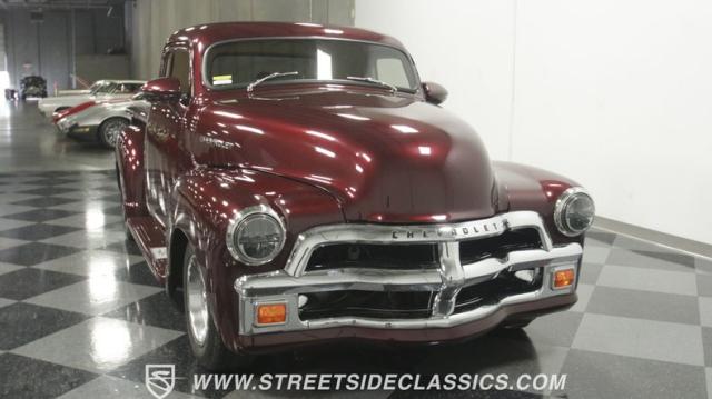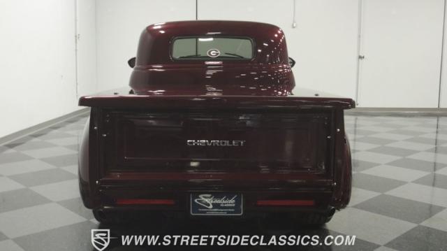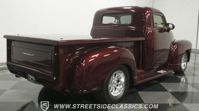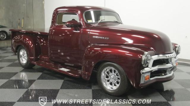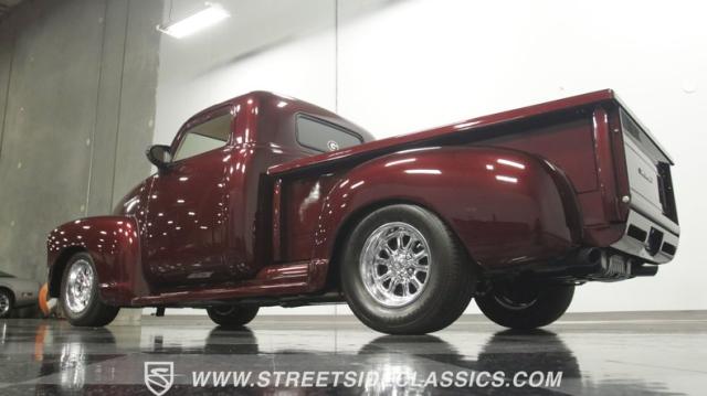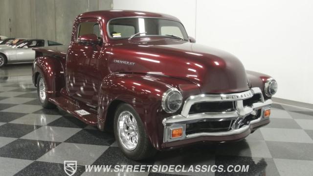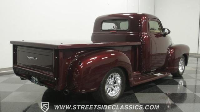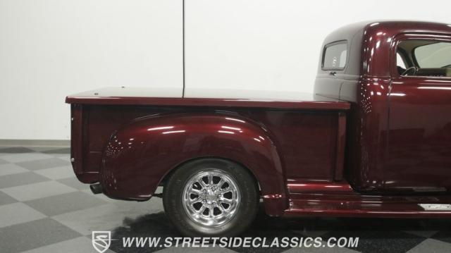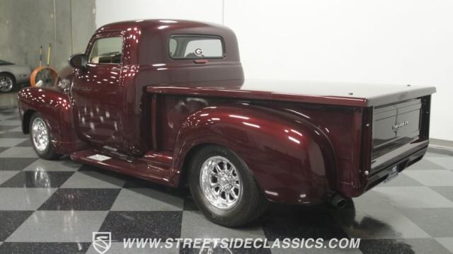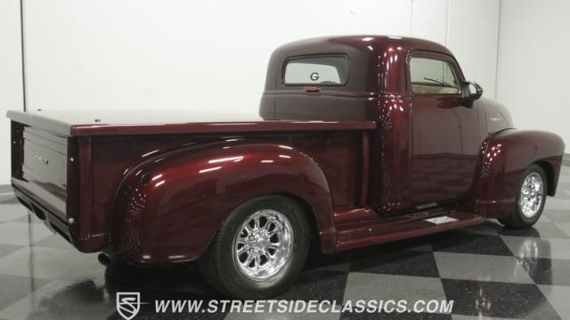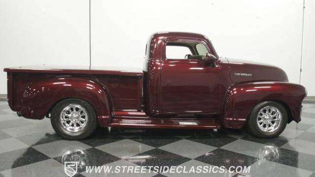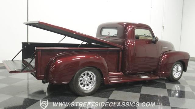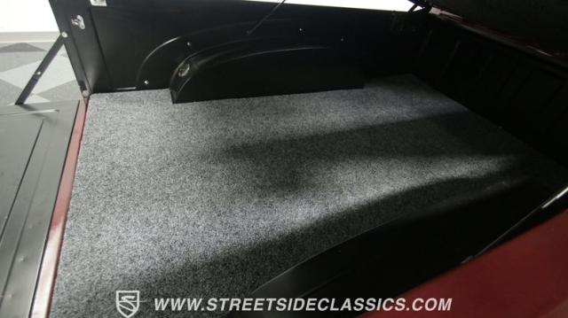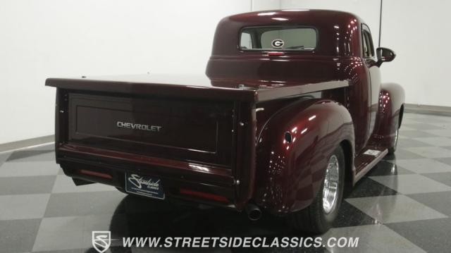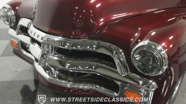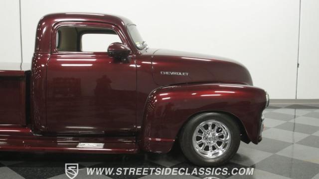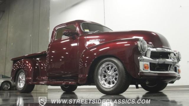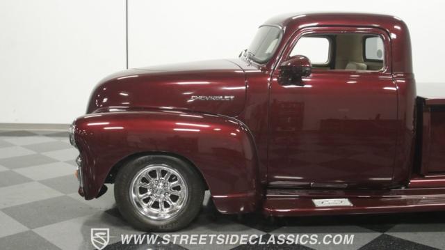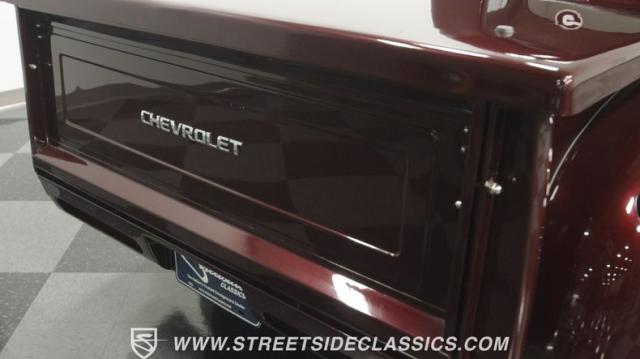 The first half of 1955 was the last hurrah of the uber-popular Advance-Design pickups (aka known as the 1955 First Series), and they signaled the end of a design era that catapulted Chevrolet to the top of the American carmaker landscape. Although still a utilitarian pickup, GM knew the market wanted a more civilized machine, and the First Series trucks were the first step toward the complete overhaul resulting in the Task Force trucks that came along in the latter half of the year. As a result, customs like this look especially smooth, thanks to their curvaceous fenders, iconic grille, and long hood. This build obviously took some liberties with the original look including a slightly chopped roof, deleted bumpers fore and aft, and a color-matched bed-top in the back but they aren\'t so radical that the original 3100 design is completely forgotten. Other cool tricks include frenched antennae, late-model side mirrors, and shaved door handles, and all the custom paint and bodywork was done to a very high standard to the tune of $35K in labor alone. Getting attention has never been difficult for Chevy\'s Advanced-Design trucks, but the gleaming Royal Crimson paint on this 3-Window will have folks stopping in their tracks. Painted just a year-and-a-half ago, the vibrant dark cherry/burgundy shade was borrowed from the 2018 Ford Mustang color chart and looks so fresh that you\'ll be tempted to touch it to see if it\'s still wet. It was finished to a top-end, driver-quality standard that most would consider show-ready, with an incredible depth of clarity, consistent uniformity, and an amazing shine from the deep layers of clearcoat that almost make you avert your eyes under direct sunlight. It\'s not perfect, but you really have to strain hard to find any minor imperfections worth complaining about. Other than the chrome grille and headlight surrounds, all the original trim and badging was removed, replaced with modern CHEVROLET block letters on the hood and tailgate. Out back, the rear bumper was swapped out for an LED-imbedded roll pan, and the tailgate and bed cover above it was smoothed and painted to match the body. Inside that bed you\'ll find everything was finished to maximum standards as well, with a heavy-duty mat protecting the floor, blacked-out walls and fenders, and a relocated gas tank with a flush-mounted fuel cap.