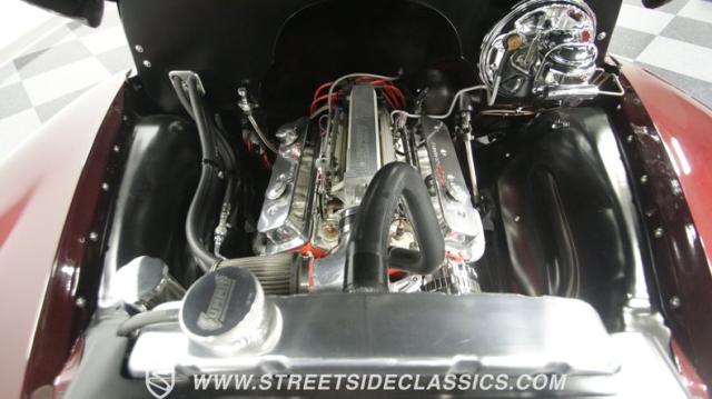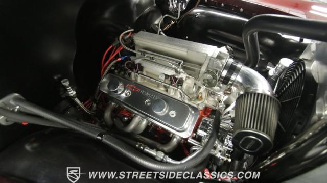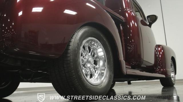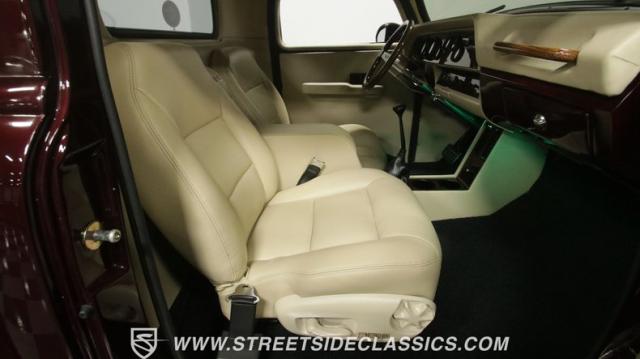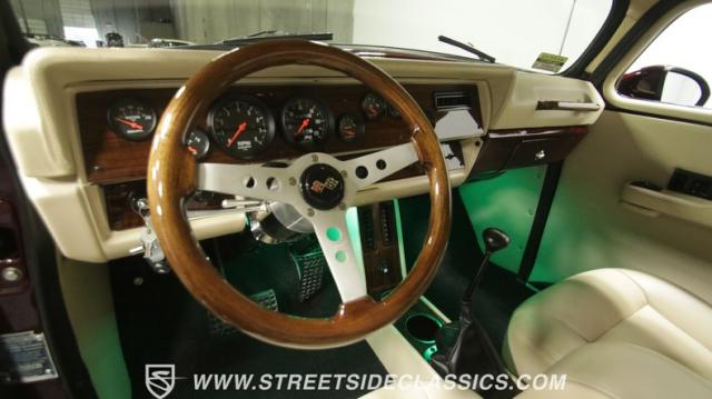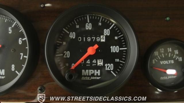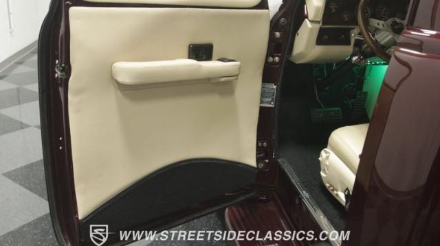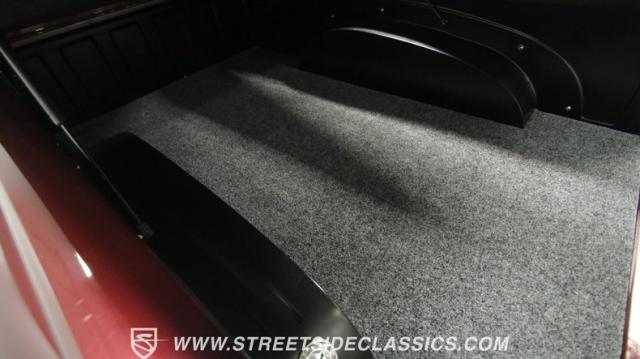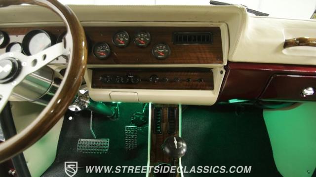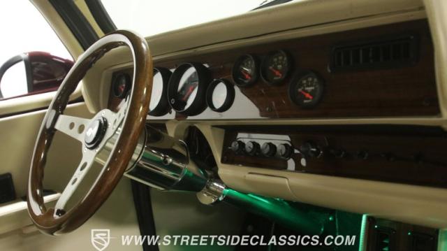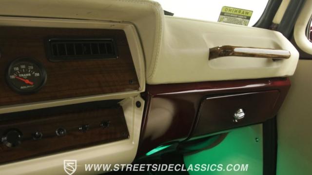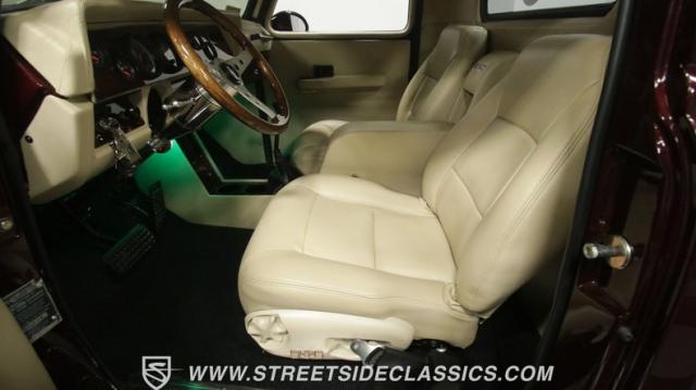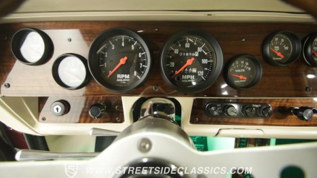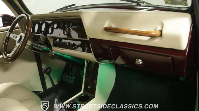 Things get even better inside, where a pair of late-model bucket seats (out of a Dodge Dakota) wrapped in custom leather hides and a custom center console take the place of the original bench this truck was likely born with. There\'s more of that, soft tan leather on the flanking door panels and intricately wrapped custom dash, and even the kick panels were upholstered for a finished look. Plush black carpets contrast the light hides perfectly and were a practical addition to keep things looking clean inside, while the tan headliner continues behind the seats, wrapping the entire cabin in upscale leather. The dash was completely reworked and punctuated with gorgeous woodgrain trim that also adorns the center console, dash grab bar, and the rim of the sporty tilt steering wheel at the helm of the cockpit. Beyond that wheel is a full complement of AutoMeter dials that keep an eye on the engine, along with a row of accessory dials/switches, and controls for the Vintage Air A/C system. That aforementioned dash houses A/C vents, cup holders, and a Lokar-style shifter that manages the 700R4 automatic below. LED interior lighting, seatbelts, a billet tilt steering column, power windows, and remote door poppers round out the options list, and even the pedal were upgraded to super-cool aftermarket units. Nothing was overlooked inside, and the result is an awesome cabin you\'re going to want to spend a ton of time in.