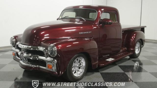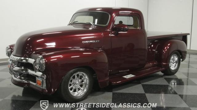 You can sum up this 1955 Chevrolet 3100 3-Window pickup in just one word: BRILLIANT. Glowing, miles-deep, lustrous Royal Crimson paint with hints of metallic and pearlescence inside, deleted bumpers and a custom-finished bed, a luxurious leather and A/C interior, and a thumping 350 Ram Jet V8 crate motor under the hood give this hauler the all the right credentials. Based on looks alone, it easily qualifies as one of the slickest trucks we\'ve featured at Streetside in years, but it\'s also got all the right performance hardware to back it up.