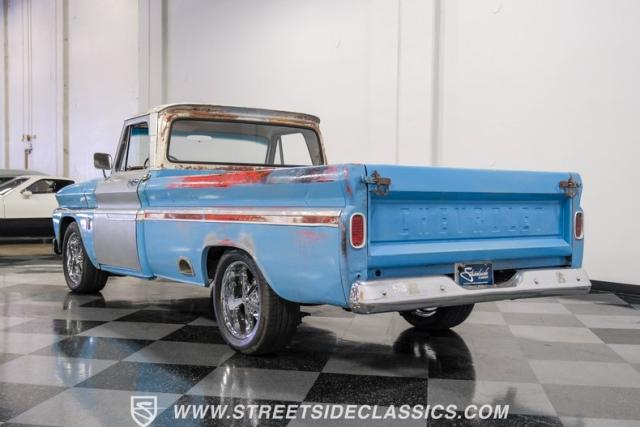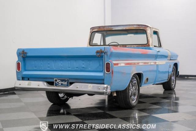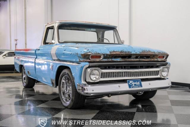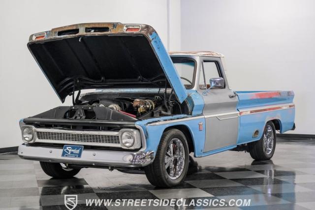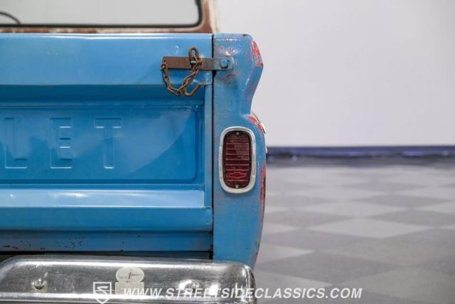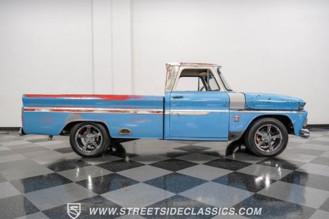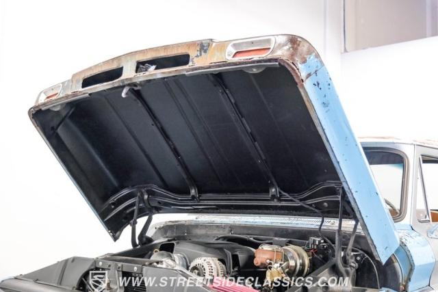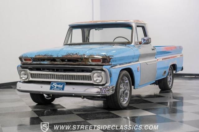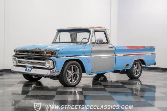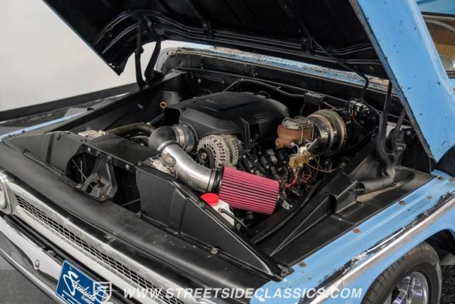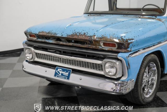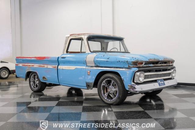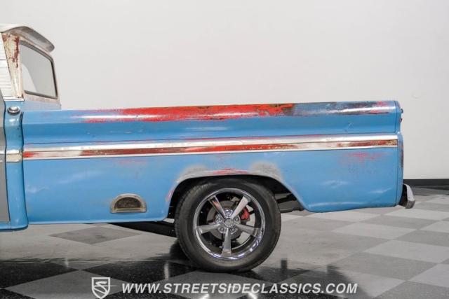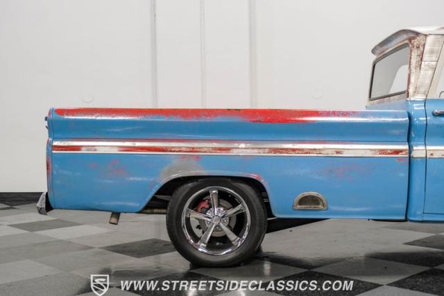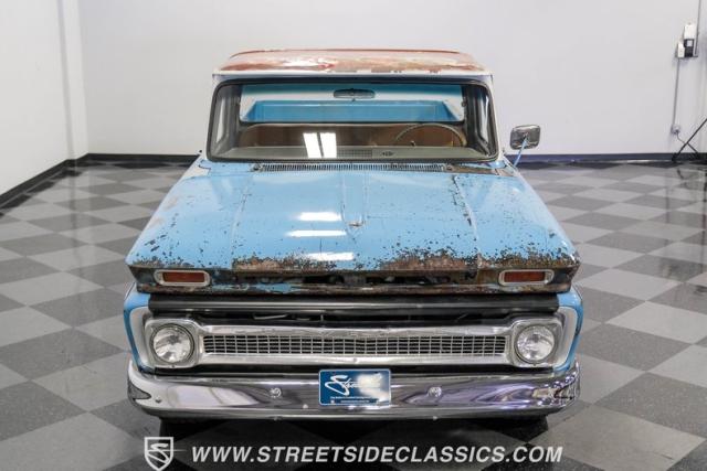 This \'64 Chevy C10 showcases a gritty fusion of vintage patina and modern performance. Dressed in its original patina blue with a clear coat, carries a sense of rugged history. The body sits on 18\" American Racing wheels wrapped in 255/55R18 Michelin tires, offering both style and grip. Power disc brakes on all four corners and a Ground Force lowering kit provide modern performance touches to this vintage icon. Chrome trim adds a touch of shine to its time-worn exterior, blending the old with the new seamlessly.