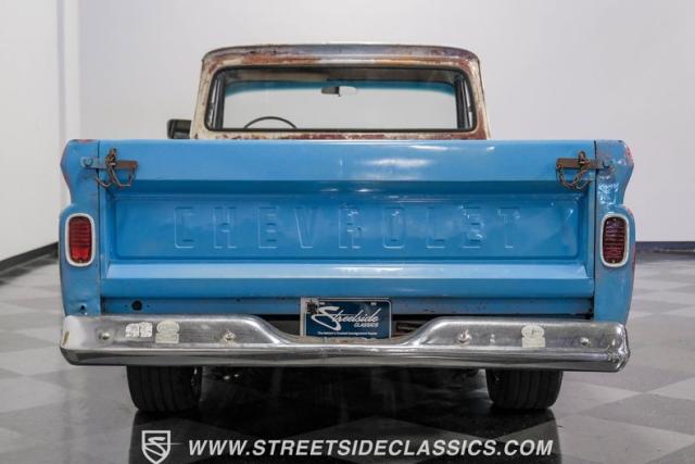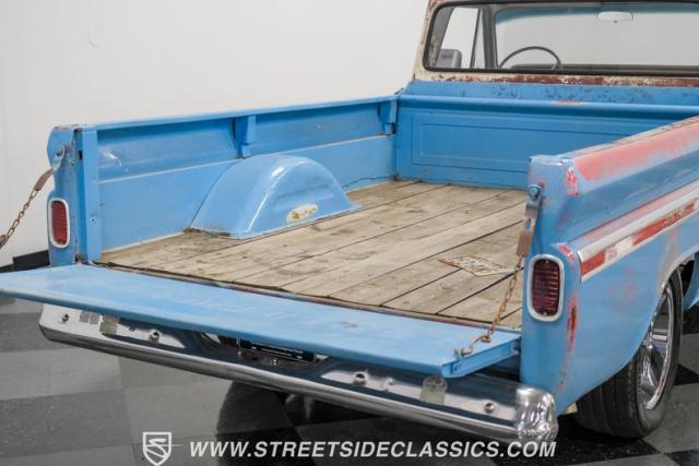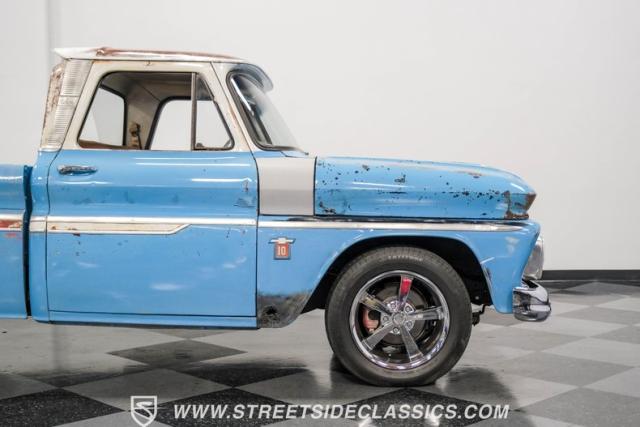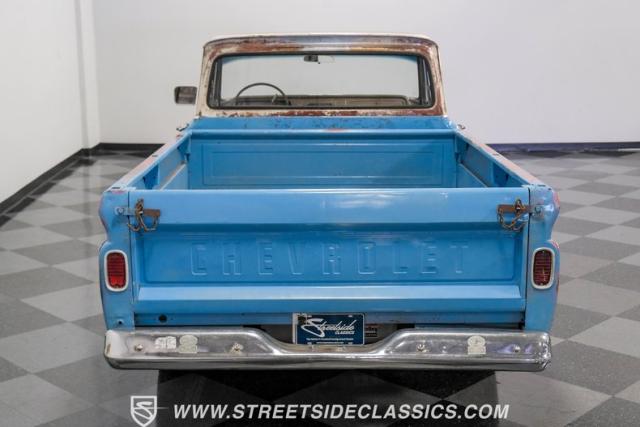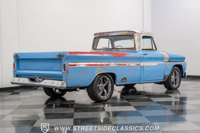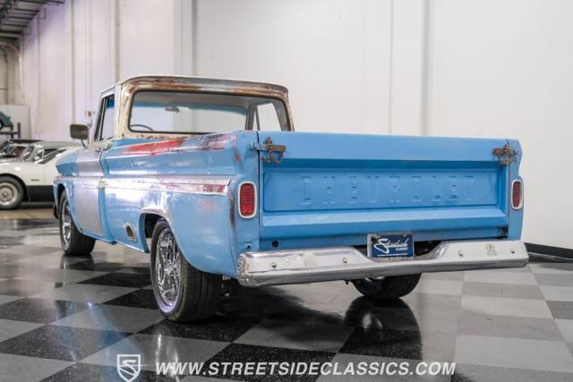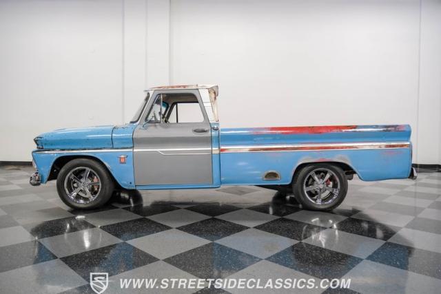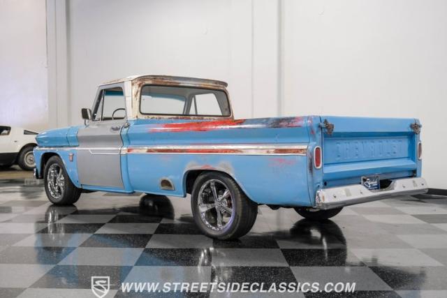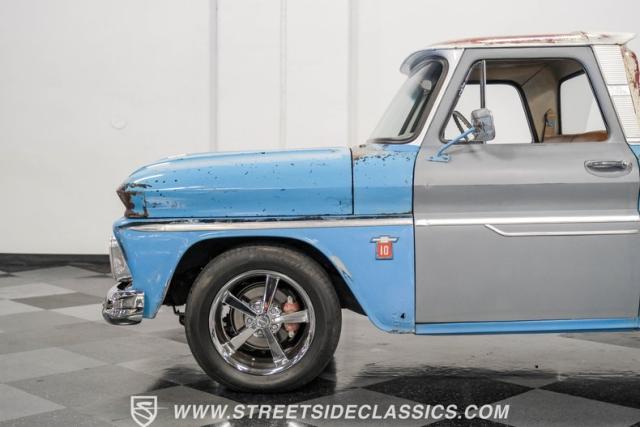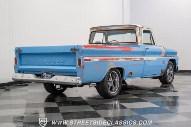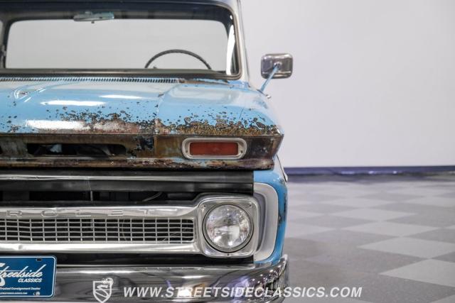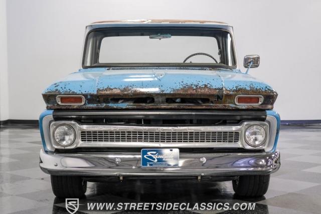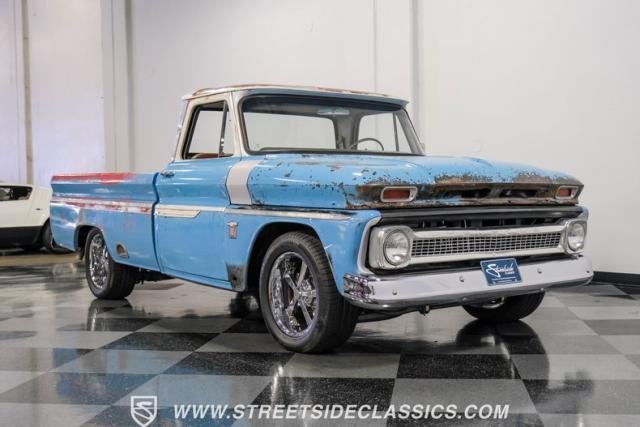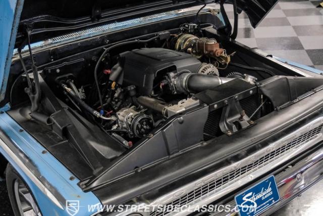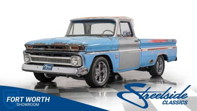 This \'64 Chevy C10 showcases a gritty fusion of vintage patina and modern performance. Dressed in its original patina blue with a clear coat, carries a sense of rugged history. The body sits on 18\" American Racing wheels wrapped in 255/55R18 Michelin tires, offering both style and grip. Power disc brakes on all four corners and a Ground Force lowering kit provide modern performance touches to this vintage icon. Chrome trim adds a touch of shine to its time-worn exterior, blending the old with the new seamlessly.
